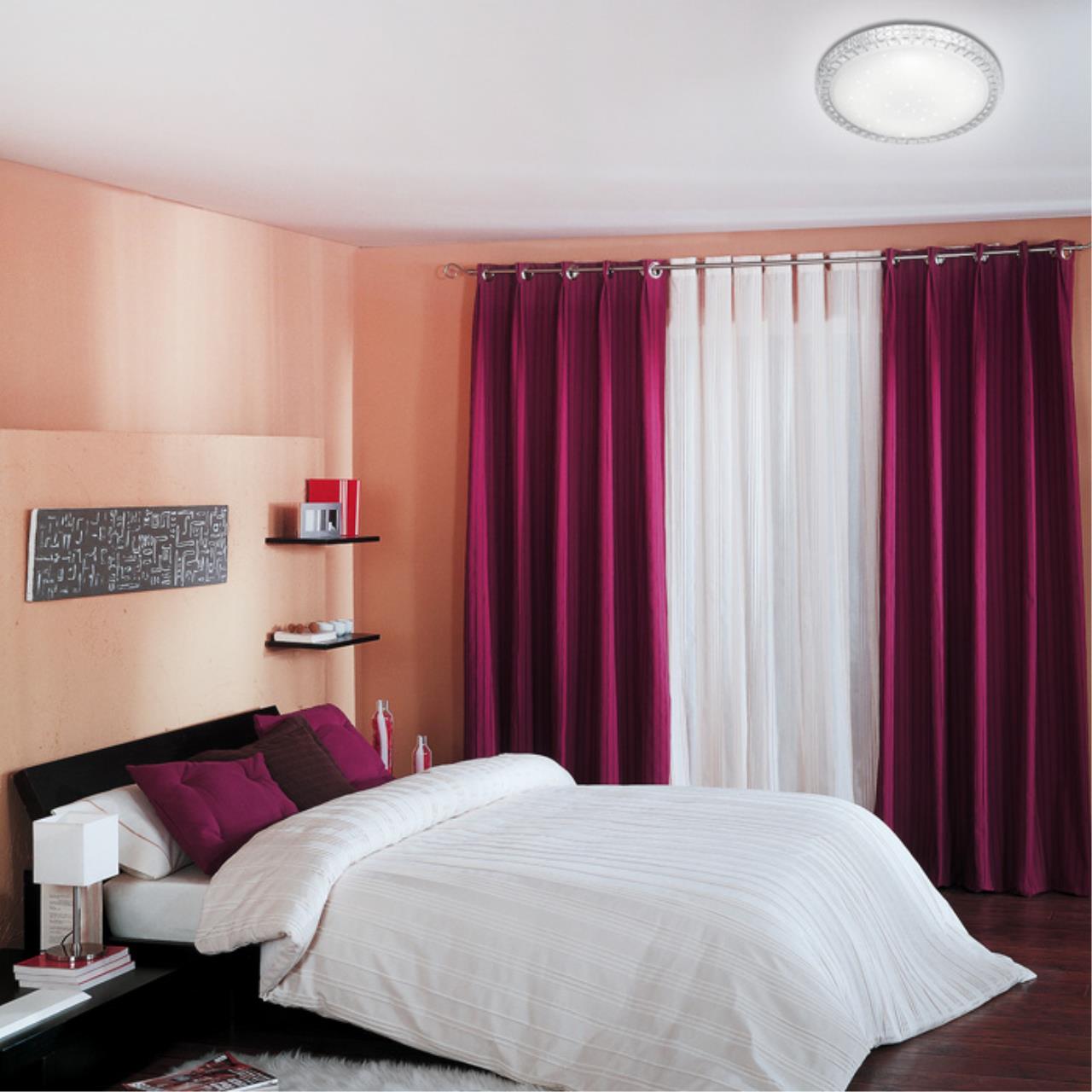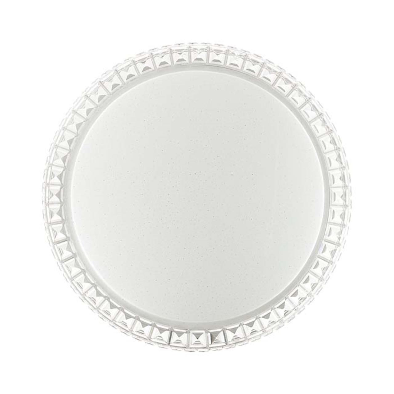 Светильник 2036/EL линии BRISA состоит из металлического основания (базы) и пластикового рассеивателя. Материал рассеивателя — высококачественный акрил белого цвета с глянцевой поверхностью, обеспечивающий светильнику равномерное рассеивание и хорошее светопропускание. Форма плафона: круглая, декорирована рисунком в виде прозрачных точек и рельефным ободом, которые придают включенному светильнику красивый эффект «звездного мерцания» и переливания. Степень защиты IP43 позволяет использовать светильник в определенных зонах влажных помещений. В комплект входит заменяемый LED-модуль с линзами мощностью 72 Вт, соответствующийт лампе накаливания 730 Вт, а также пульт ДУ, с помощью которого осуществляется плавное изменение цветовой температуры в диапазоне 3000—6300 К, изменение яркости, переход в режим переключения теплого/белого/холодного/ночного света. Светильник имеет функцию памяти.