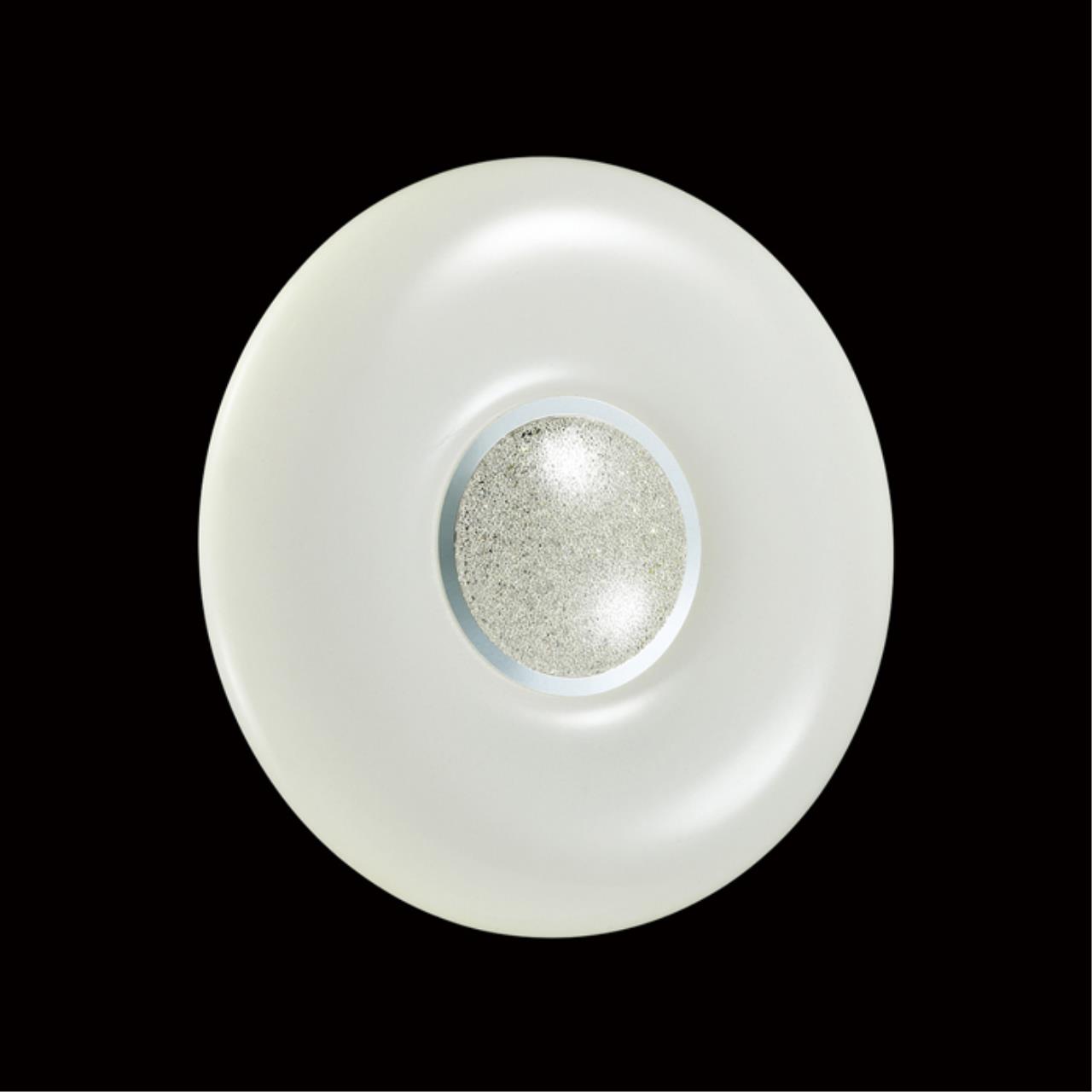 Светильник 2074/DL линии LAZANA состоит из металлического основания (базы) и пластикового рассеивателя. Материал рассеивателя — высококачественный акрил белого матового цвета, обеспечивающий светильнику равномерное рассеивание и хорошее светопропускание. Форма плафона: круглая, декорирована центральным кантом цвета хром и вставкой с пластиковой крошкой, которая придает включенному светильнику красивый эффект переливания. Степень защиты IP43 позволяет использовать светильник в определенных зонах влажных помещений. В комплект входит заменяемый LED-модуль с линзами мощностью 48 Вт, соответствующей лампе накаливания 430 Вт, а также пульт ДУ, с помощью которого осуществляется плавное изменение цветовой температуры 3000—6300 К, изменение яркости, переход в режим переключения теплого/белого/холодного/ночного света. Светильник имеет функцию памяти.