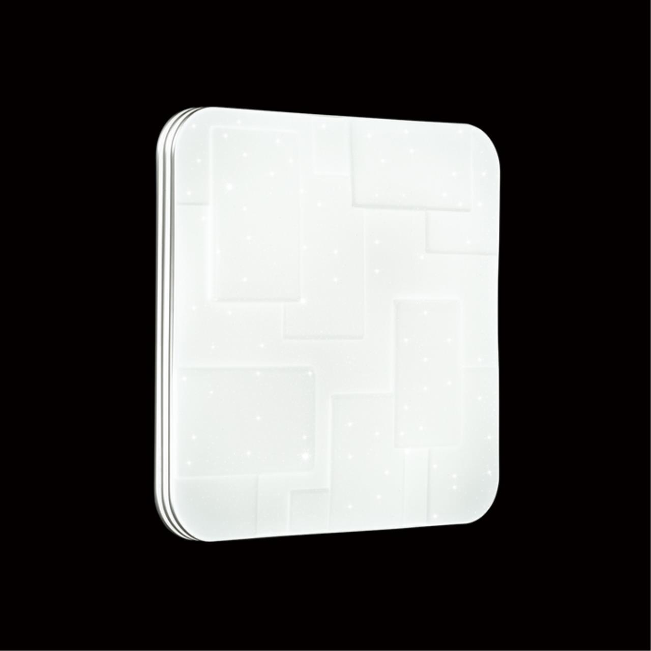 Светильник 2085/DLN линии NORES состоит из металлического основания (базы) и пластикового рассеивателя. Материал рассеивателя — высококачественный акрил белого матового цвета, обеспечивающий светильнику равномерное рассеивание и хорошее светопропускание. Форма плафона: квадратная, в виде рельефного орнамента с геометрическим рисунком, декорирован прозрачными точками, придающими включенному светильнику красивый эффект «звездного мерцания» и переливания. Степень защиты IP43 позволяет использовать светильник в определенных зонах влажных помещений. В комплект входит LED-модуль с линзами мощностью 48 Вт, соответствующей лампе накаливания 515 Вт, а также переключатель температуры цвета (ССT) на драйвере, с помощью которого осуществляется изменение цветовой температуры 3000/4000/6000 К и переход светильника в режим теплого/белого/холодного света. Для установки необходимого режима рекомендуется использовать удлиненный тонкий предмет типа небольшой отвертки.