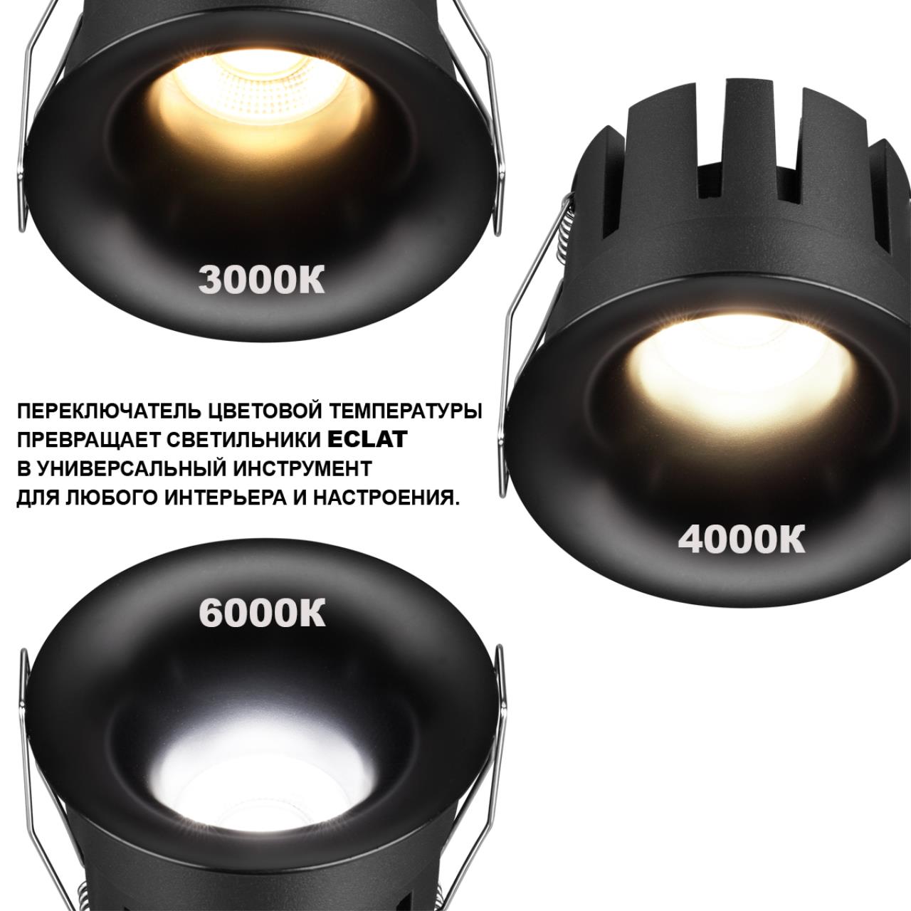 Позвольте представить новую коллекцию встроенных LED-светильников ECLAT от премиум-бренда NOVOTECH™. Эти инновационные устройства гармонично объединяют высокие технологии и утончённый дизайн, наполняя пространство тёплым уютом и комфортом. Функция переключения цветовой температуры (3000K/4000K/6000K), интегрированная прямо в драйвер, позволяет настроить оптимальный световой сценарий для каждой ситуации. Широкий выбор отделки корпусов дополнит любой интерьер: благородный матовый чёрный оттенок подчёркивает изысканность и шарм, классический матовый белый дарит ощущение легкости и свежести. Поверхность светильников покрыта специальной краской с эффектом Soft Touch, создающей приятные ощущения шелковистой гладкости и бархатистости. Коллекция ECLAT станет воплощением совершенства технологий и вдохновения, превратив любое помещение в уникальное пространство, полное комфорта и стиля.