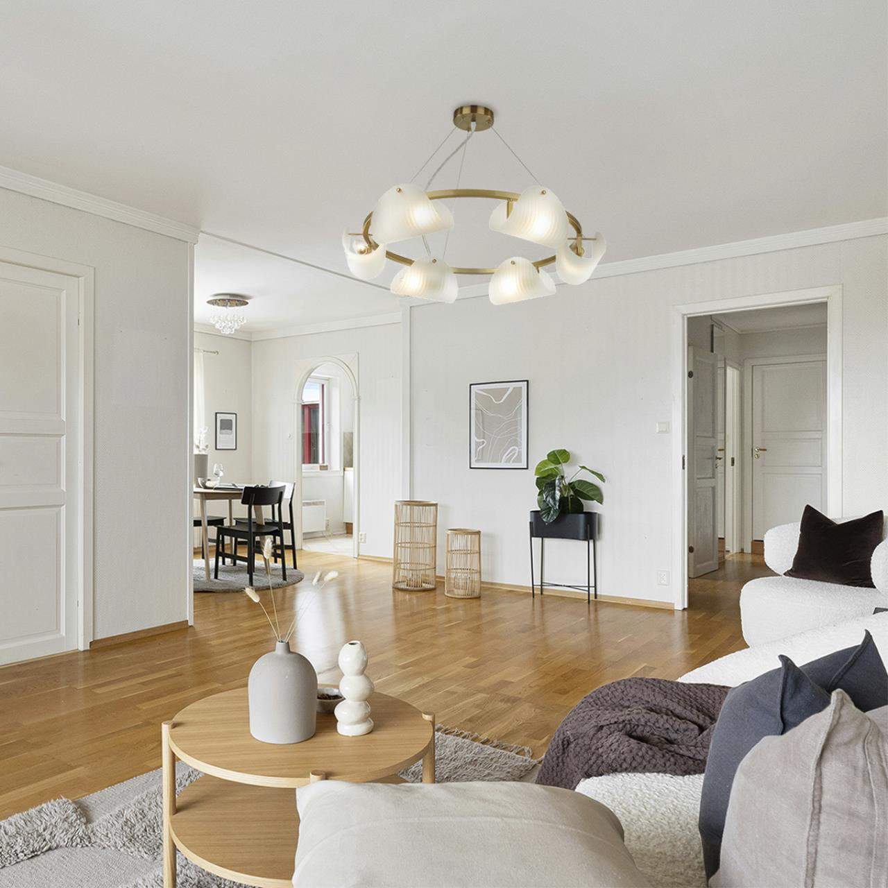 Линия FIORO прекрасно подойдет для интерьеров в классическом и неоклассическом стилях. Светильники оснащены плафонами изогнутой формы из белого матового стекла. Благодаря уникальному дизайну линия выглядит легко и воздушно, что делает ее идеальной для создания уютной атмосферы. Каркас светильников изготовлен из металла медного цвета и представлен в двух вариантах: на 4 лампы в форме прямолинейного светильника, который можно использовать над обеденным столом или барной стойкой и на 6 ламп в форме круга, который осветит гостиную зону. Сочетание обоих светильников обеспечит равномерный свет в больших помещениях, а настенные бра создадут световые акценты в комнатах или прихожих. Идеальное сочетание форм и материалов придает светильникам благородный вид и подчеркивает уникальный стиль линии FIORO.