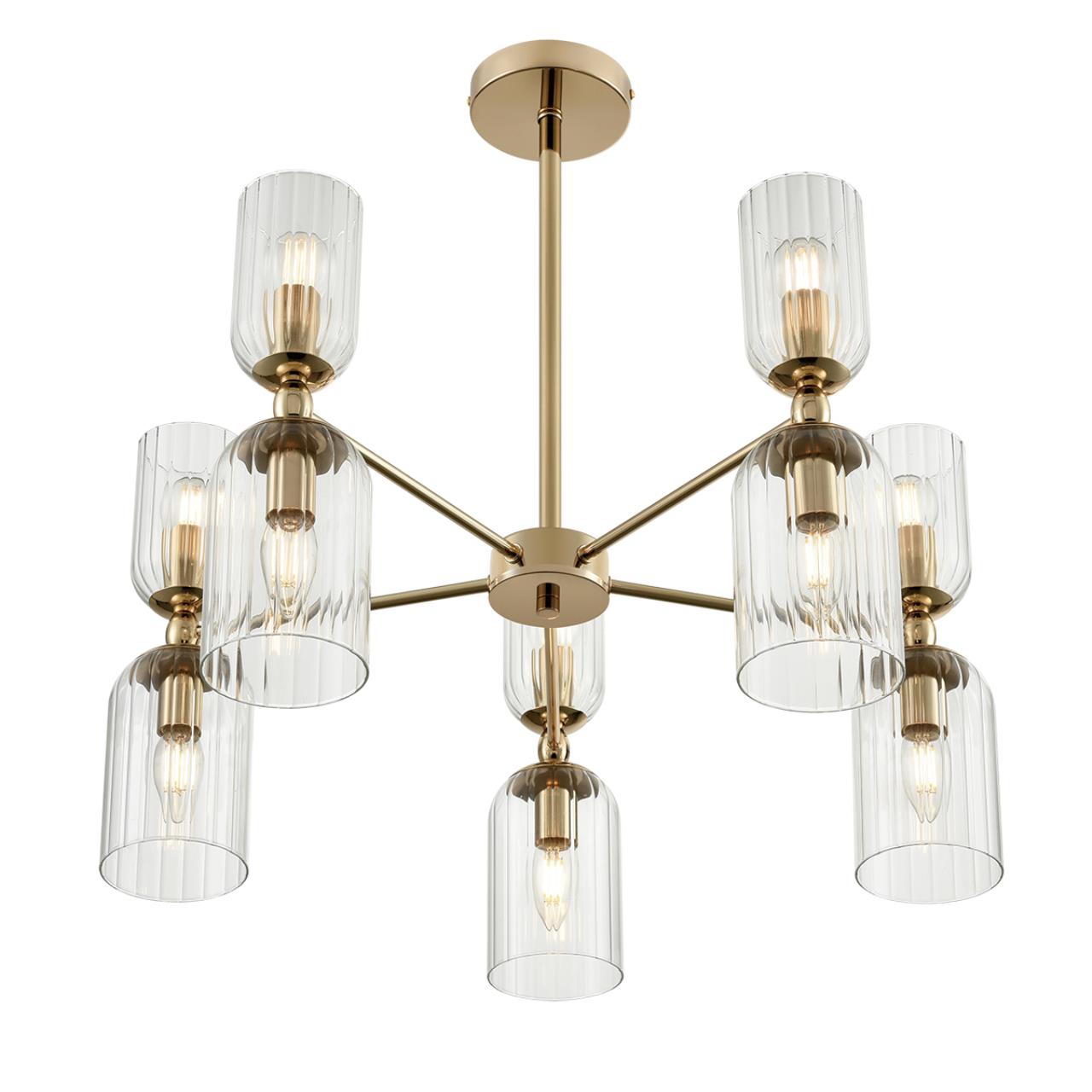 Линия светильников KASSIA станет оригинальным дополнением современных интерьеров. KASSIA сочетает металлический каркас в благородном золотом цвете и цилиндрические плафоны из прозрачного рифленого стекла. Плафоны меньшего размера направлены вверх, плафоны большего размера направлены вниз. Такое дублирование плафонов дает больше света и позволяет осветить большое пространство. В данной линии рекомендуется использование круглых небольших ламп в верхних плафонах и лампы в виде свечи ― в нижних. Это добавит оригинальности и легкий ретро-акцент, который гармонично сочетается с современной стилистикой. Потолочные светильники KASSIA на 10 и 16 ламп станут центральным элементом в просторных залах, а утонченные бра дополнят уютную атмосферу вашего дома.