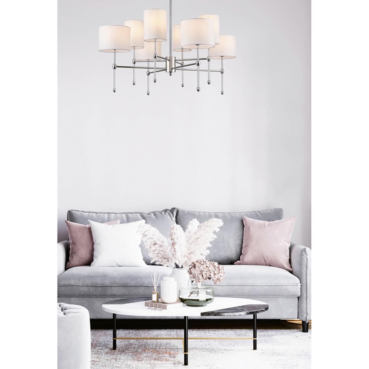 Линия LATTI ― это классика, где каждая деталь продумана до мелочей. Светильники этой линии оснащены металлическим каркасом цвета хром, что придает им стильный, современный вид. Цилиндрические плафоны из белого текстиля создают мягкое и комфортное освещение, сохраняя при этом свою элегантность. Плафоны, расположенные на разной высоте, делают интерьер динамичным. А удлиненные вертикальные рожки визуально вытягивают пространство, делая потолок выше. Светильники LATTI представлены в вариантах на 6 и 8 ламп, что позволяет выбрать оптимальное решение для любого пространства. Бра из этой линии сохраняет все достоинства подвесных светильников, обеспечивая гармоничное сочетание и целостность интерьера. Линия LATTI идеально подойдет для классических и неоклассических интерьеров, добавляя нотку утонченности в любое помещение.