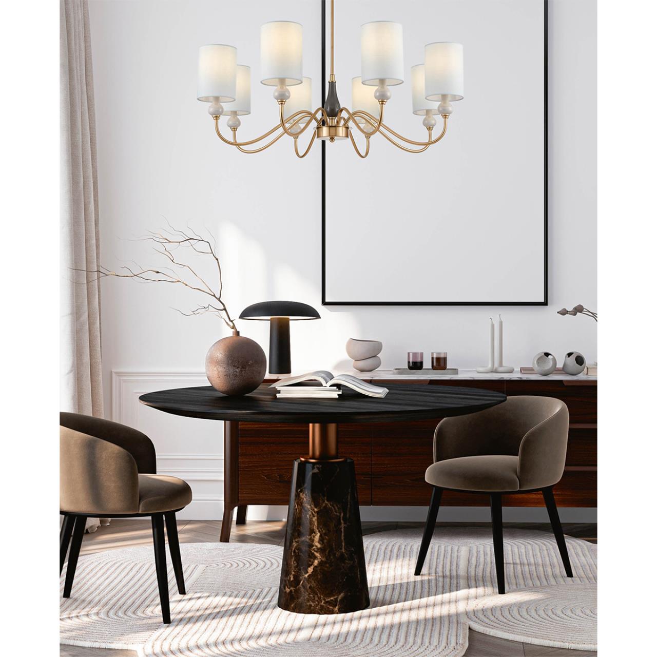 Если ваш интерьер выдержан в классическом стиле, светильники ANRI добавят ему утонченности. Коллекция сочетает в себе металлический каркас цвета латунь с элегантными керамическими деталями белого цвета, придающими светильникам благородный вид. Плафоны выполнены из текстиля нежного мятного зеленого оттенка, что добавляет композиции свежести и легкости. Светильники линии ANRI доступны в вариантах на 5 и 8 ламп. Плавные линии делают их универсальными для использования в гостиных, столовых и спальнях. Декоративный керамический элемент темно-серого цвета, расположенный в центре конструкции, не только добавляет эстетический акцент светильникам, но и гармонично объединяет все его компоненты. Настенные бра ANRI дополняют общий образ интерьера, создавая идеально мягкое освещение для уютных уголков и коридоров.
