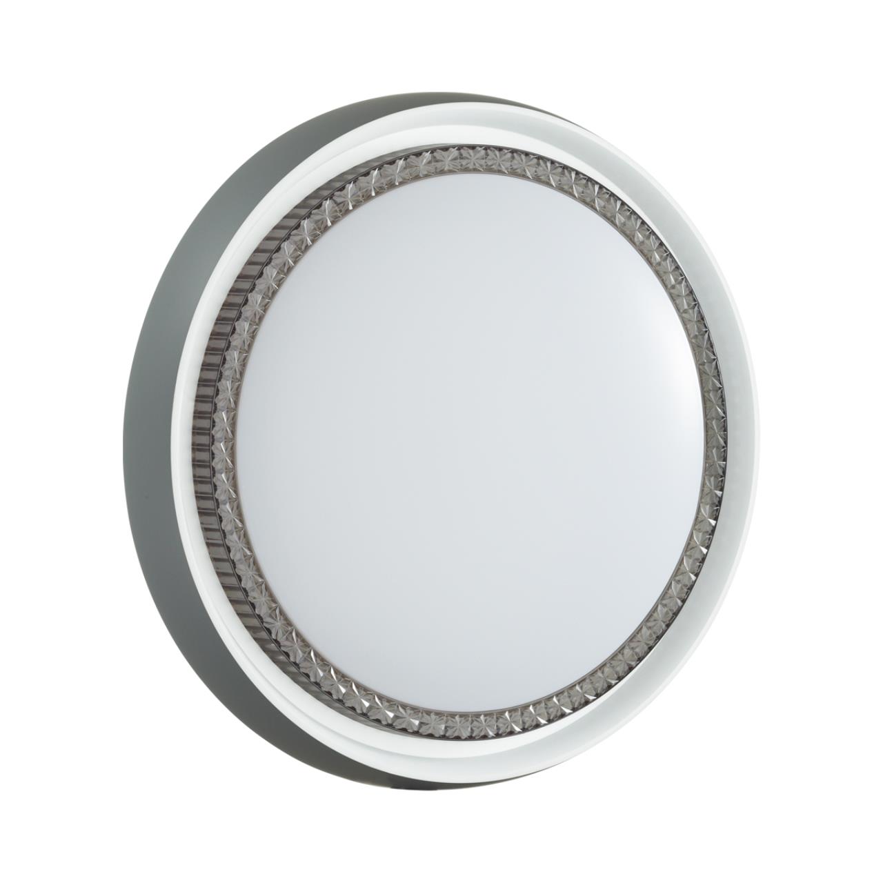 Светильник 7644/DL линии RAHIG состоит из металлического основания (базы) и пластикового рассеивателя. Материал рассеивателя — высококачественный пластик марки PMMA 2.0 белого цвета с матовой поверхностью. Пластик обеспечивает светильнику равномерное рассеивание и хорошее светопропускание. Материал обода — пластик серого цвета с внешней стороны, белого цвета с внутренней стороны.Форма плафона: круглая, декорирована вставкой под хрусталь из прозрачного пластика дымчатого цвета. Степень защиты IP43 позволяет использовать светильник в определенных зонах влажных помещений. В комплект входит заменяемый LED-модуль с линзами мощностью 70 Вт, соответствующей лампе накаливания 610 Вт, также пульт ДУ (с креплением на стену), с помощью которого осуществляется плавное изменение цветовой температуры в диапазоне 3000—6000 К, изменение яркости, переход в режим переключения теплого/белого/холодного/ночного света. Светильник имеет функцию памяти.