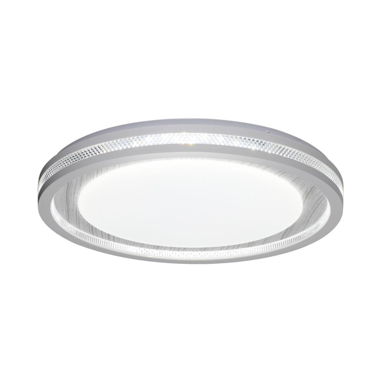 Светильник 7681/EL линии MAVI WOOD состоит из металлического основания (базы) и пластикового рассеивателя. Материал рассеивателя — высококачественный пластик марки PMMA 2.0 белого цвета с матовой поверхностью, без текстуры. Пластик обеспечивает светильнику равномерное рассеивание и хорошее светопропускание. Форма плафона: круглая, декорирована ободом из пластика светло-серого цвета под дерево с прозрачной вставкой под хрусталь. Степень защиты IP43 позволяет использовать светильник в определенных зонах влажных помещений. В комплект входит заменяемый LED-модуль с линзами мощностью 70 Вт, соответствующей лампе накаливания 610 Вт, а также пульт ДУ (с креплением на стену), с помощью которого осуществляется плавное изменение цветовой температуры в диапазоне 3000—6000 К, изменение яркости, переход в режим переключения теплого/белого/холодного/ночного света. Светильник имеет функцию памяти.