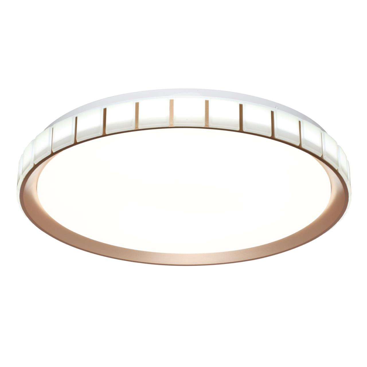 Светильник 7695/EL линии KUPI GOLD состоит из металлического основания (базы) и пластикового рассеивателя. Материал рассеивателя — высококачественный пластик марки PMMA 2.0 белого цвета с матовой, гладкой поверхностью. Пластик обеспечивает светильнику равномерное рассеивание и хорошее светопропускание. Форма плафона: круглая, декорирована рельефным пластиковым светопропускающим ободом, цвет розовое золото. Степень защиты IP43 позволяет использовать светильник в определенных зонах влажных помещений. В комплект входит заменяемый LED-модуль с линзами мощностью 70 Вт, соответствующей лампе накаливания 610 Вт, а также пульт ДУ (с креплением на стену), с помощью которого осуществляется плавное изменение цветовой температуры в диапазоне 3000—6000 К, изменение яркости, переход в режим переключения теплого/белого/холодного/ночного света. Светильник имеет функцию памяти.