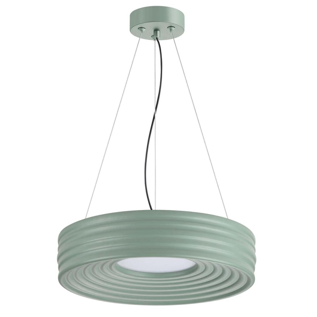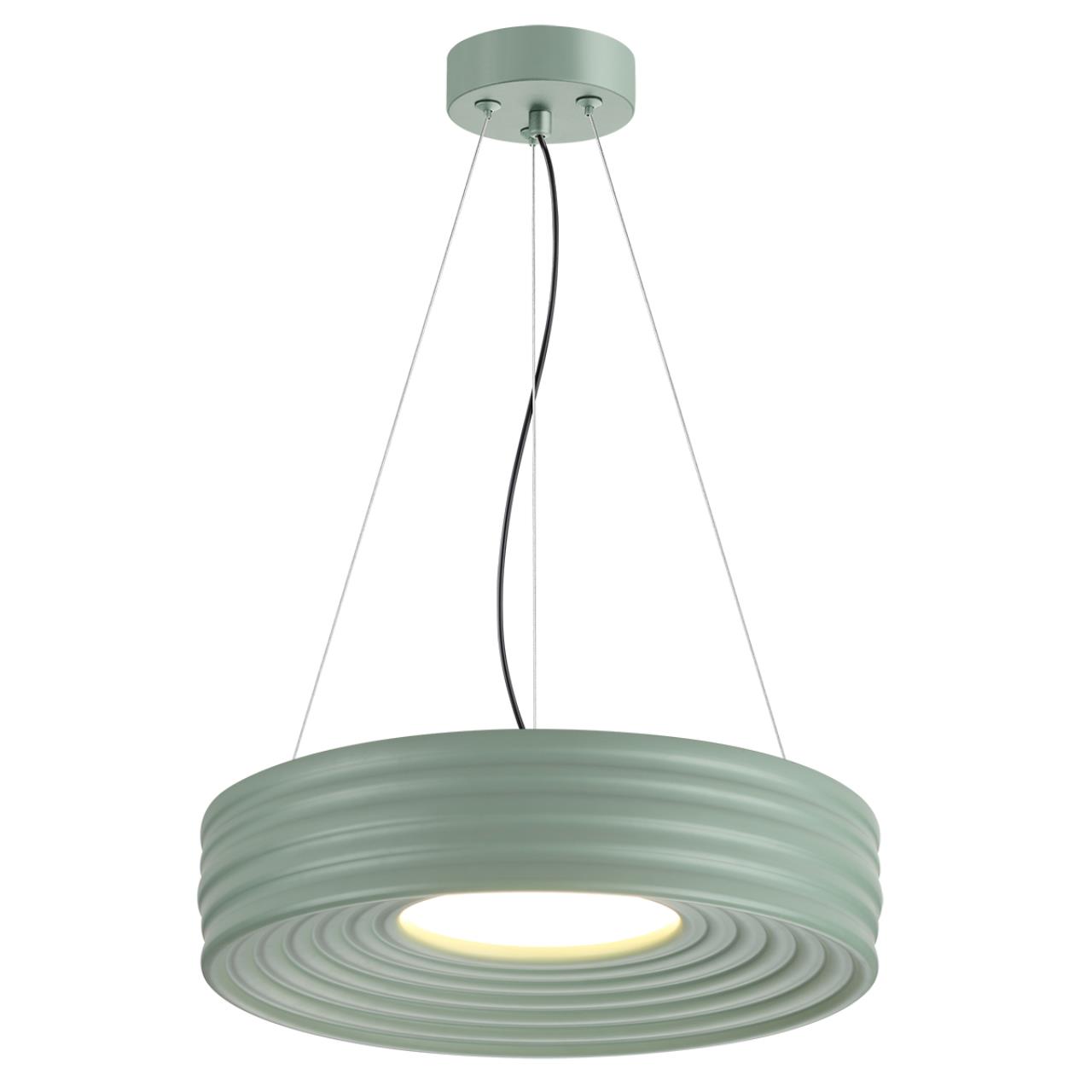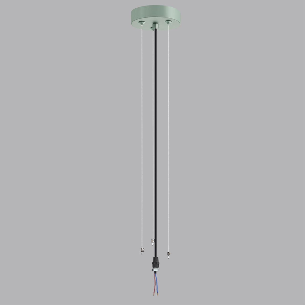 Тросы подвесного крепления для модели MACARON выполнены из металла. Потолочная металлическая чаша выкрашена в цвет корпуса светильника — светлый серо-зеленый. Питающий провод — черного цвета.
