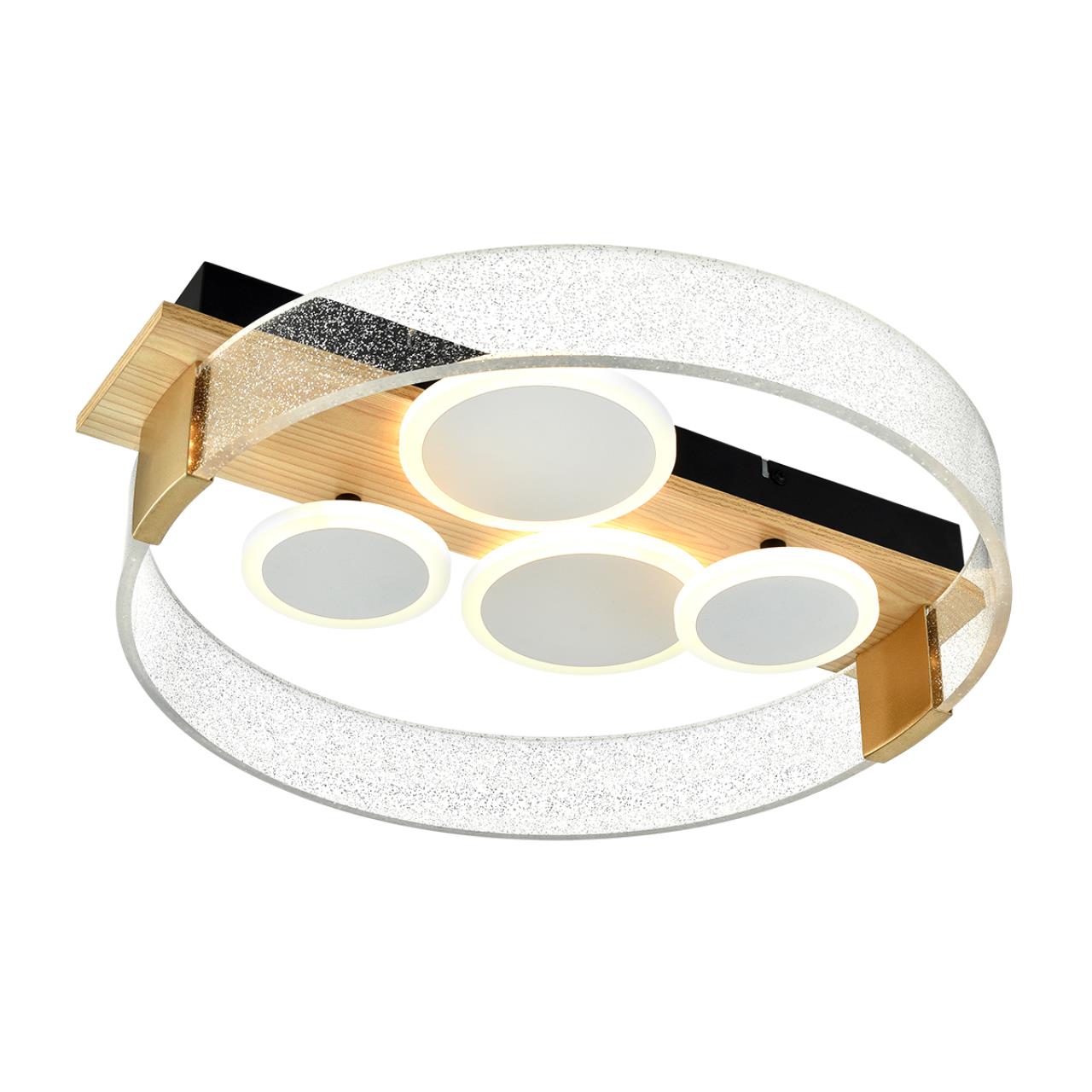 В светильнике SPOTS смешалось все: стили, цвета, фактуры. Черное металлическое потолочное основание сочетается с декоративным основанием из МДФ цвета натурального дерева. Оно, в свою очередь, сочетается с прозрачным акриловым рассеивателем с мириадами глиттера и белыми окружностями со светодиодными контурами. Вся композиция собирается и удерживается золотыми креплениями-скобами. Эко, модерн, минимализм, арт-деко — это все светильник SPOTS. SPOTS — яркий представитель стиля фьюжн! Светильник оснащен пультом ДУ.