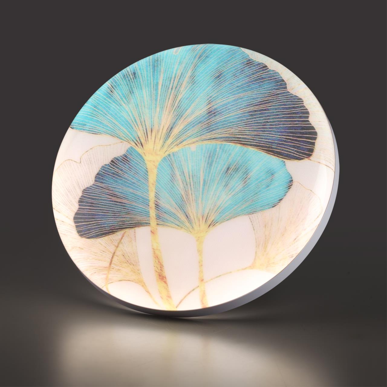 Светильник 7747/EL линии FLOREN состоит из металлического основания (базы) и пластикового рассеивателя. Материал рассеивателя — высококачественный пластик марки PMMA 2.0 цвета мульти с глянцевой поверхностью, обеспечивающий светильнику равномерное рассеивание и хорошее светопропускание. Форма плафона: круглая, декорирована орнаментом на плафоне с рисунком цветов и съемным ободом белого цвета. Рисунок на плафоне выполнен методом цифровой печати по технологии прямого нанесения красок на акриловый лист. С целью предотвращения выцветания красок поверх рисунка нанесен слой белой краски. После выдувания плафона при высоких температурах красочный рисунок приобретает стойкость и долговечность. Степень защиты IP43 позволяет использовать светильник в определенных зонах влажных помещений. В комплект входит заменяемый LED-модуль с линзами мощностью 70 Вт, соответствующей лампе накаливания 610 Вт, а также пульт ДУ, с помощью которого осуществляется плавное изменение цветовой температуры в диапазоне 3000—6000 К.