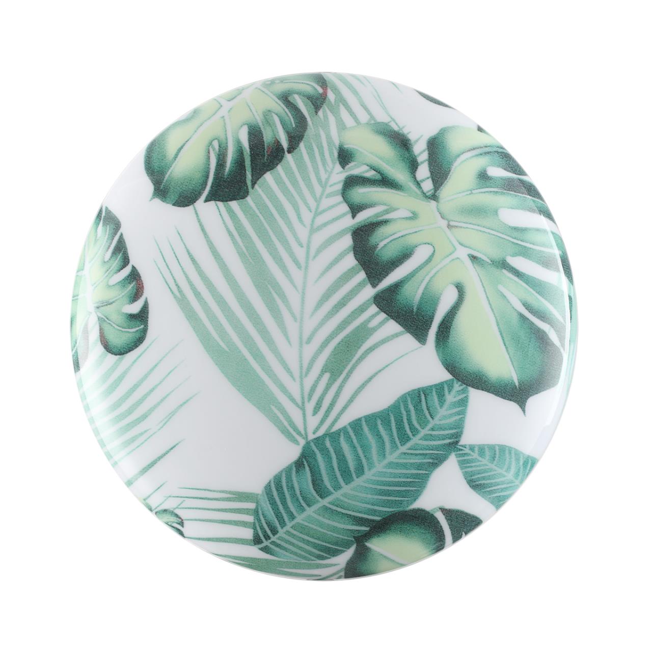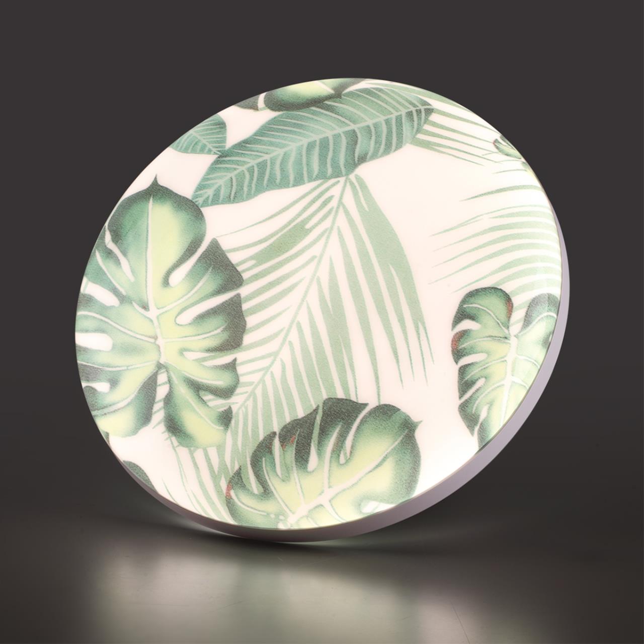 Светильник 7748/DL линии FLORI состоит из металлического основания (базы) и пластикового рассеивателя. Материал рассеивателя — высококачественный пластик марки PMMA 2.0 белого цвета с глянцевой поверхностью, обеспечивающий светильнику равномерное рассеивание и хорошее светопропускание. Форма плафона: круглая, декорирована орнаментом с зеленым рисунком тропических листьев и съемным ободом белого цвета. Рисунок на плафоне выполнен методом цифровой печати по технологии прямого нанесения красок на акриловый лист. С целью предотвращения выцветания красок поверх рисунка нанесен слой белой краски. После выдувания плафона при высоких температурах красочный рисунок приобретает стойкость и долговечность. Степень защиты IP43 позволяет использовать светильник в определенных зонах влажных помещений. В комплект входит заменяемый LED-модуль с линзами мощностью 48 Вт, соответствующей лампе накаливания 440 Вт, а также пульт ДУ, с помощью которого осуществляется плавное изменение цветовой температуры в диапазоне 3000—6000 К.