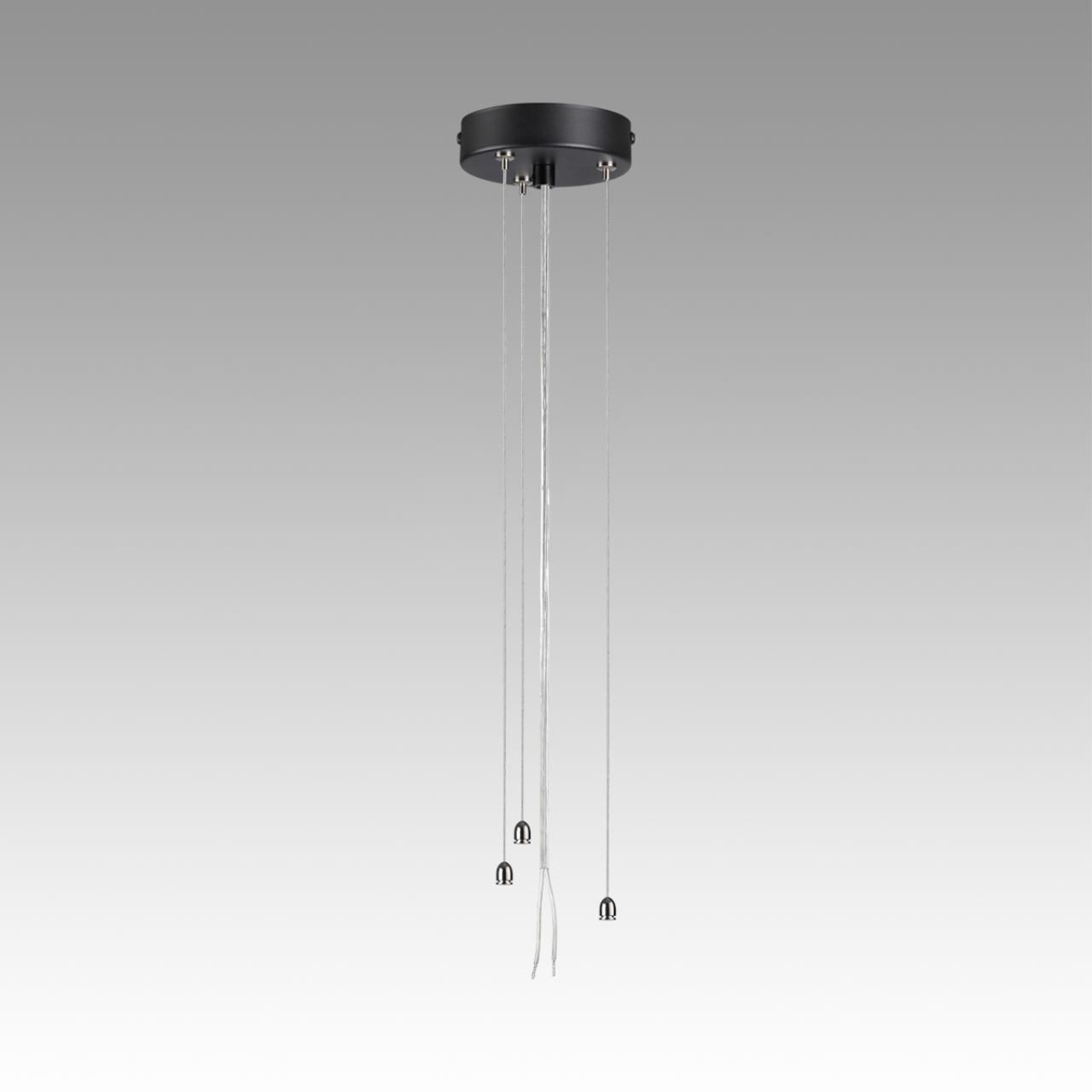 Тросы подвесного крепления для модели QUANTUM LED выполнены из металла. Потолочная металлическая чаша выкрашена в цвет корпуса светильника — угольно-черный. Питающий провод — белого цвета.