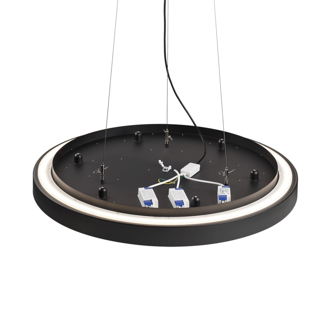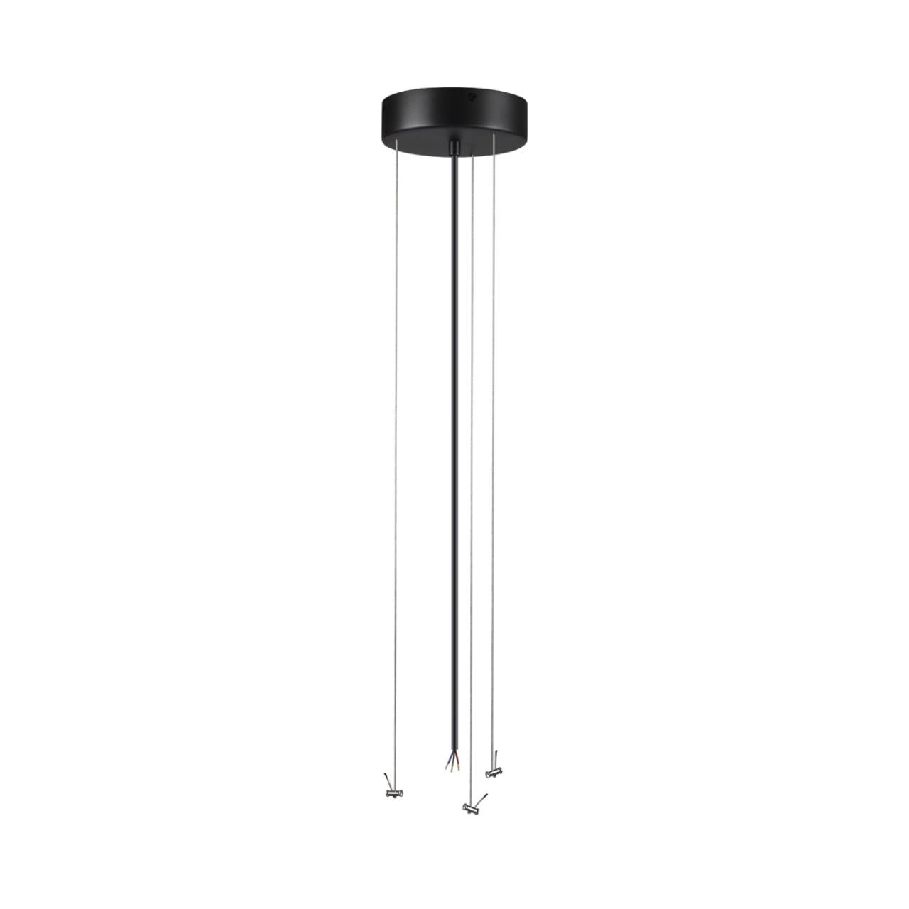 Тросы подвесного крепление для модели QUASAR LED выполнены из металла в приятной на ощупь силиконовой оплетке. Питающий провод и потолочная чаша выполнены в цвете внешнего контура корпуса светильника — угольно-черном.