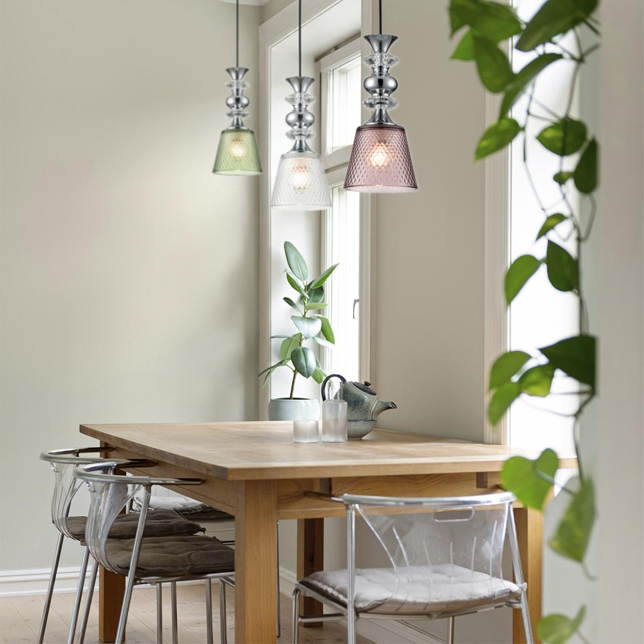 Линия соло-подвесов MANOLA подходит для помещений в классическом стиле. Сложное наборное основание из прозрачных и хромовых элементов украшает светильник. Цветное стекло плафона имеет гладкую наружную поверхность и ребристую внутри. Актуальная цветовая гамма: зеленый, розовый, прозрачный ― позволяет добавить цветового акцента в интерьер.