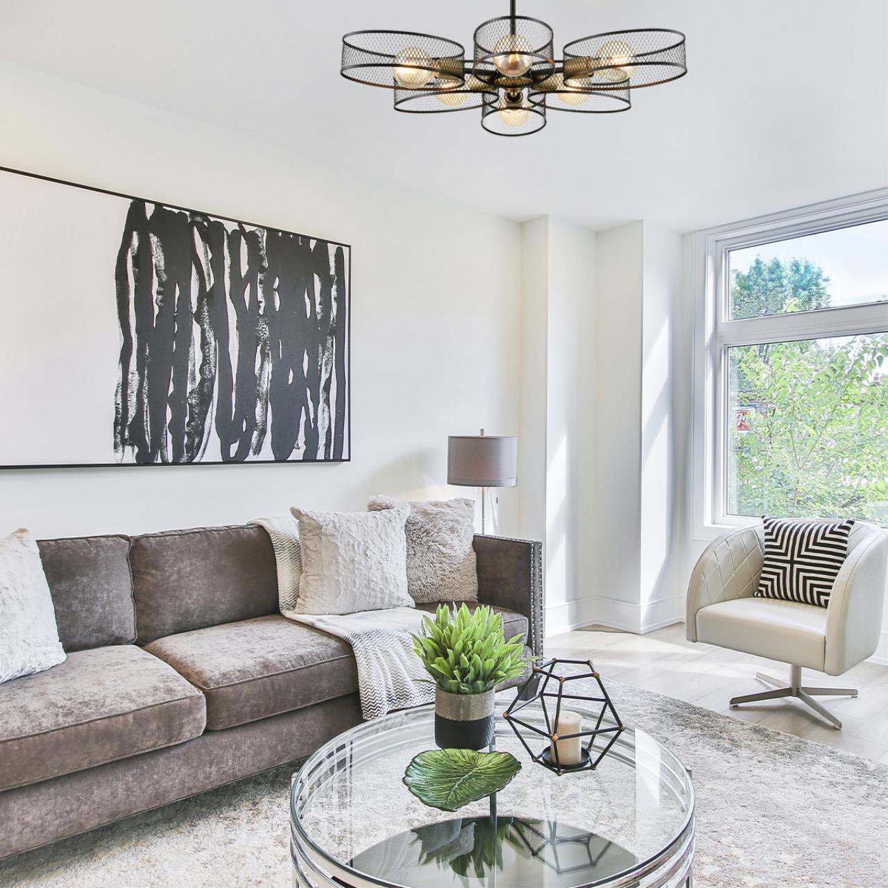 Светильник VIVANA выполнен в виде девятиконечной звезды, в которой сетчатые металлические плафоны соединяются с центральным элементом каркаса. Плафоны имеют вытянутую округлую форму и изящно обволакивают каждую из ламп светильника. Модель достаточно объемна, но за счет структуры плафонов она выглядит легко. VIVANA станет отличным выбором для освещения обеденных зон, использования в студиях, кафе и ресторанах.