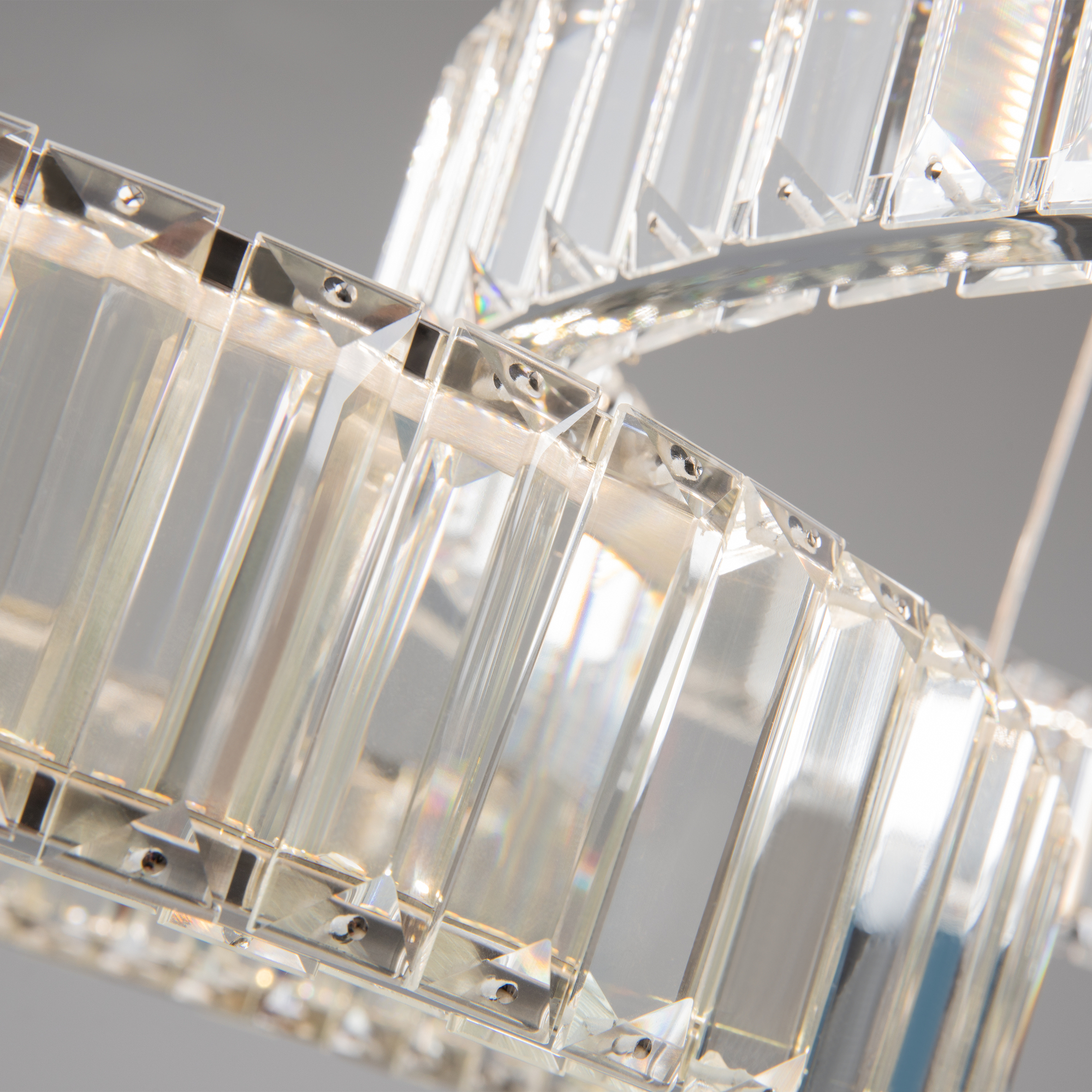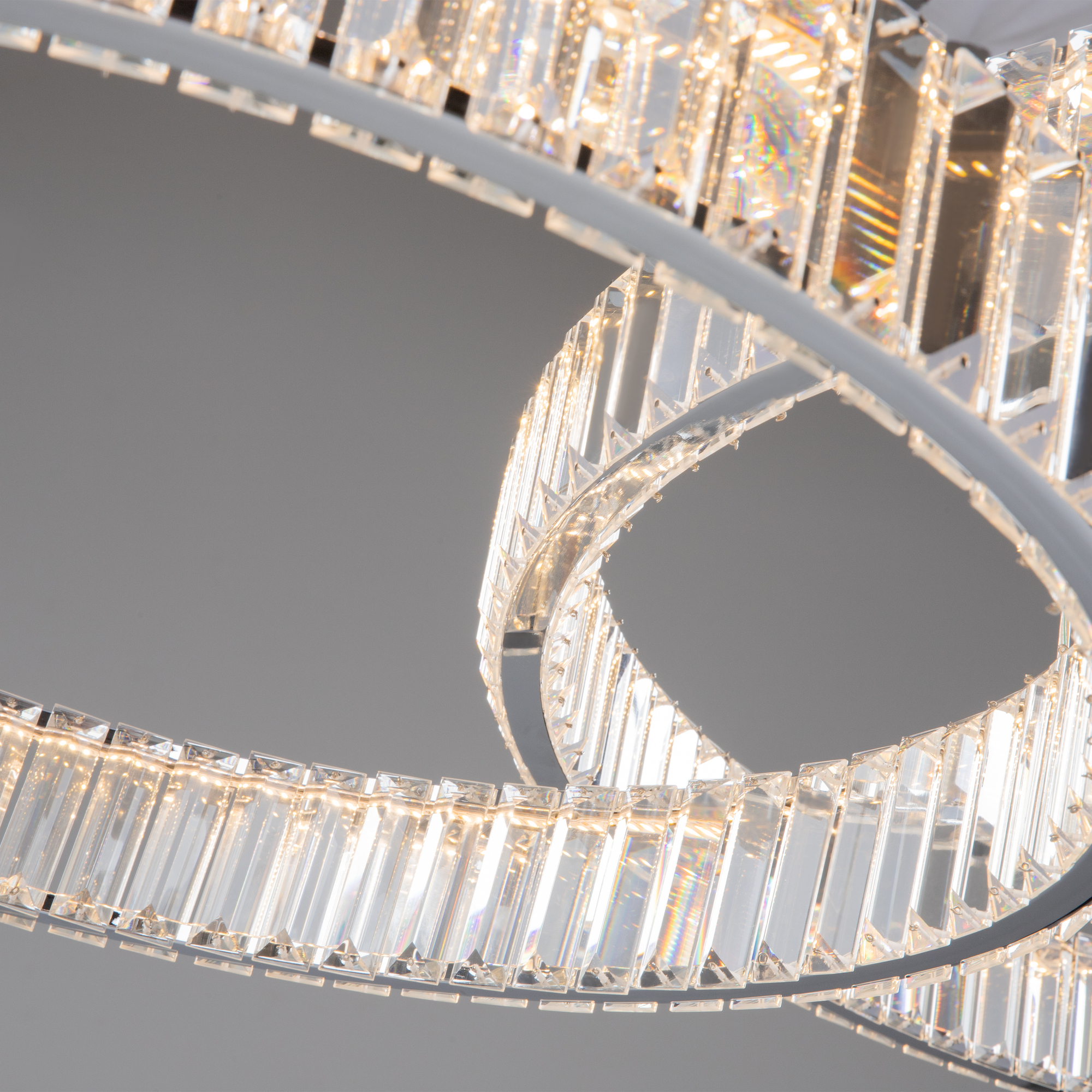 Металлическая арматура в цвете латунь и хром. Хрустальные декоративные кольца с геометричными гранями. LED-источник света. Регулировка цветовой температуры (3000-4000-5000K) и яркости 4G-dimming при помощи пульта (в комплекте).