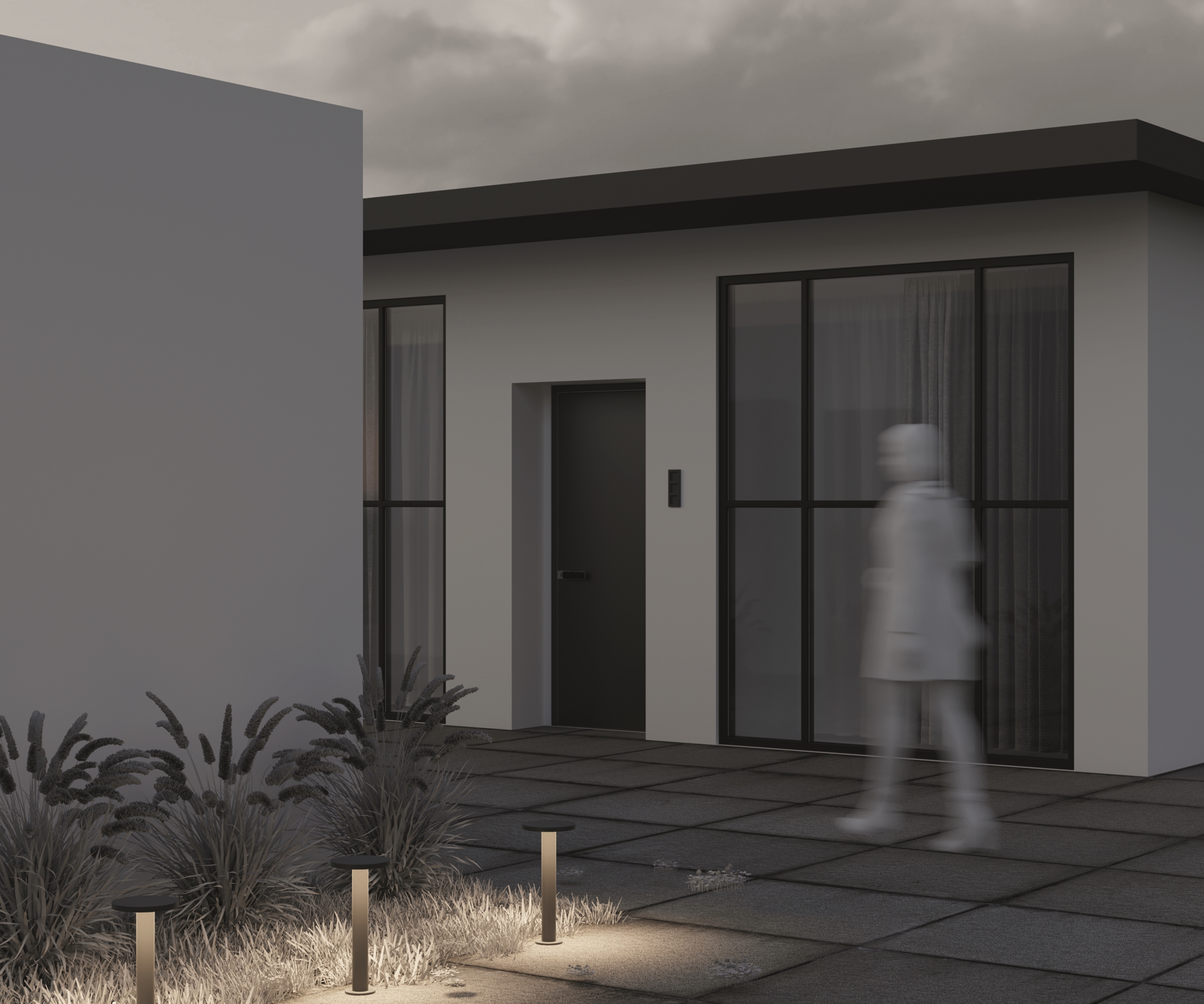 Материал корпуса — металл, цвет — графит. Высокий уровень защиты от пыли и влаги IP 65. Устойчивость к коррозии и перепадам температур. LED-источник света с нейтральной цветовой температурой 3000 К. Серия включает настенные и ландшафтные светильники.