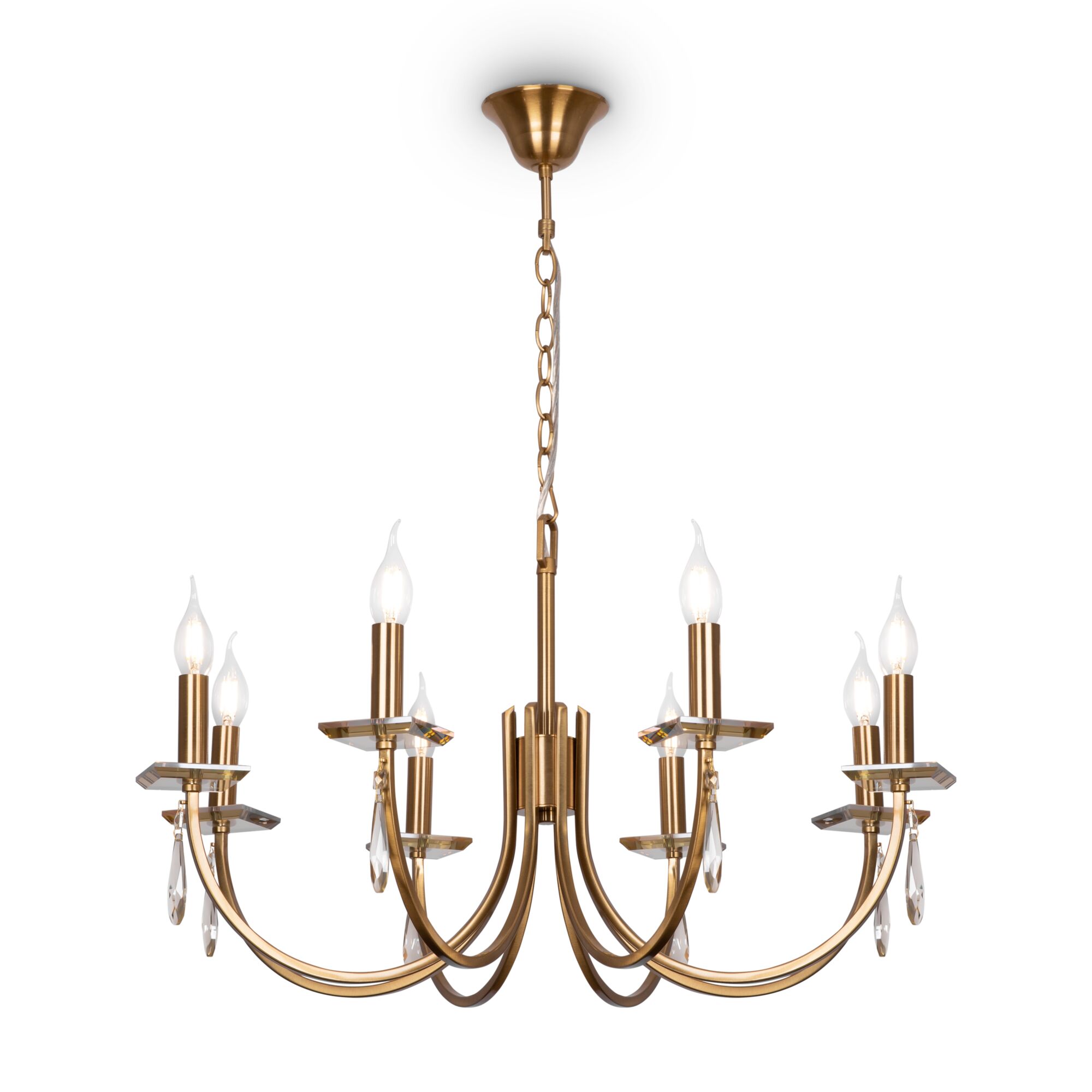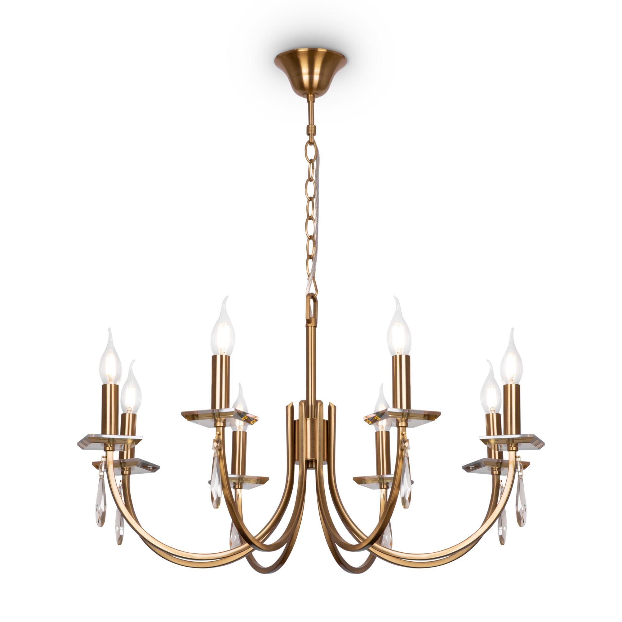 Металлическая арматура в двух оттенках: латунь и никель. Классическая форма плафона в виде свечи. Торшер и настольная лампа имеют тканевые абажуры. Белые – для арматуры цвета никель, оттенка кремовый шампань – для латунной. Декор – прозрачные хрустальные подвесы каплевидной формы. Торшер с цоколем Е27, лампа, бра и люстры – Е14.
