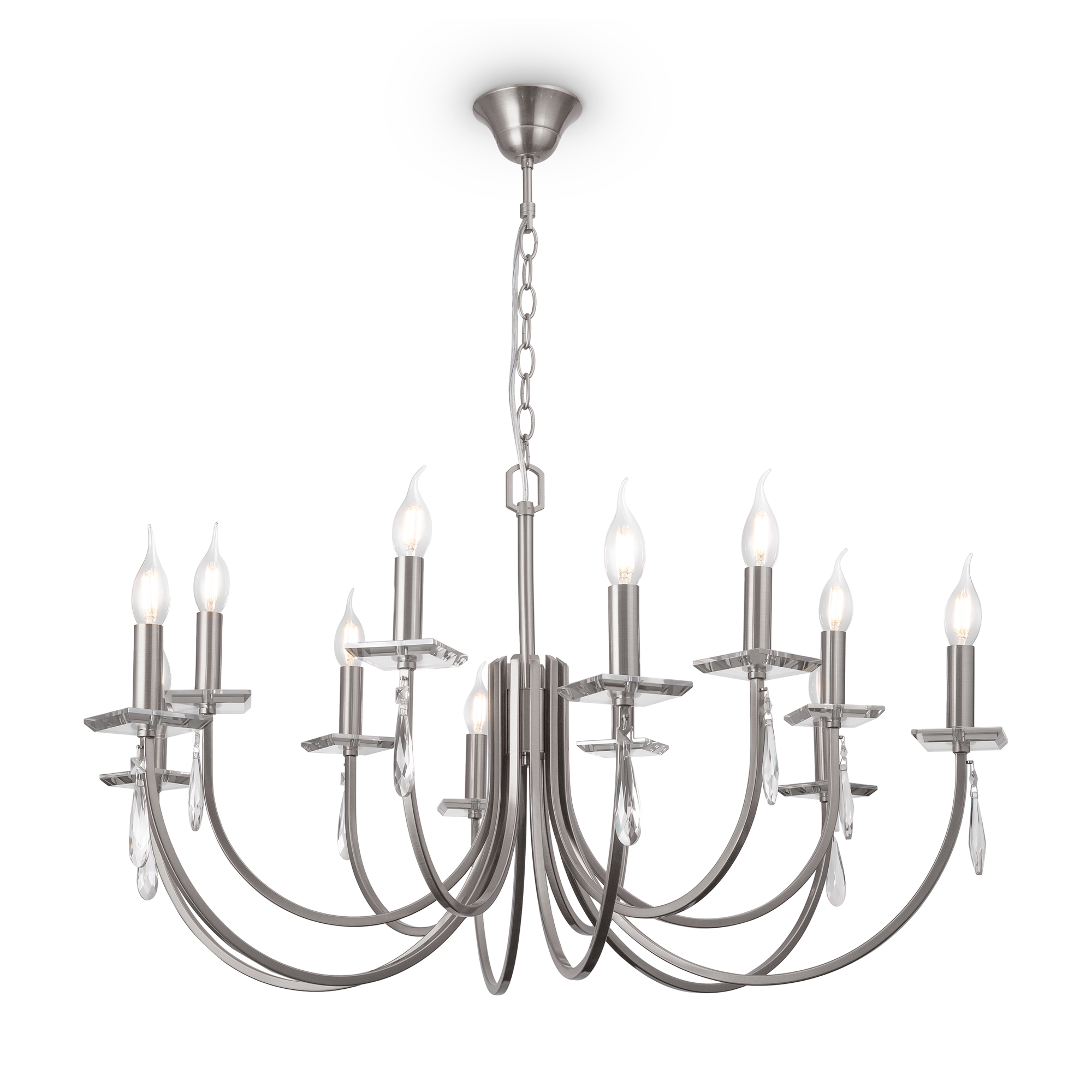 Металлическая арматура в двух оттенках: латунь и никель. Классическая форма плафона в виде свечи. Торшер и настольная лампа имеют тканевые абажуры. Белые – для арматуры цвета никель, оттенка кремовый шампань – для латунной. Декор – прозрачные хрустальные подвесы каплевидной формы. Торшер с цоколем Е27, лампа, бра и люстры – Е14.
