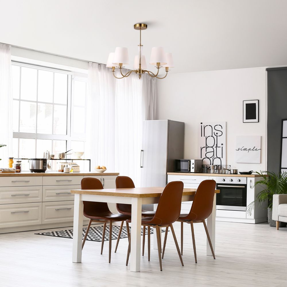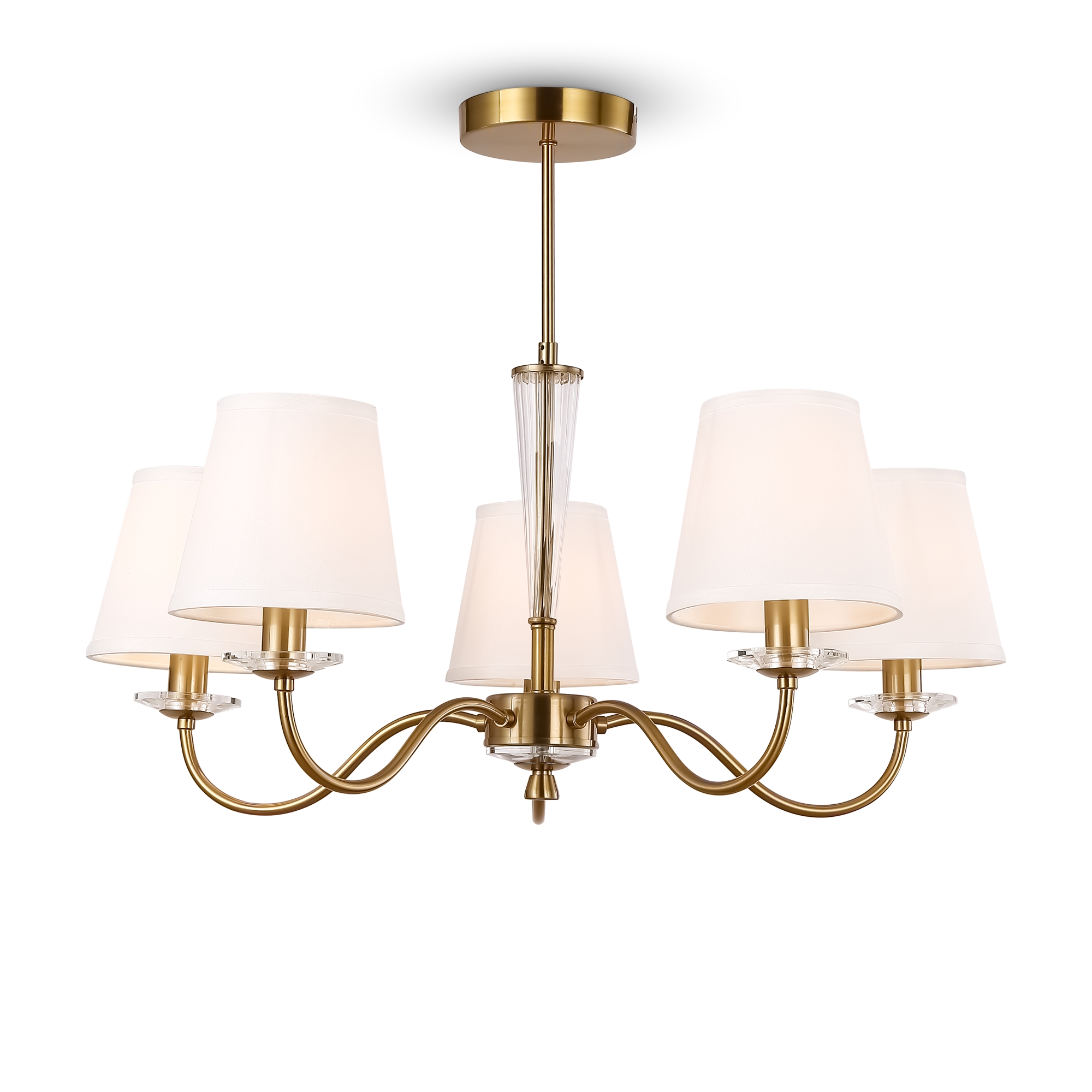 Металлическая арматура в двух оттенках на выбор: латунь и никель. Абажуры – текстиль белого цвета. Декоративные элементы из прозрачного стекла. Источник света – лампа с цоколем E14.
