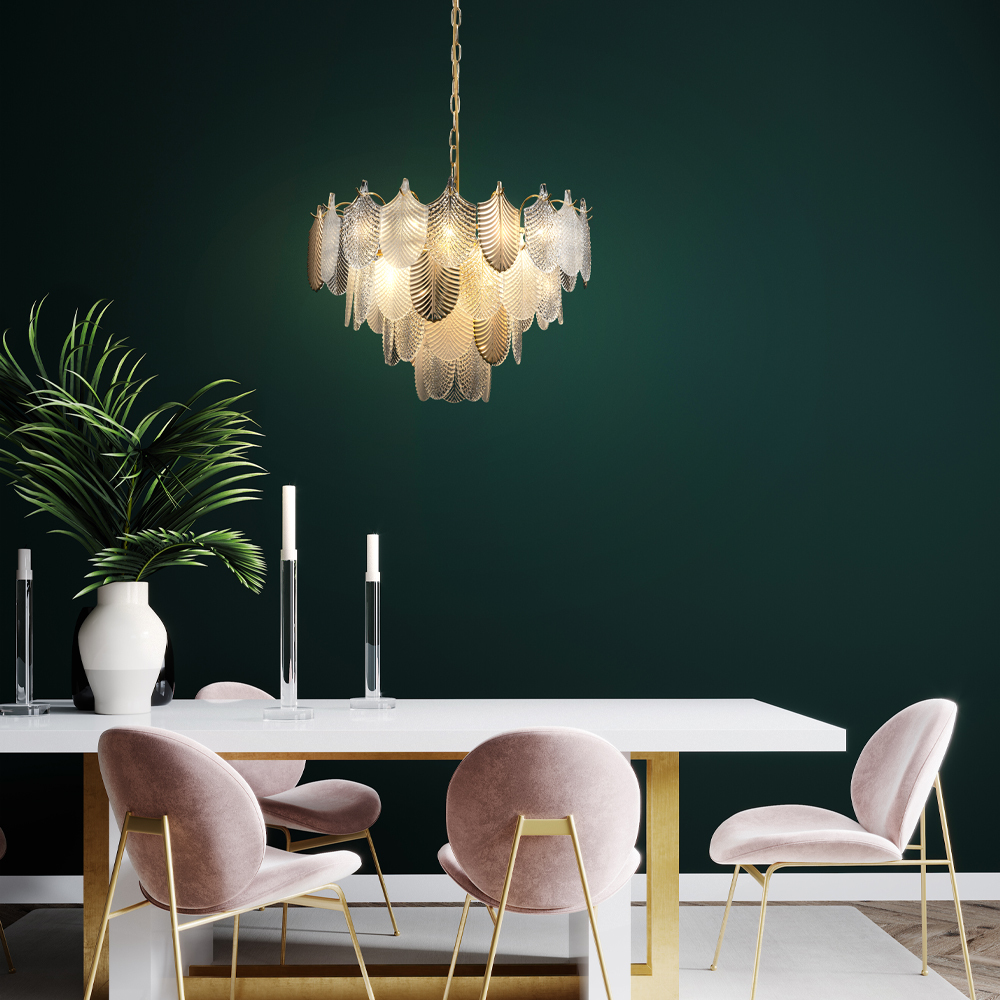 Металлическая арматура. Цвет – французское золото. Декор – рельефные лепестки двух видов: в тон арматуре и из прозрачного фактурного стекла. Современная интерпретация флористического дизайна. Источник света – лампа с цоколем Е14.