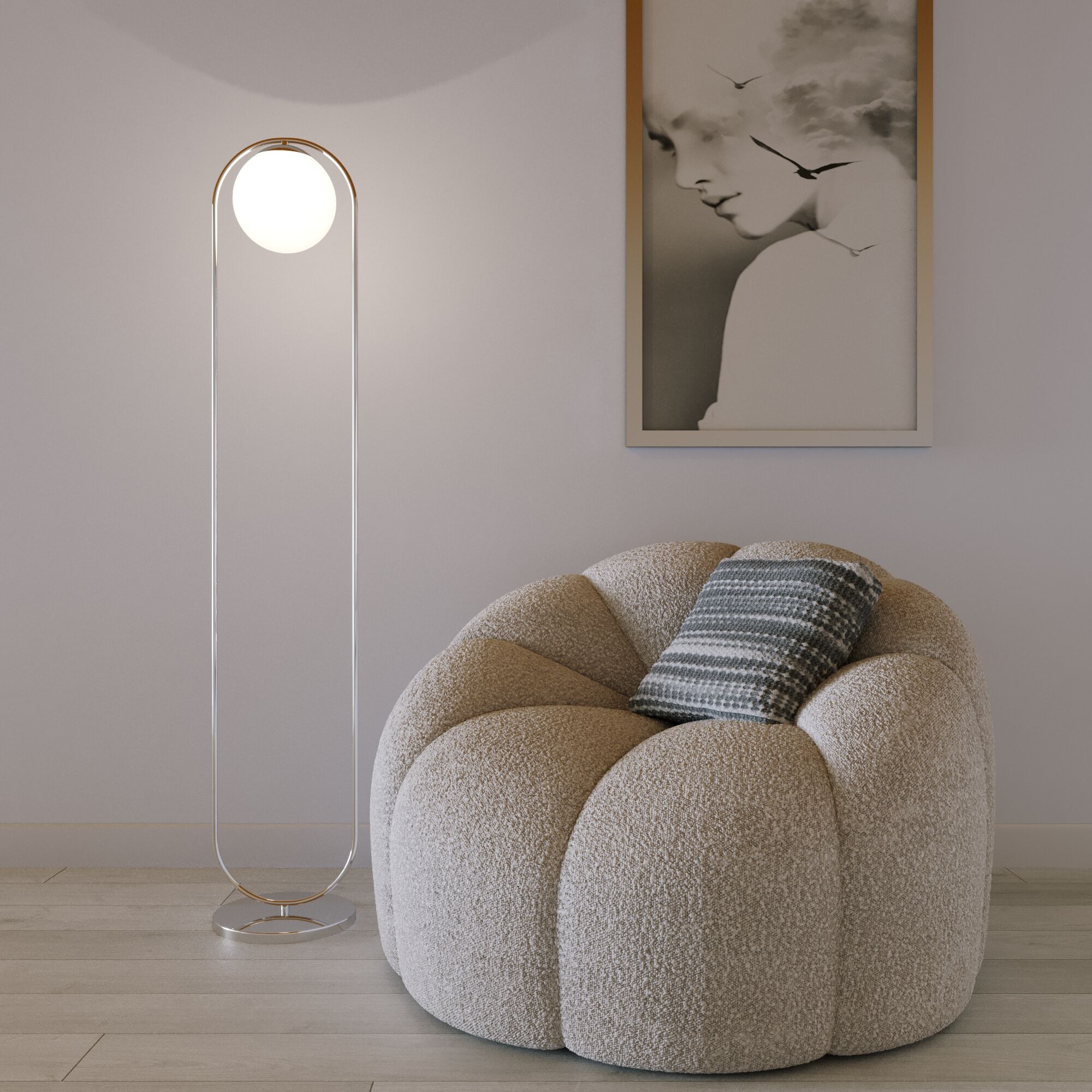 Благодаря белому стеклянному плафону напольный светильник создает мягкое рассеянное свечение, подходящее для комфортного чтения книг в вечернее время. Прочный металлический корпус светильника устойчив к механическим воздействиям, а защитное покрытие обеспечивает надежную электроизоляцию и презентабельный внешний вид.