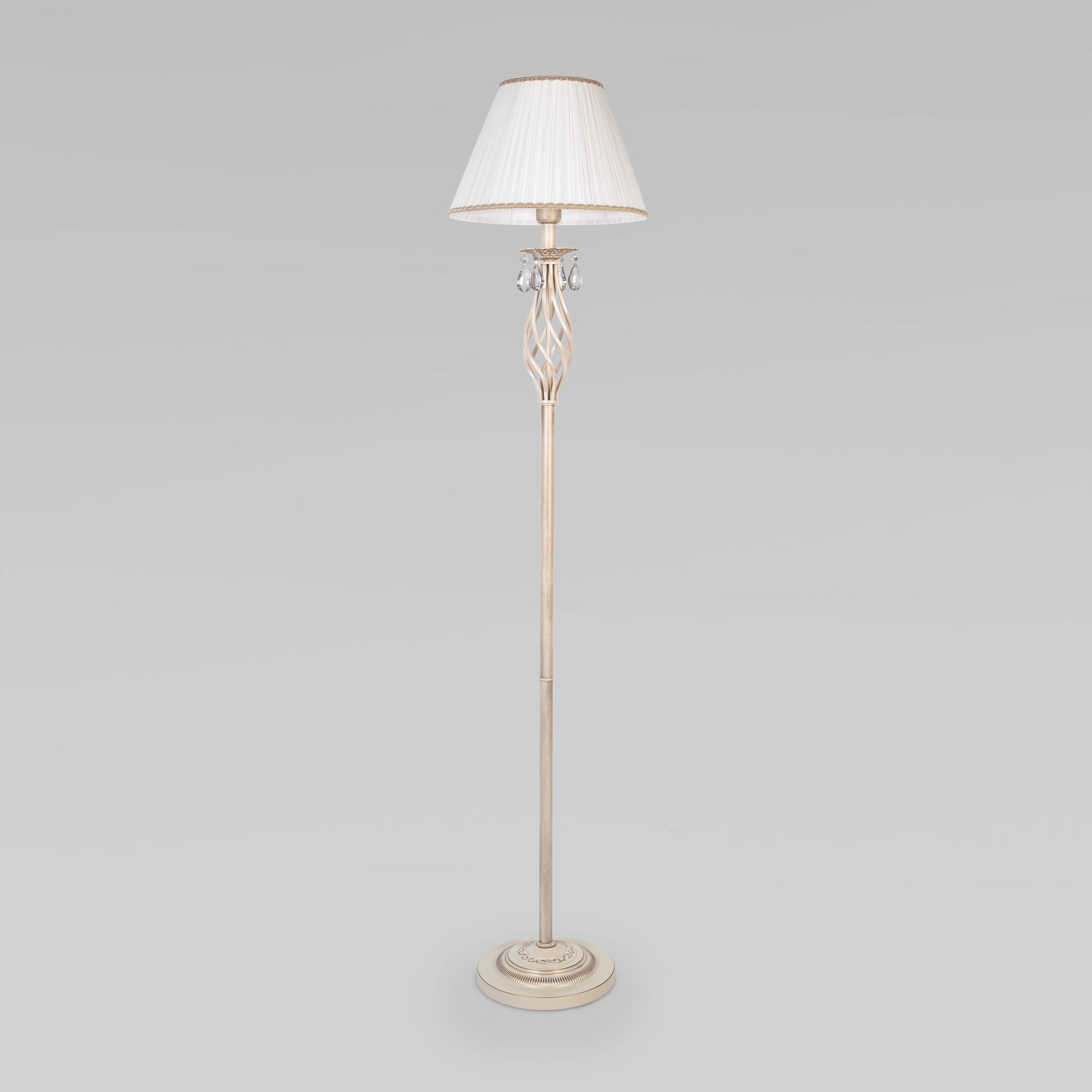 Напольный светильник с хрусталем 10073/1 белый с золотом-это стильный элемент светового дизайна в современных и классических интерьерах. Эффектный торшер со сменной лампой E14 поможет создать качественное дополнительное освещение на площади 5 м² и станет роскошным украшением вашей спальни или гостиной.
