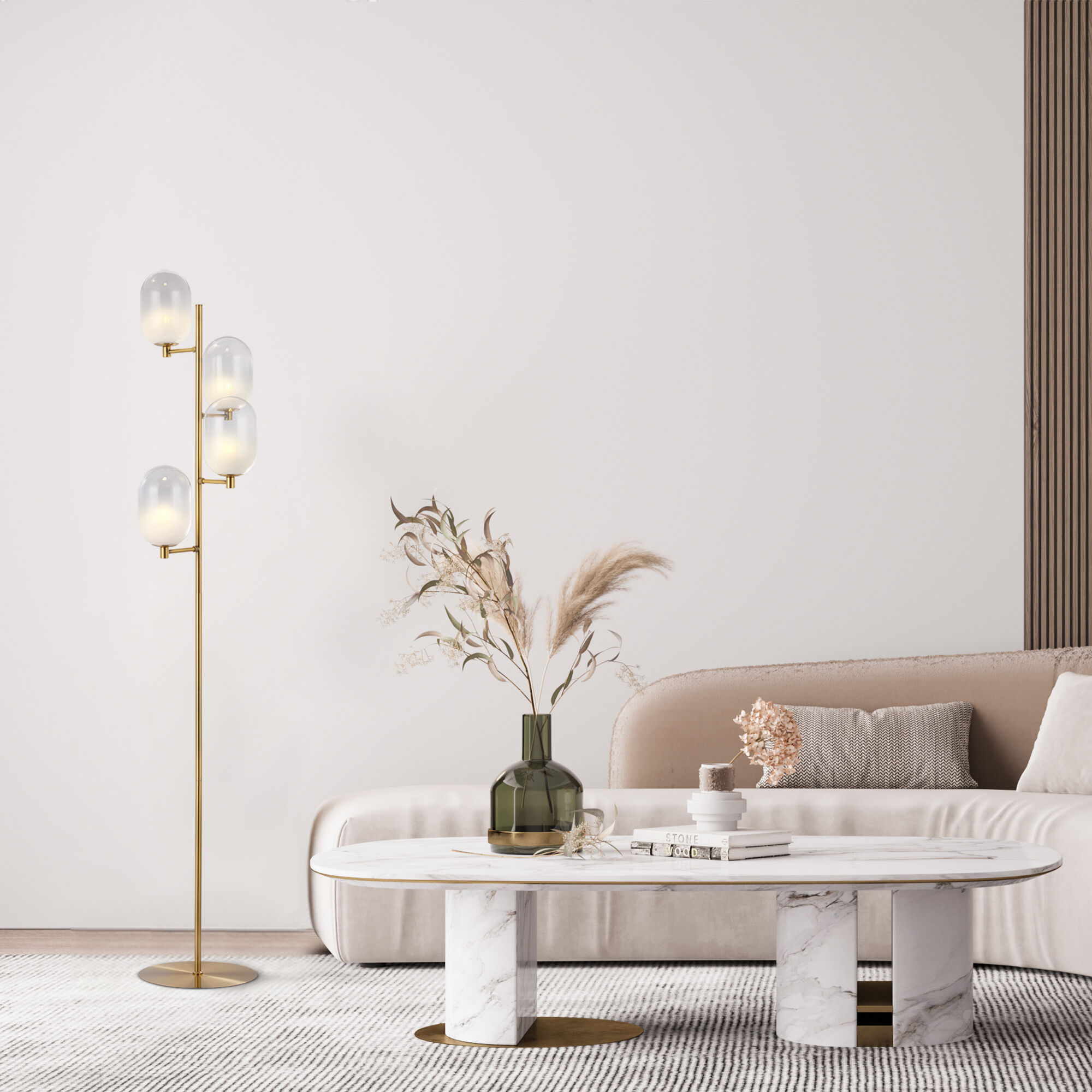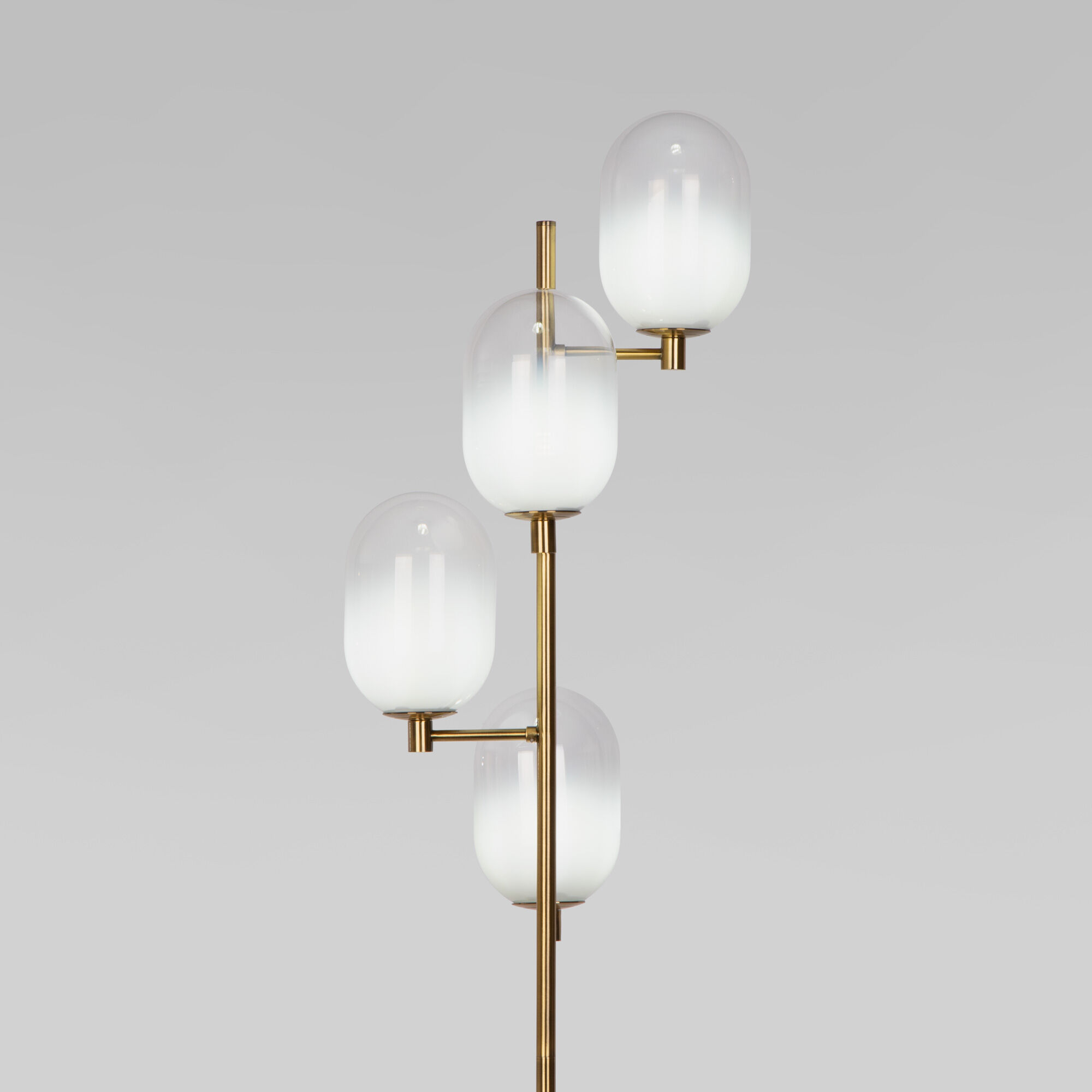 В качестве источника света используются сменные лампы с цоколем G9. Плафоны выполнены из стекла, цвет молочный. Напольный светильник легко собирается.