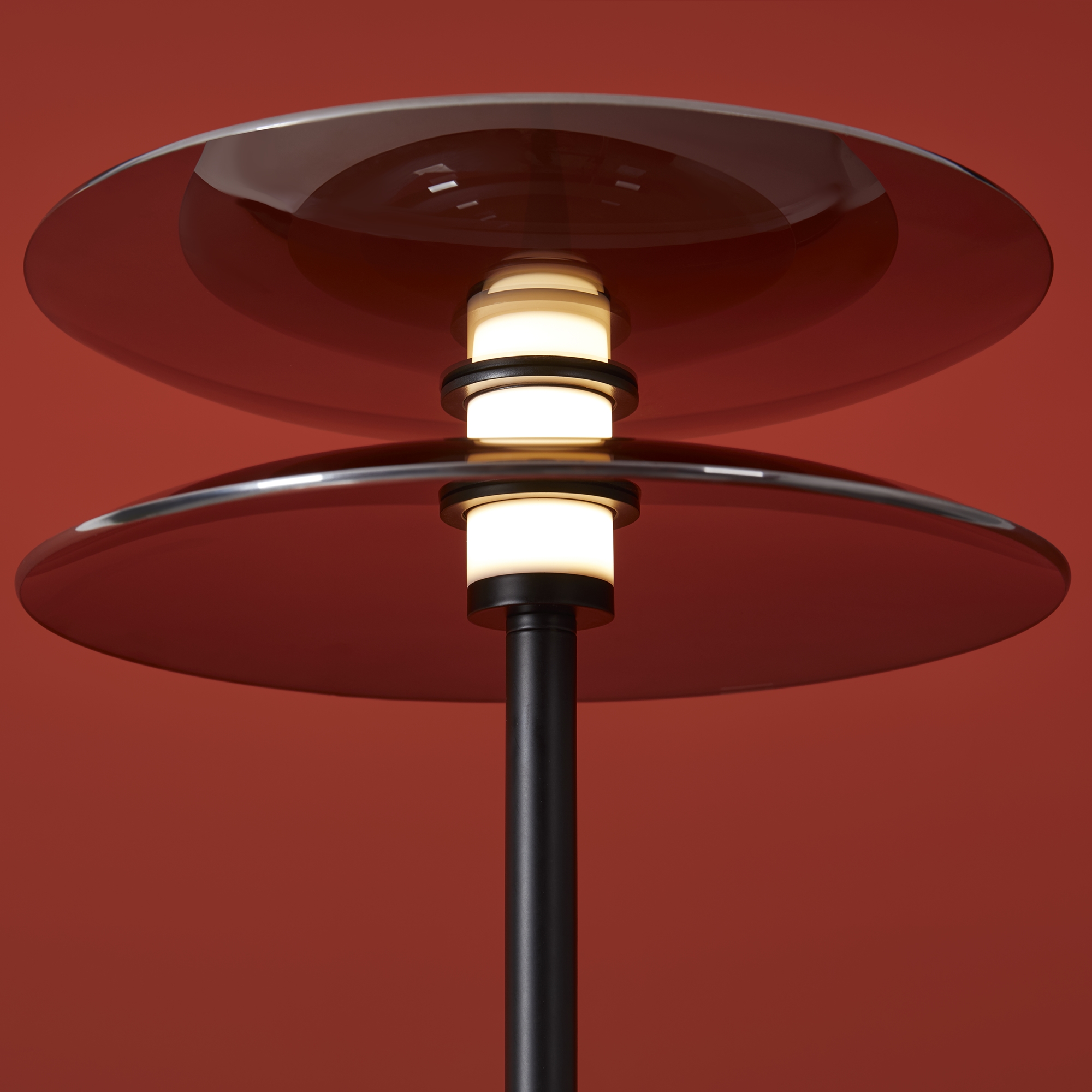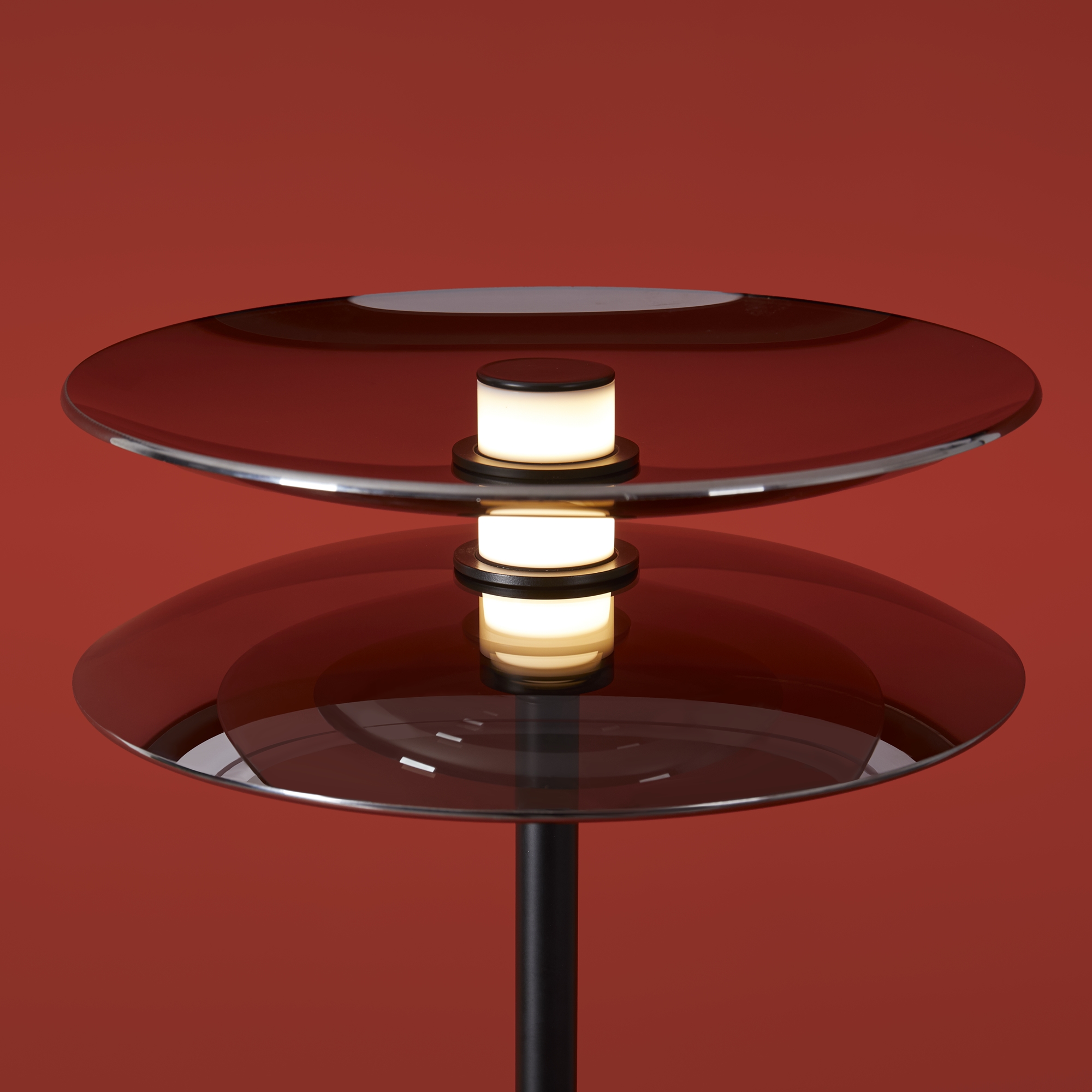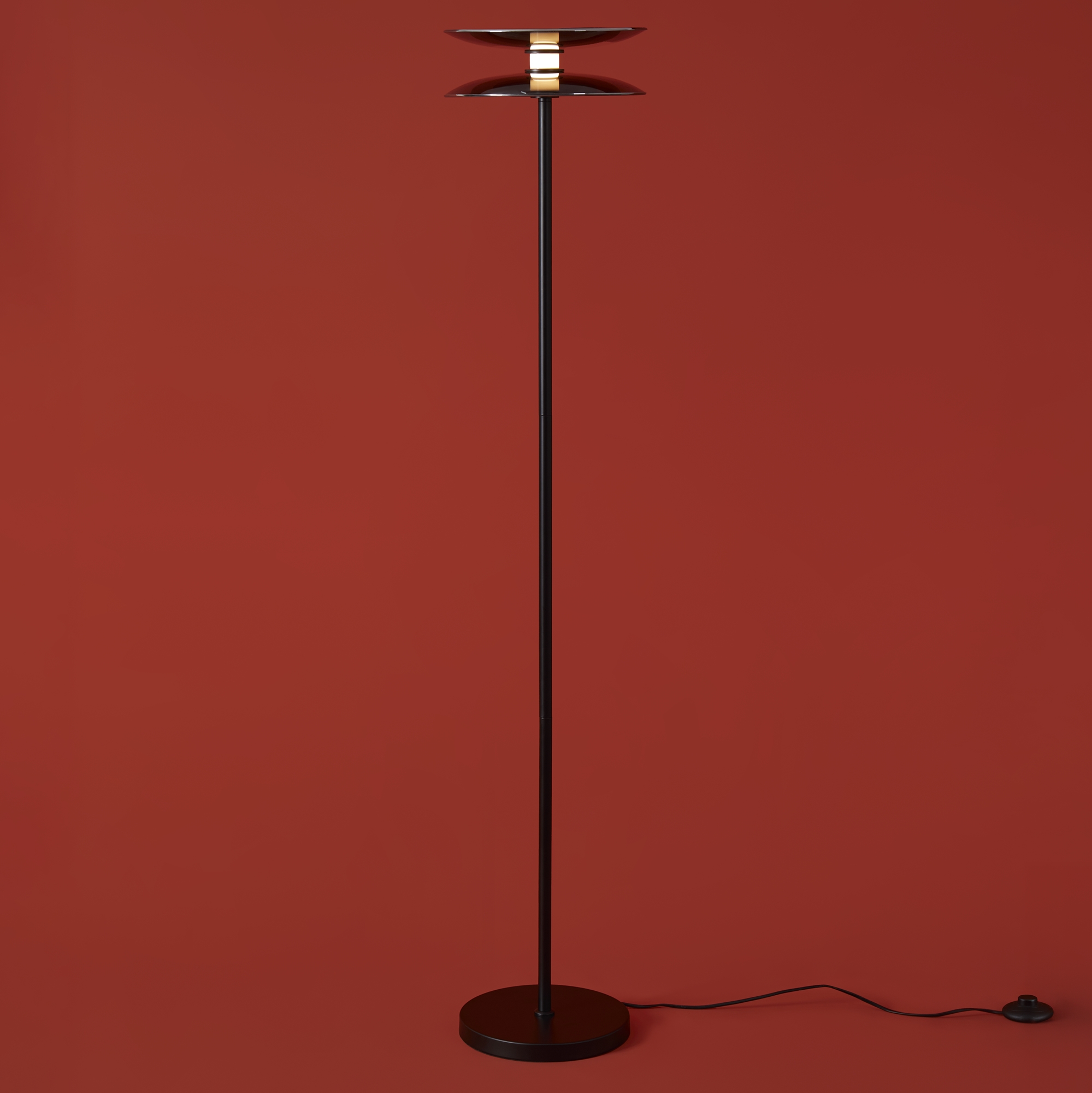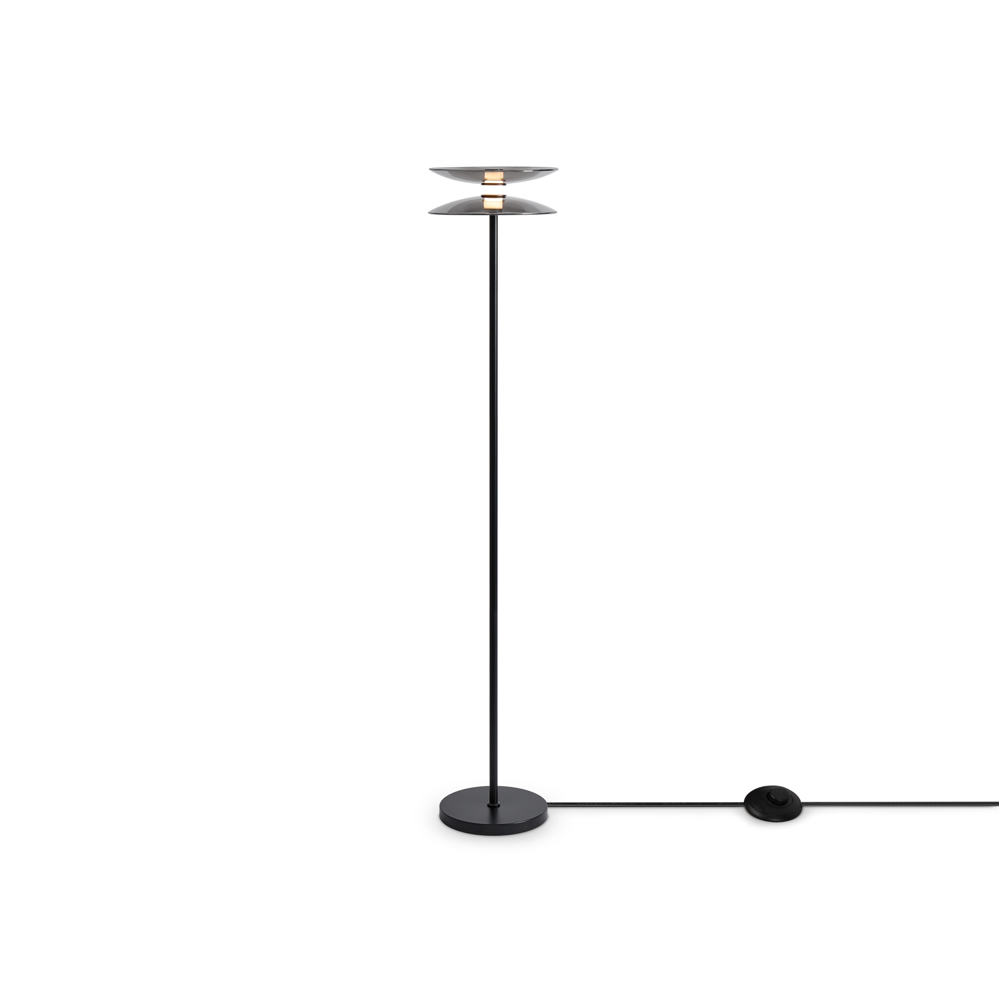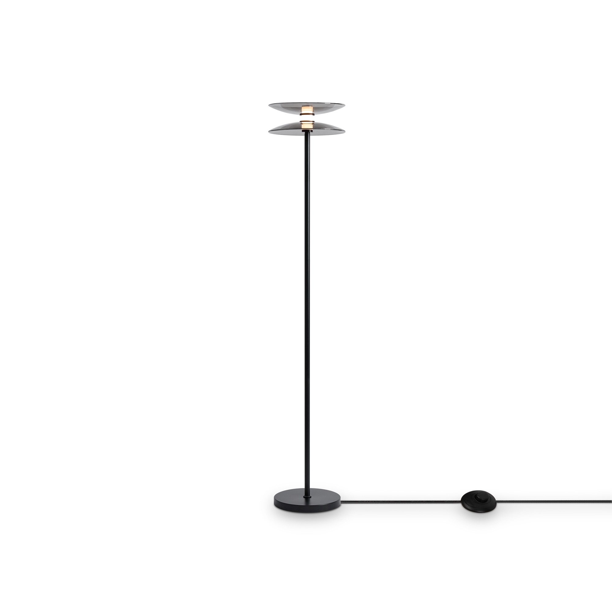 Материал арматуры — металл, цвет — черный. Плафоны выполнены из стекла дымчатого цвета. Светильники представлены в подвесном и напольном исполнении и оснащены LED-источником света с цветовой температурой 3000К. Сочетание металла и затемненного стекла создает выразительную атмосферу в современных интерьерах таких как минимализм и лофт.
