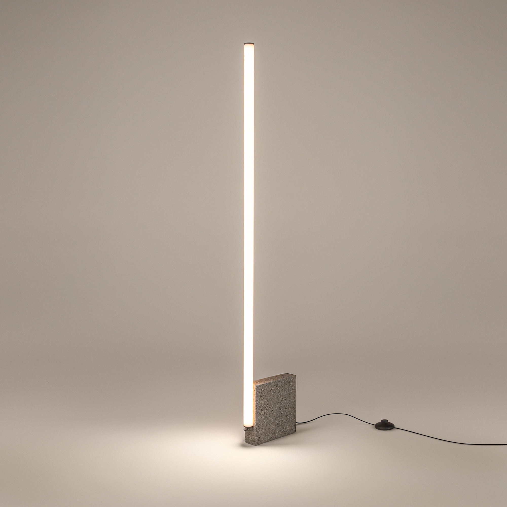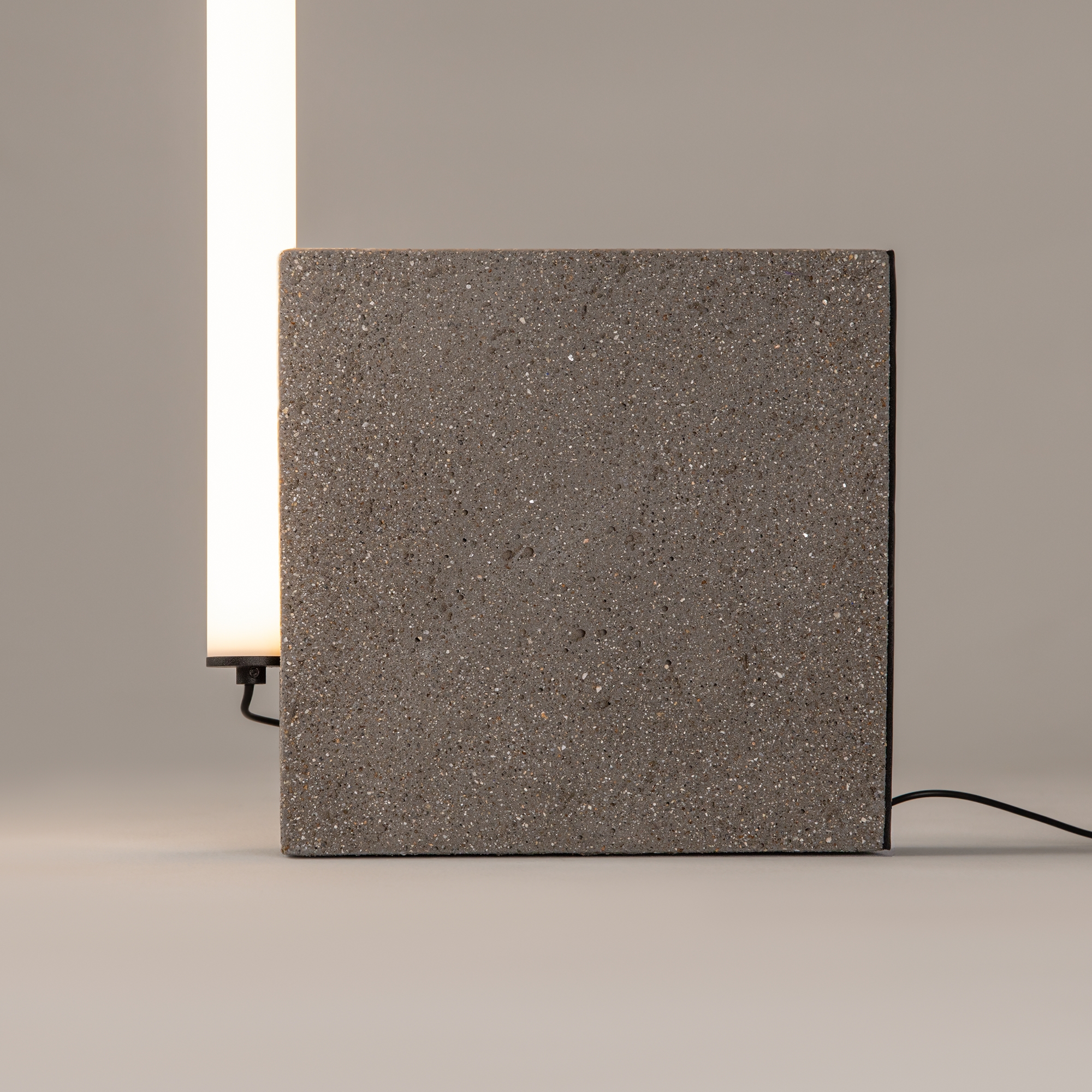 Основание из бетона, цвет — серый. LED источник света, цветовая температура 3000К. Рассеиватель: акриловая труба с встроенным светодиодным источником света. Трендовый и необычный дизайн. Устойчивая конструкция с компактным основанием для близкого размещения к стене. Управление — кнопка переключателя на проводе.