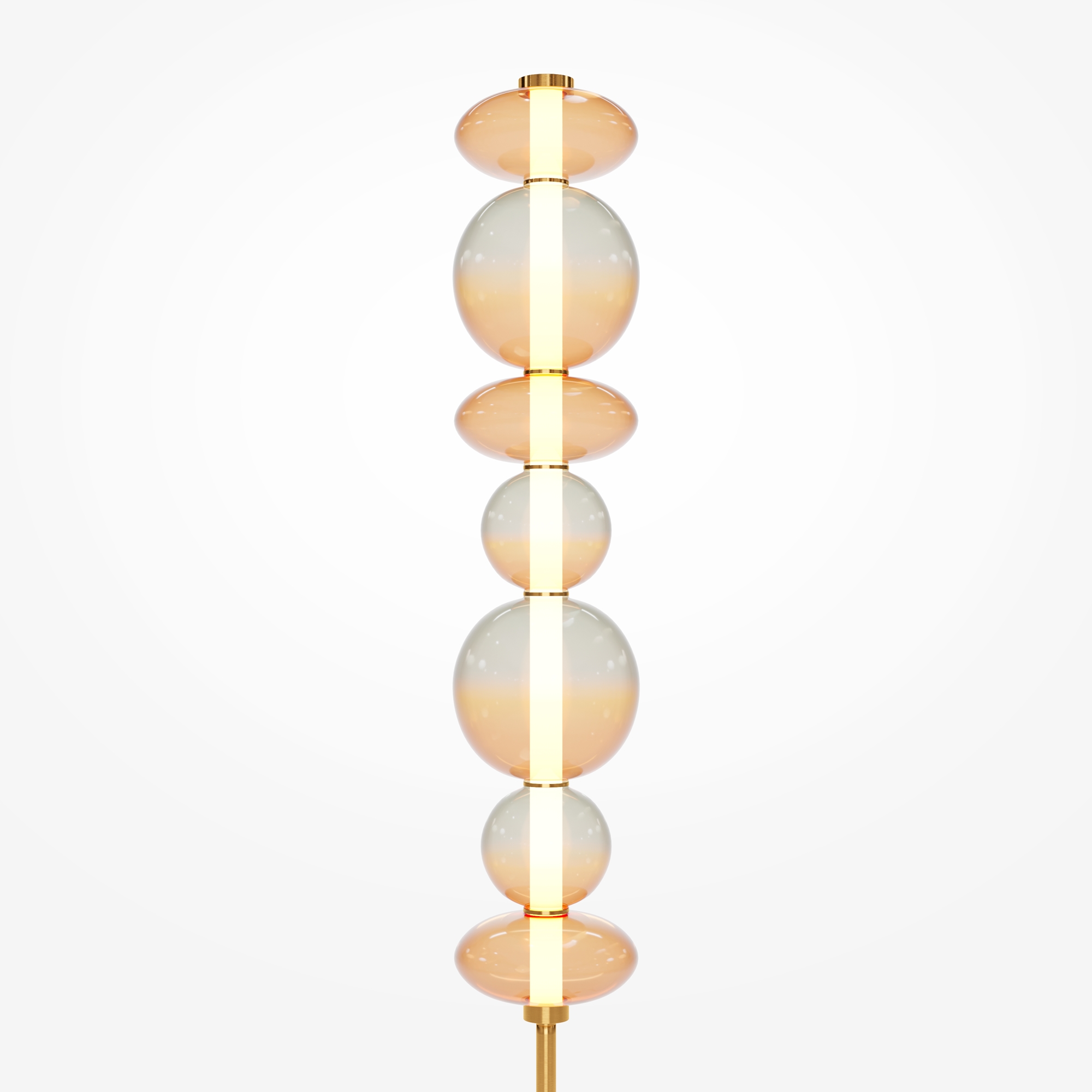 Светильники с тонированными выдувными стеклянными плафонами (дымчатыми или янтарными) и металлической арматурой (черной или цвета латуни). Окрашивание плафонов градиентное. Источник света: LED. Световой элемент установлен внутри акрилового рассеивателя. Цветовая температура источника света – 3000К, угол рассеивания — 120°. Торшеры снабжены Push-кнопкой на проводе.
