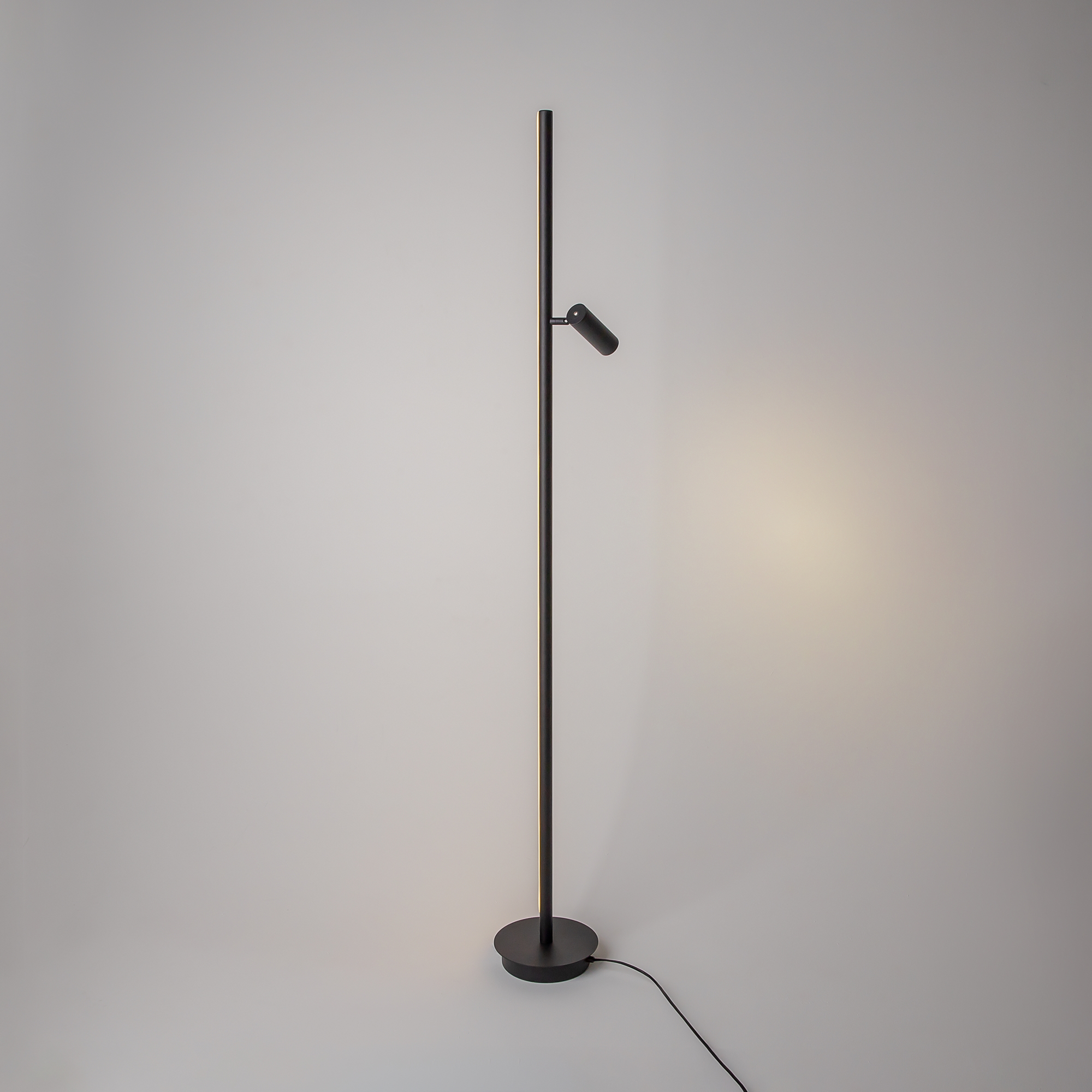 Функциональные напольные торшеры. Цвет арматуры — черный, латунный. Материал арматуры — алюминий. Два типа освещения: переотраженный, направленный. Поворотный спот для направления света на нужную зону. LED-источник света. Серия торшеров для создания многогранных световых сценариев. Особенно эффектно смотрится в интерьерах с фактурными стенами.