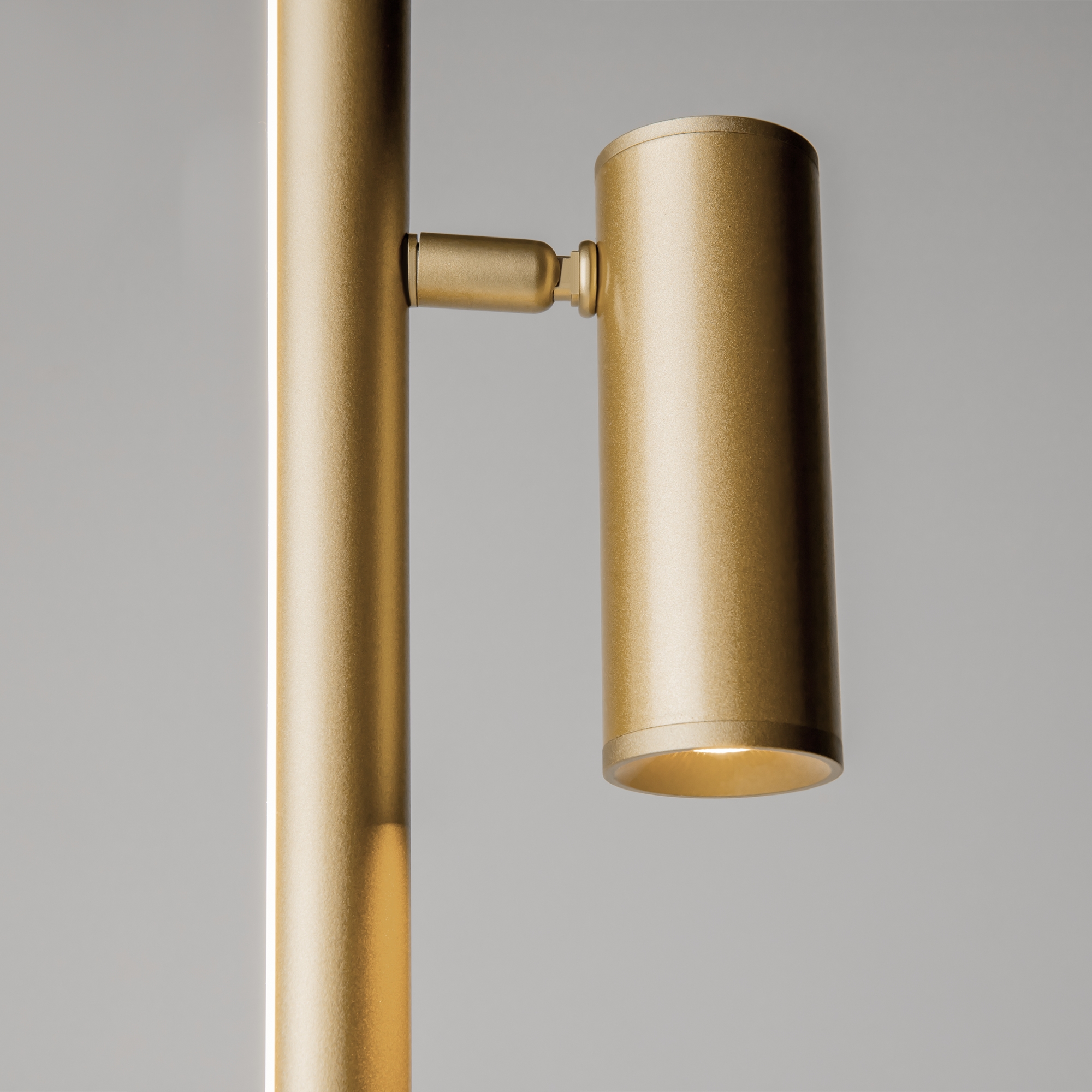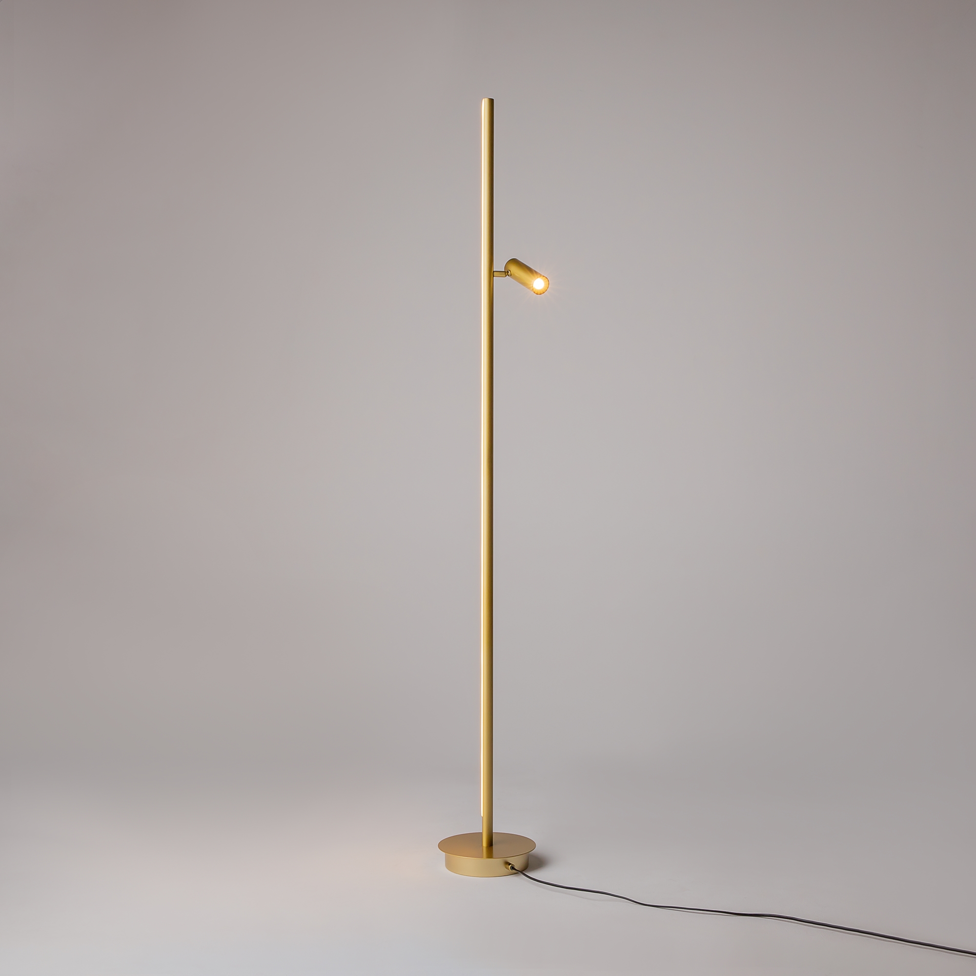Функциональные напольные торшеры. Цвет арматуры — черный, латунный. Материал арматуры — алюминий. Два типа освещения: переотраженный, направленный. Поворотный спот для направления света на нужную зону. LED-источник света. Серия торшеров для создания многогранных световых сценариев. Особенно эффектно смотрится в интерьерах с фактурными стенами.
