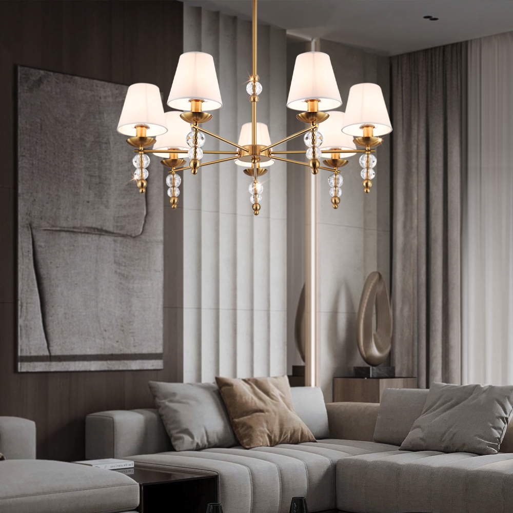 Материал абажура — ткань, цвет — белый. Металлическая арматура в цвете латунь обрамлена хрустальными бусинами. Источник света — лампы с цоколем Е14. Степень защиты — IP20.