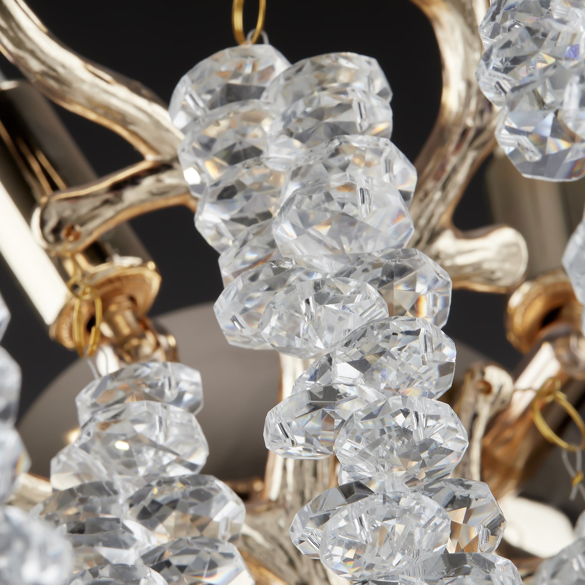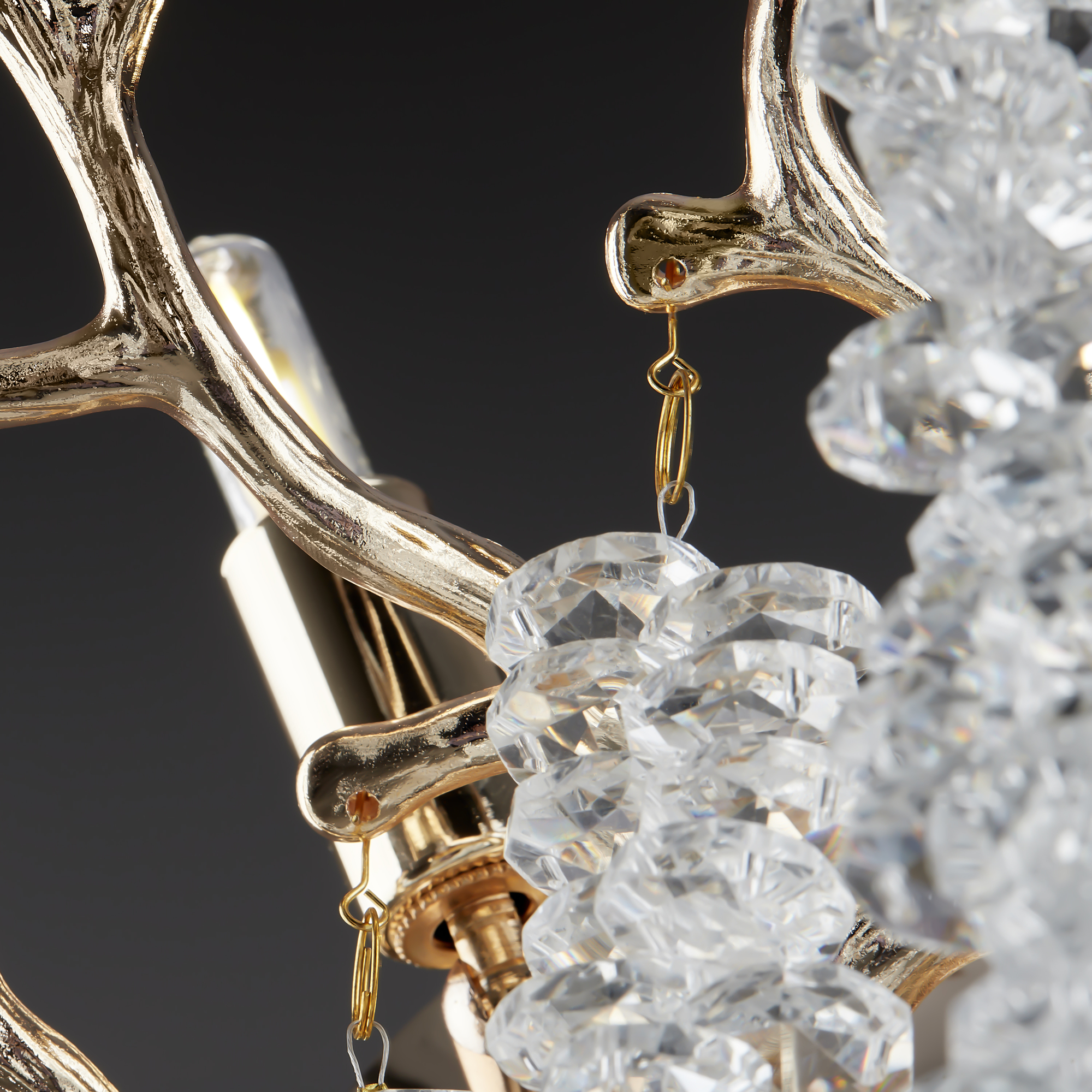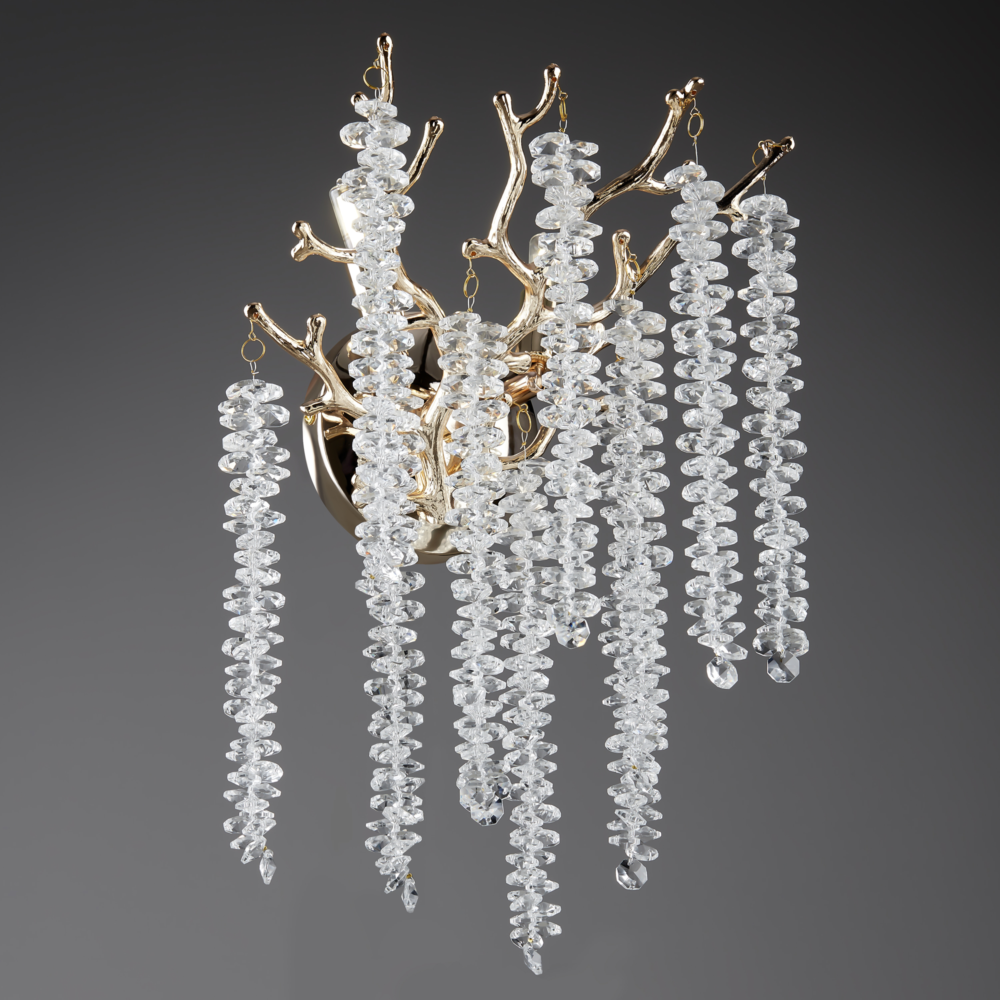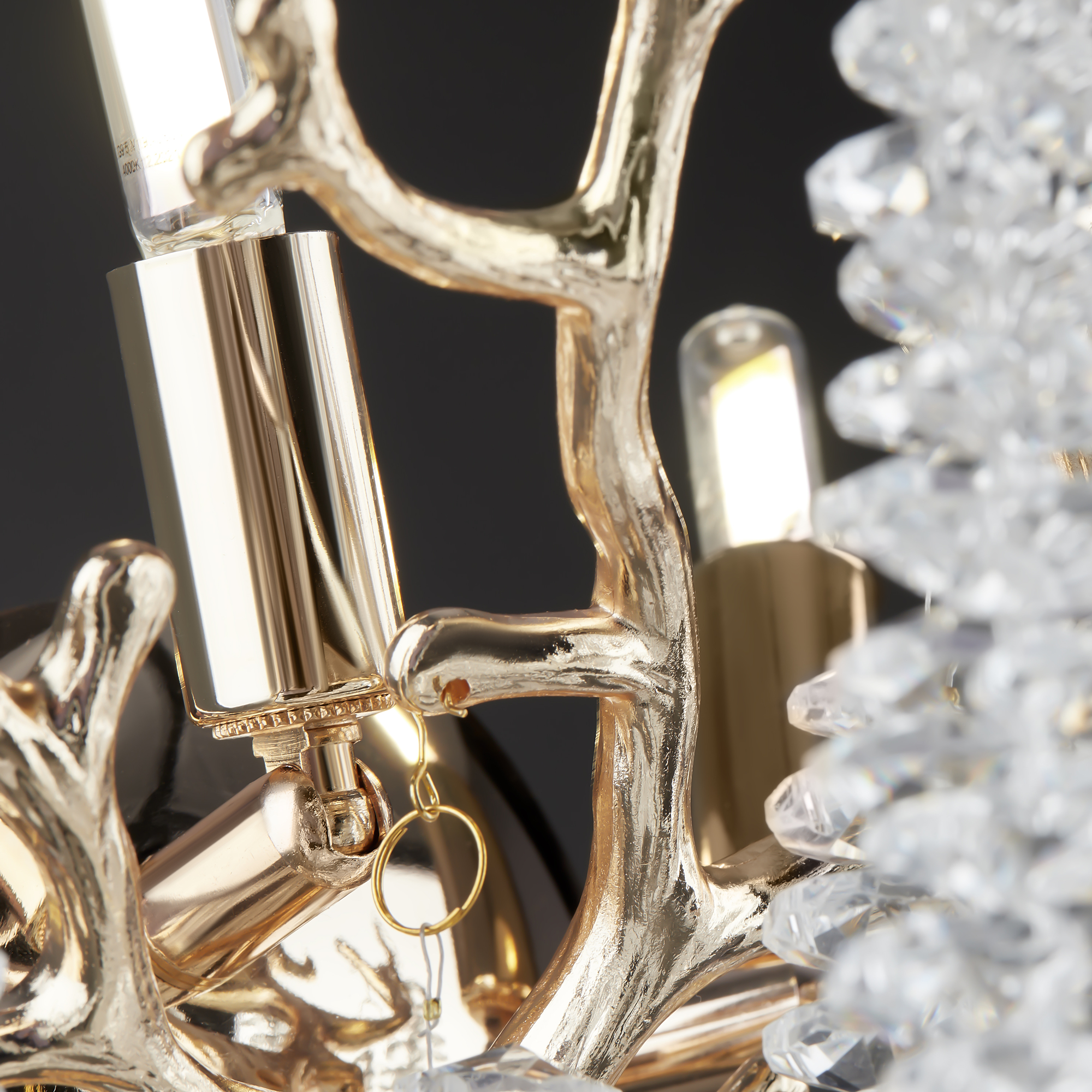 Материалы арматуры —металл, цвет — золото. Хрустальные декоративные элементы напоминают капельки - создают глубокие переливы света. Дизайн в трендовой растительной тематике. Источник света — лампа с цоколем G9 и с поворотной функцией.