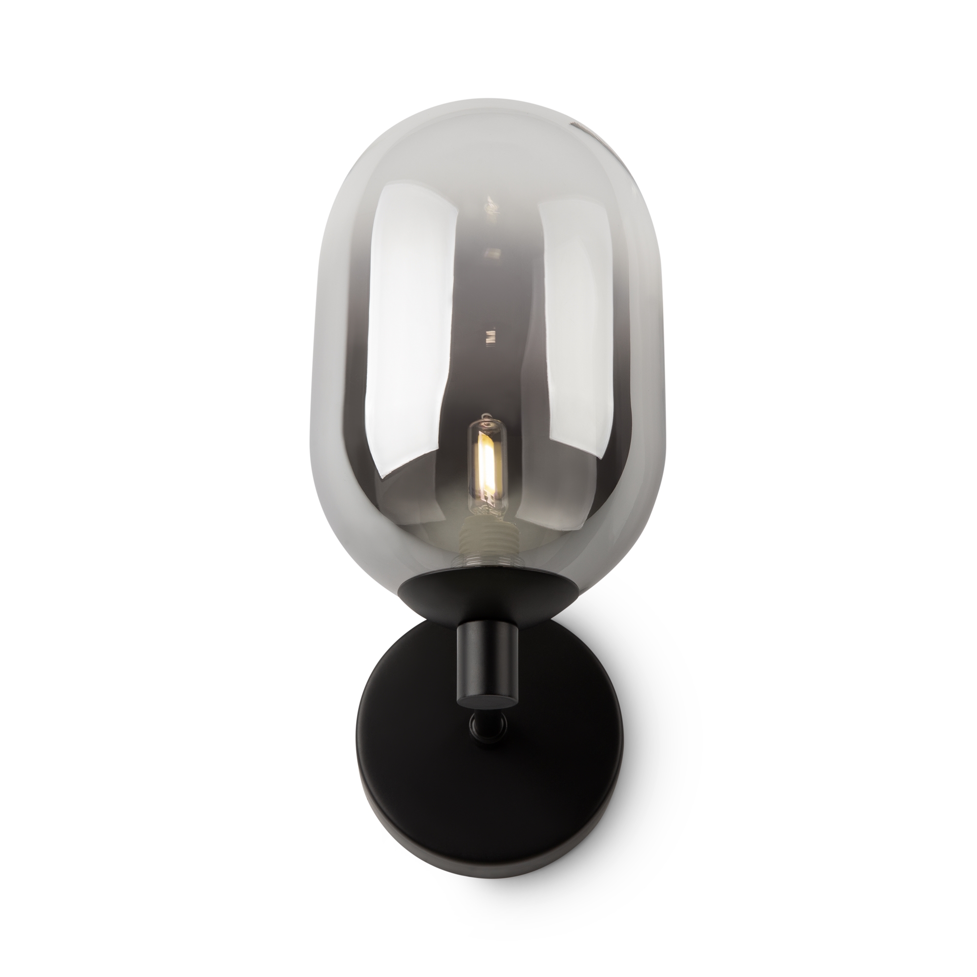Арматура из металла матового черного цвета. Плафон из стекла с окрасом растяжка. Цвет дымчатый. Модификация — настенные, потолочные и настольные светильники. Источник света — лампа. Цоколь G9.