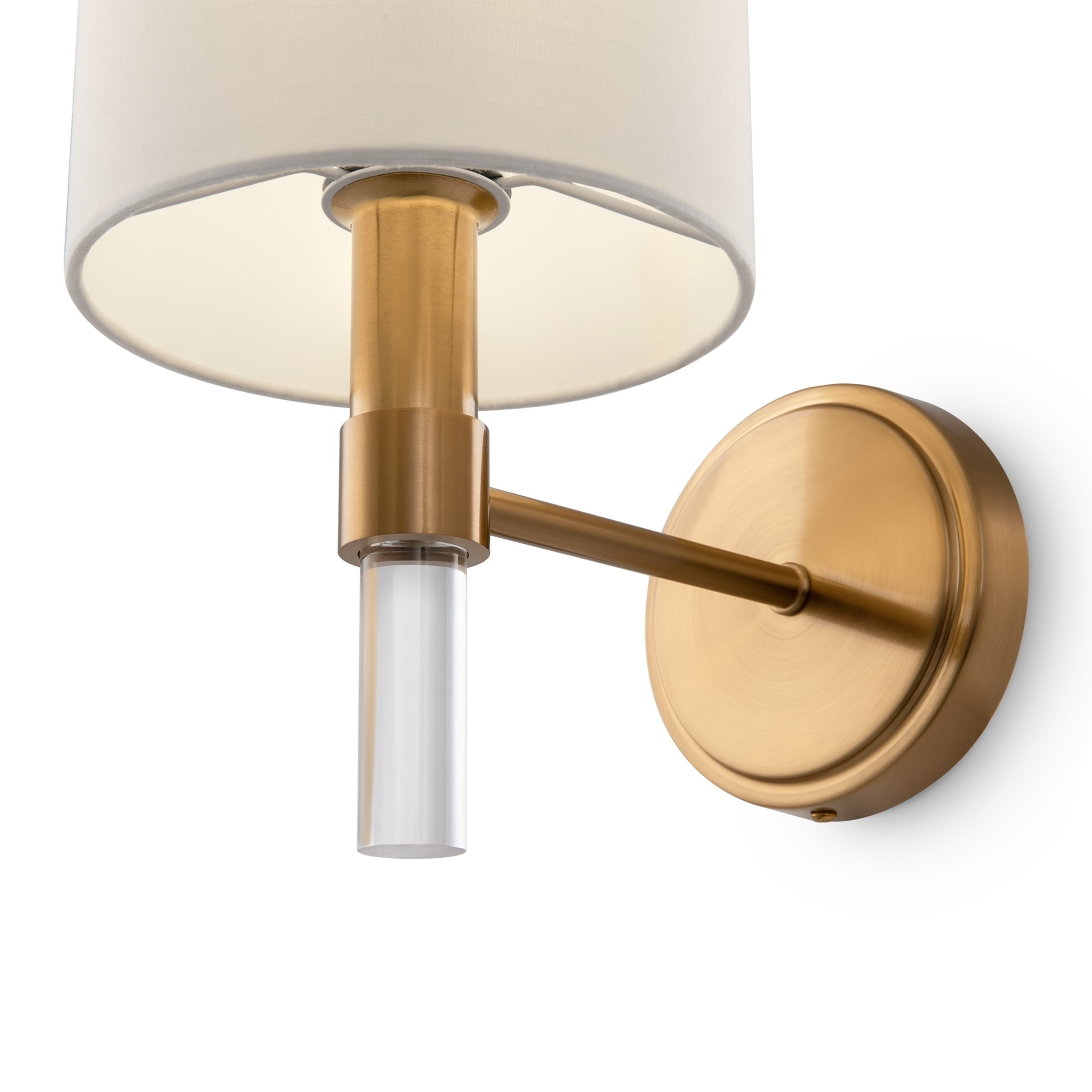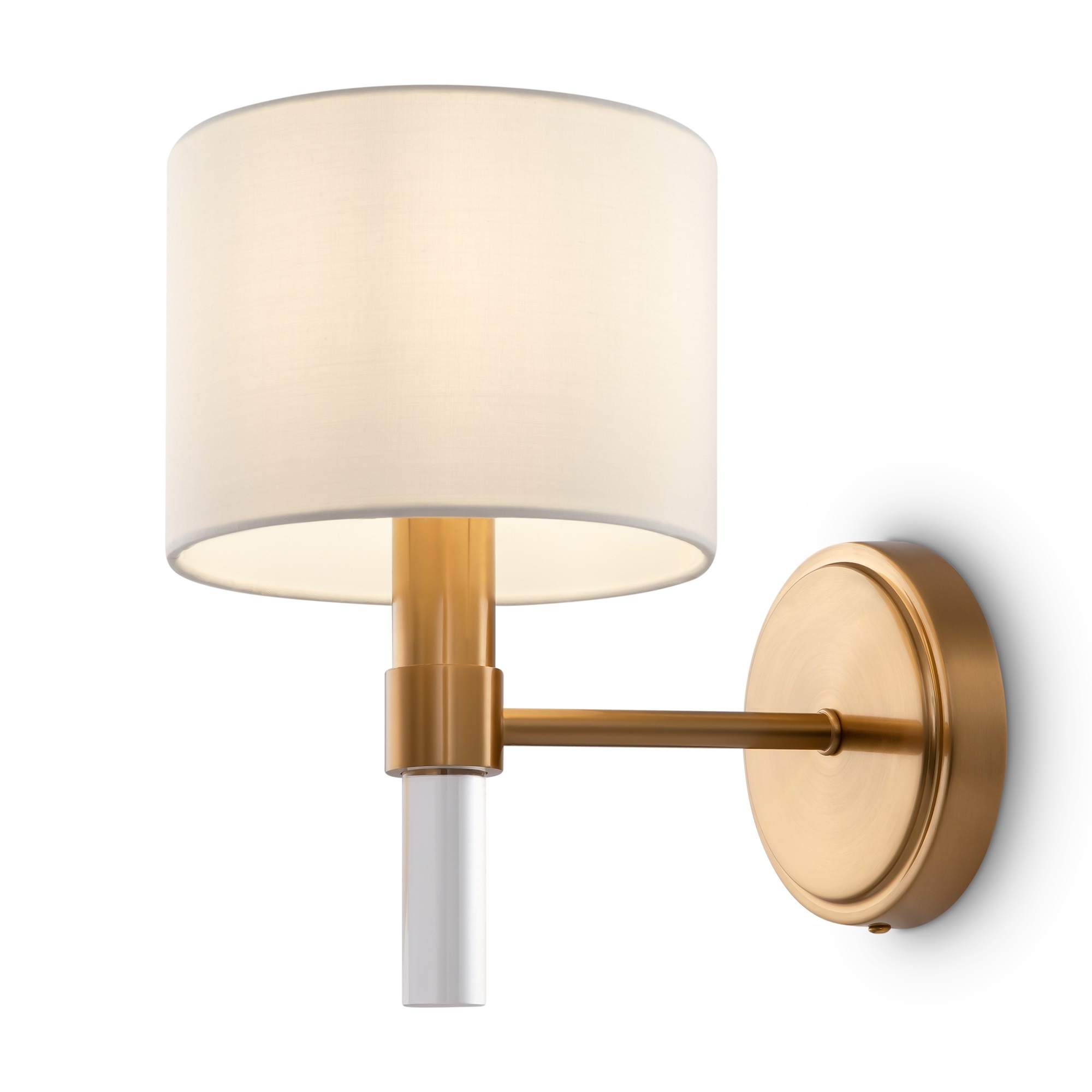Металлическая арматура. Цвет – латунь. Тканевые абажуры белого оттенка. Декор – прозрачные акриловые трубки. Трендовая комбинация фактур и материалов. Широкий ассортимент. Торшер и подвес с цоколем Е27, лампа, бра и люстры – Е14.