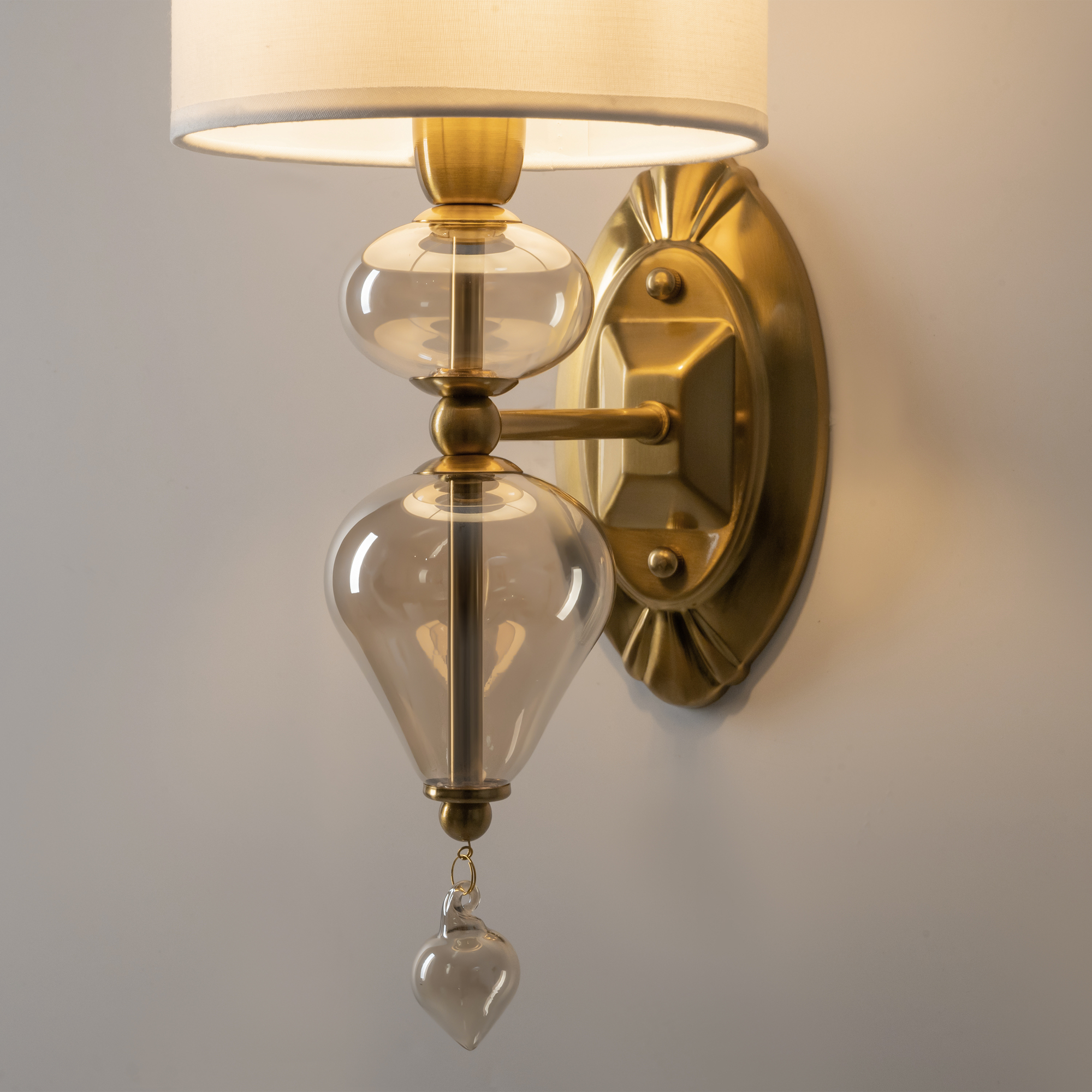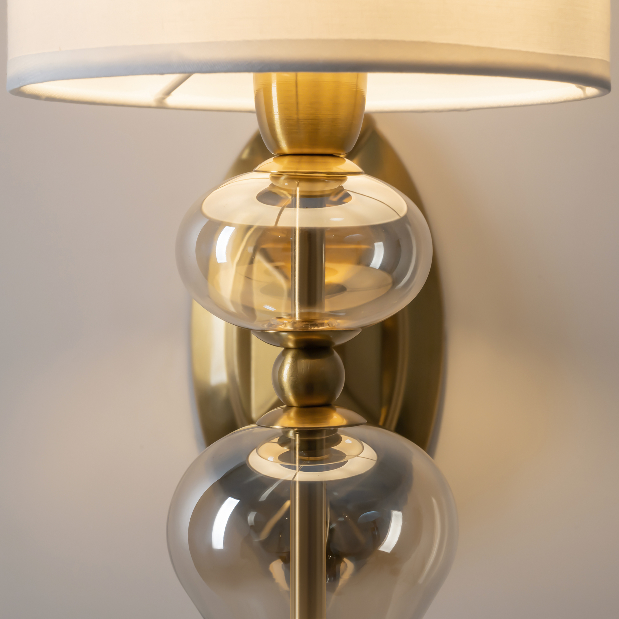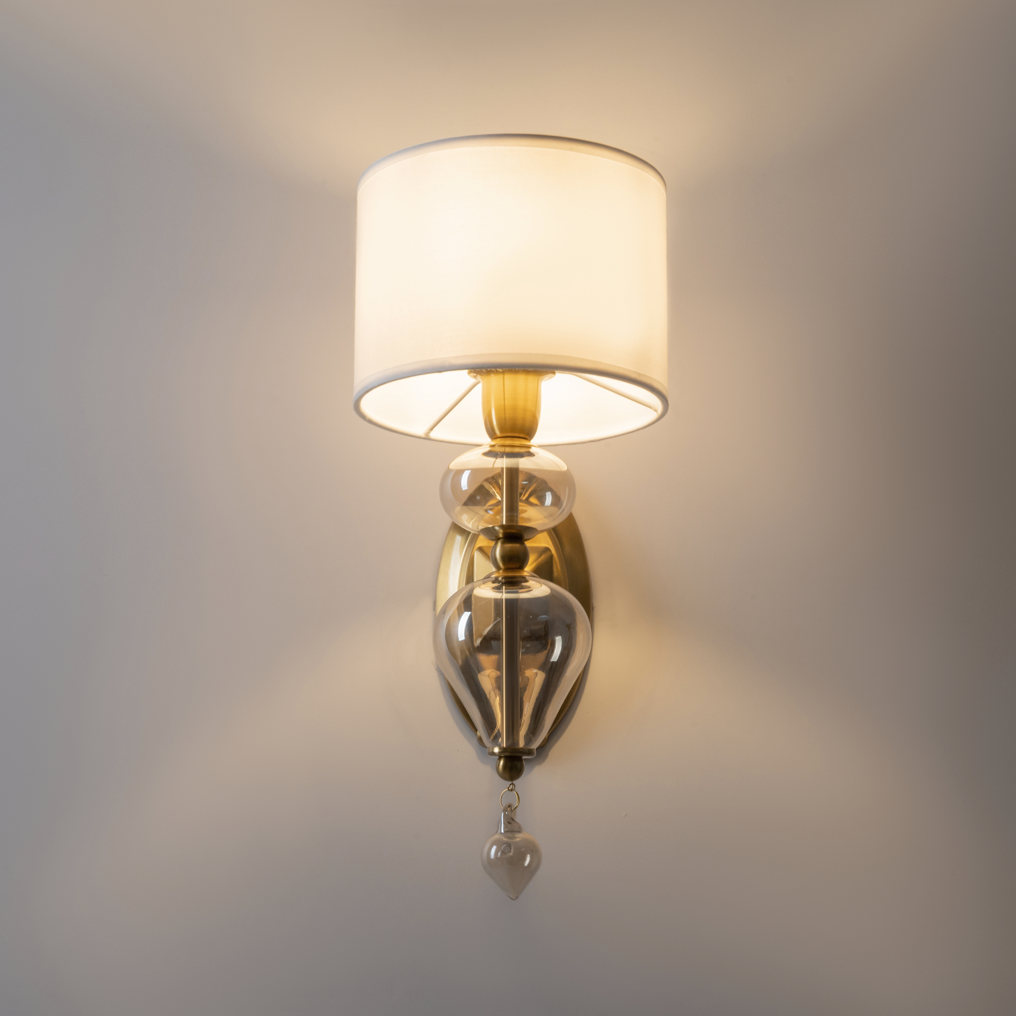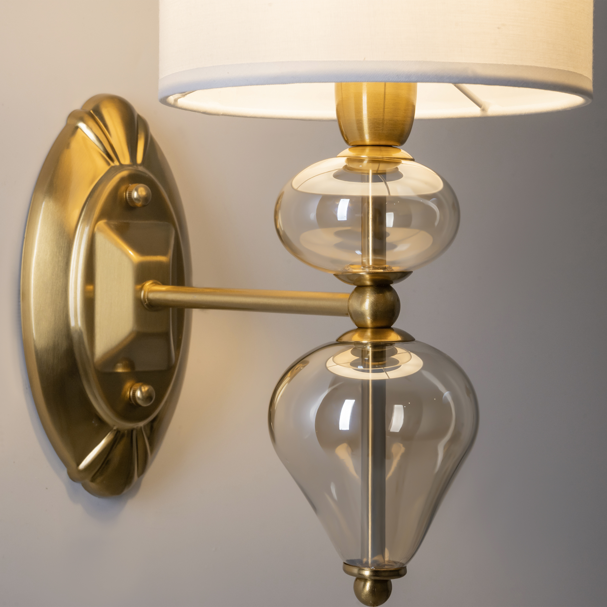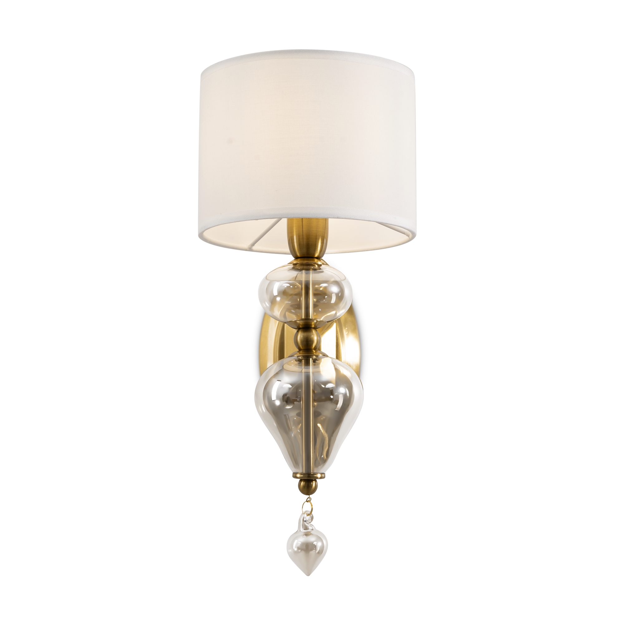 Арматура из металла, цвет — латунь. Плафоны — тканевые, молочного цвета. Металлическая конструкция декорирована выдувными стеклянными элементами с перламутровым напылением. Источником света служит лампа с цоколем Е14.