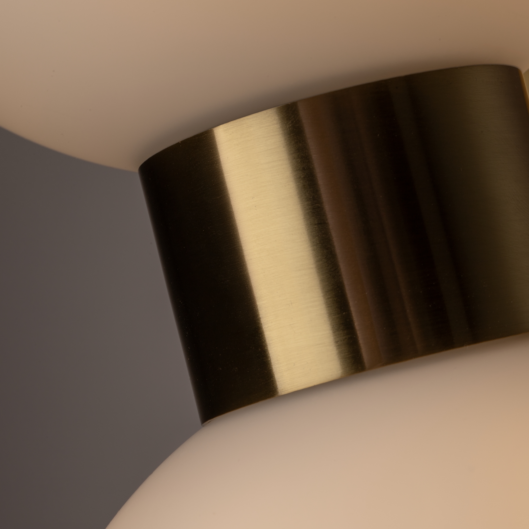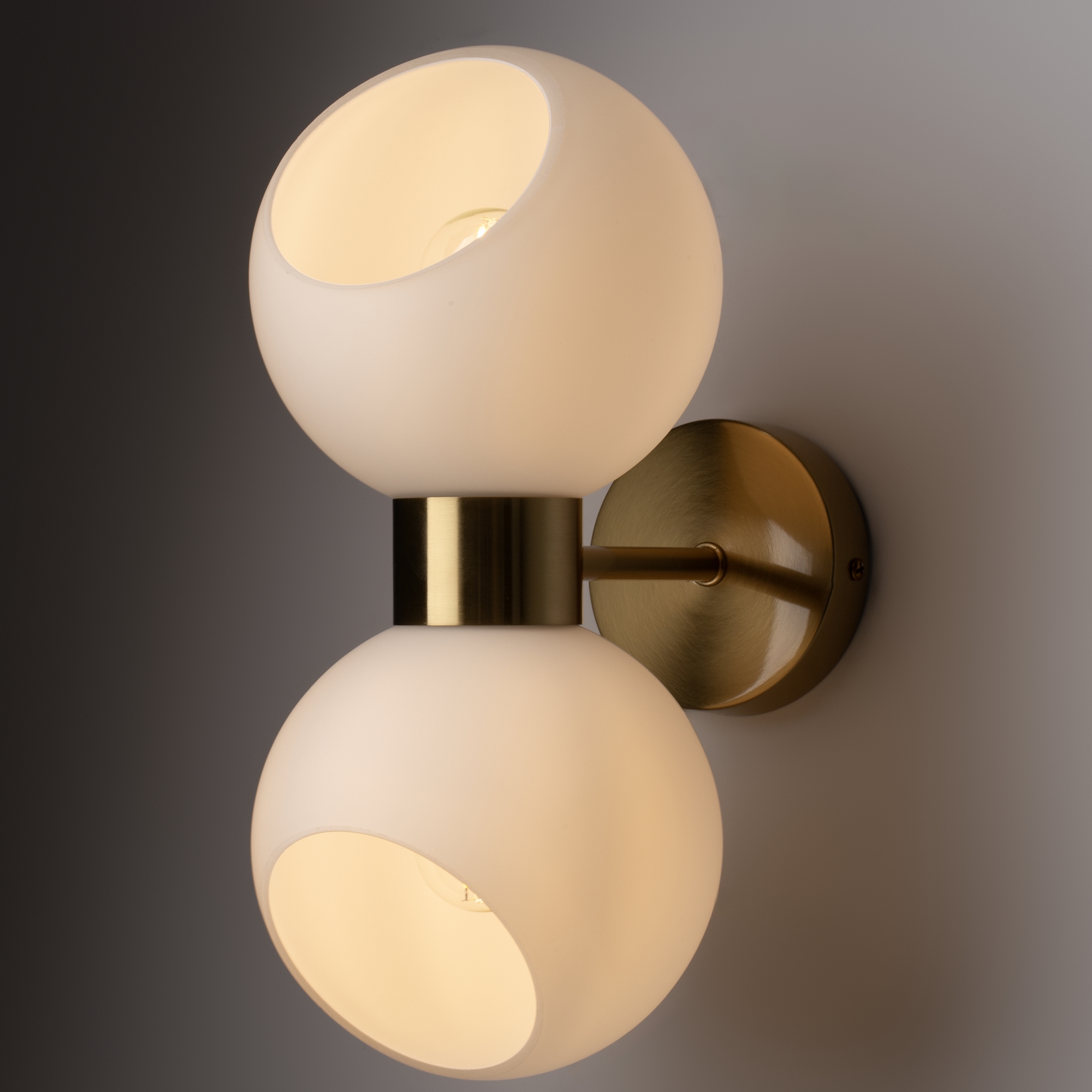 Металлическая арматура в цвете латунь. Открытые сферические плафоны в 2-х цветах: тёплый белый и тёмный гальванизированный. Плафоны разделены металлической вставкой в цвет арматуры. Источником света является лампа с цоколем G9. Для бра - цоколь Е27.