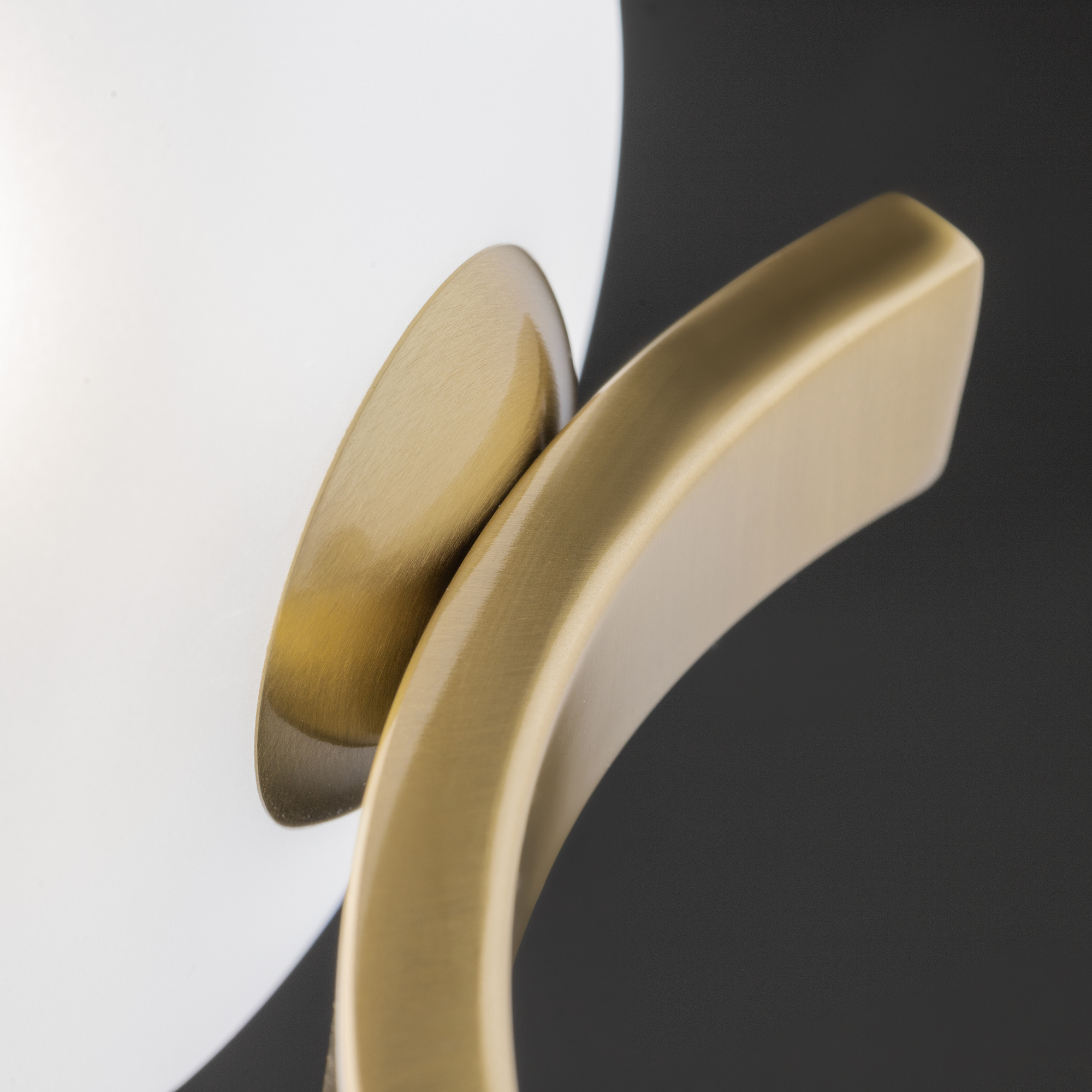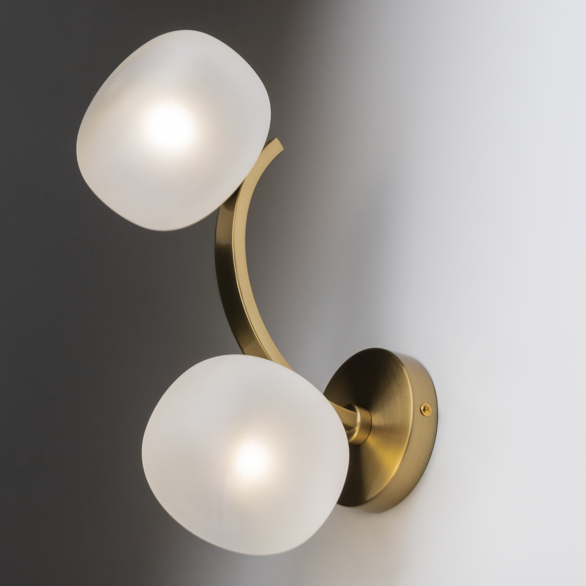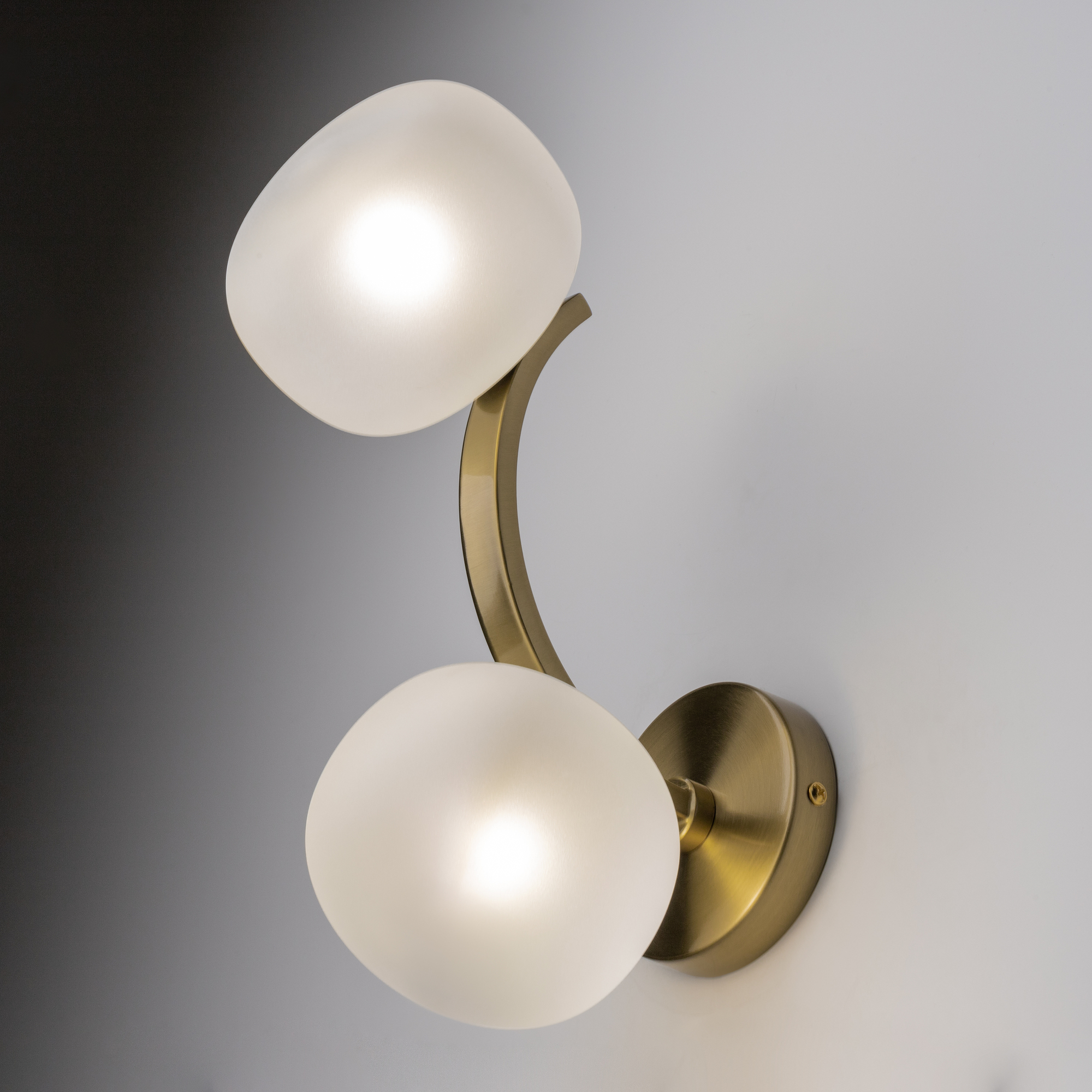 Арматура - металл. Цвет арматуры - латунь. Серия с необычной формой плафонов — немного приплюснутые, матовые белые. Настольные лампы и настенные бра выгнутой формы. Источник света лампа. Цоколь G9.