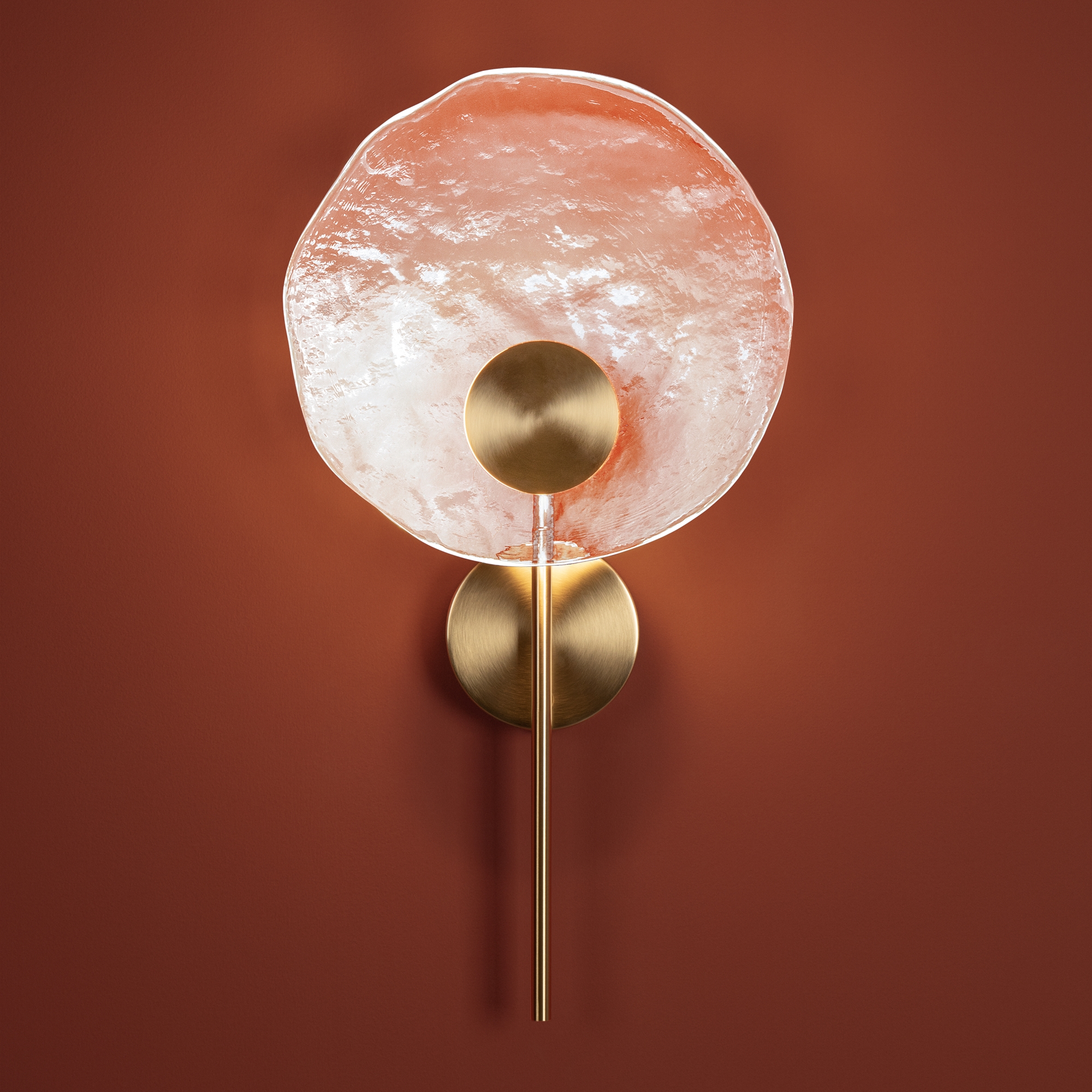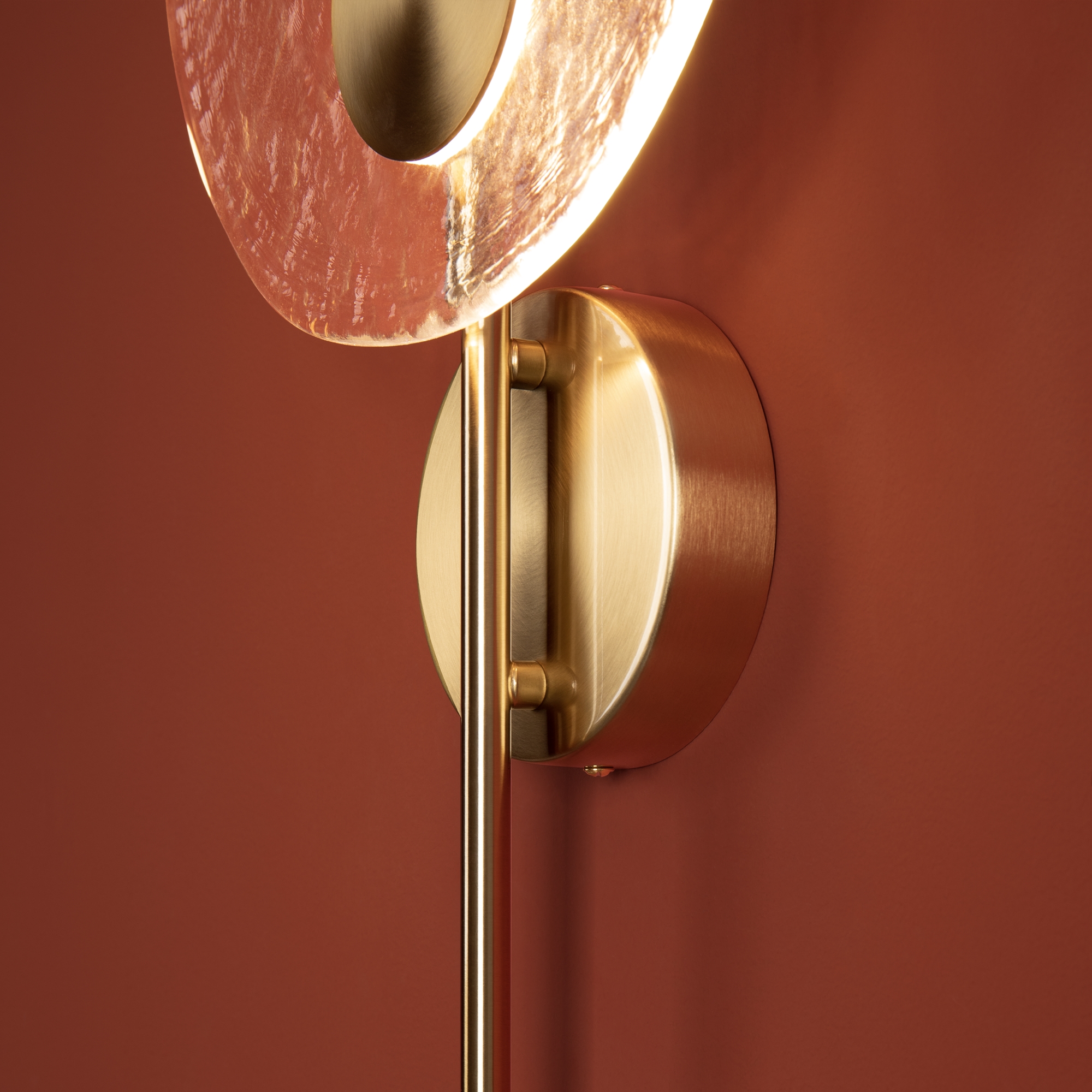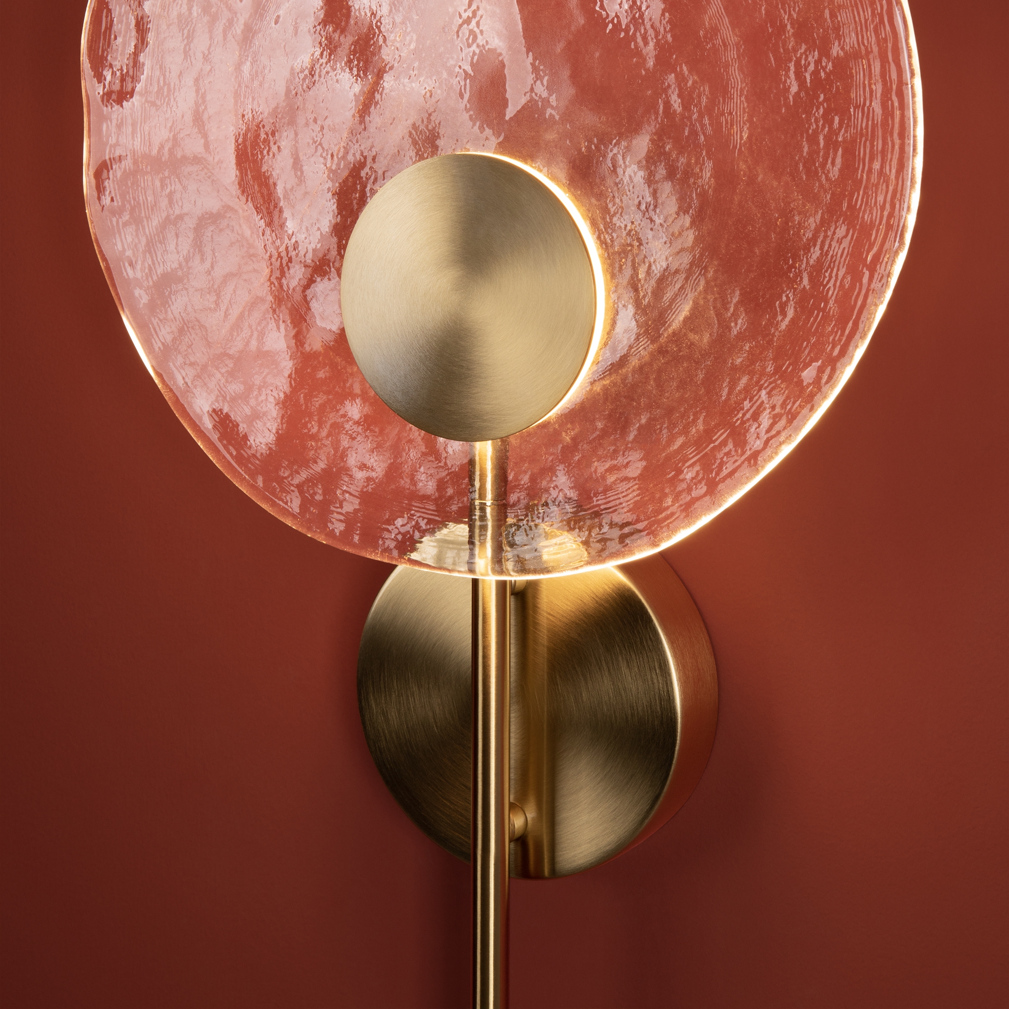 Материал арматуры — металл, цвет — латунь. Настенные светильники оснащены LED-источником света с цветовой температурой 2700К. Уникальное стекло ручного производства обеспечивает равномерное свечение всей поверхности плафона. Для достижения наилучшего светового эффекта рекомендуется использовать в сочетании с основными источниками света.