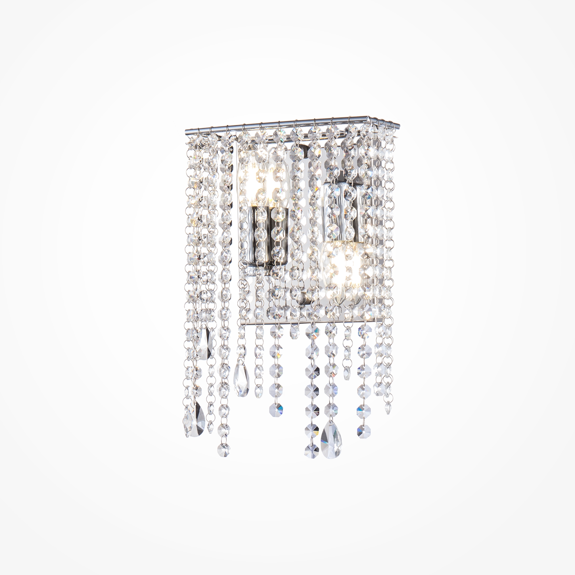 Арматура из металла в цвете хром. Декор – подвески из прозрачного хрусталя. Оригинальная прямоугольная форма. Высота светильников регулируется тросом.