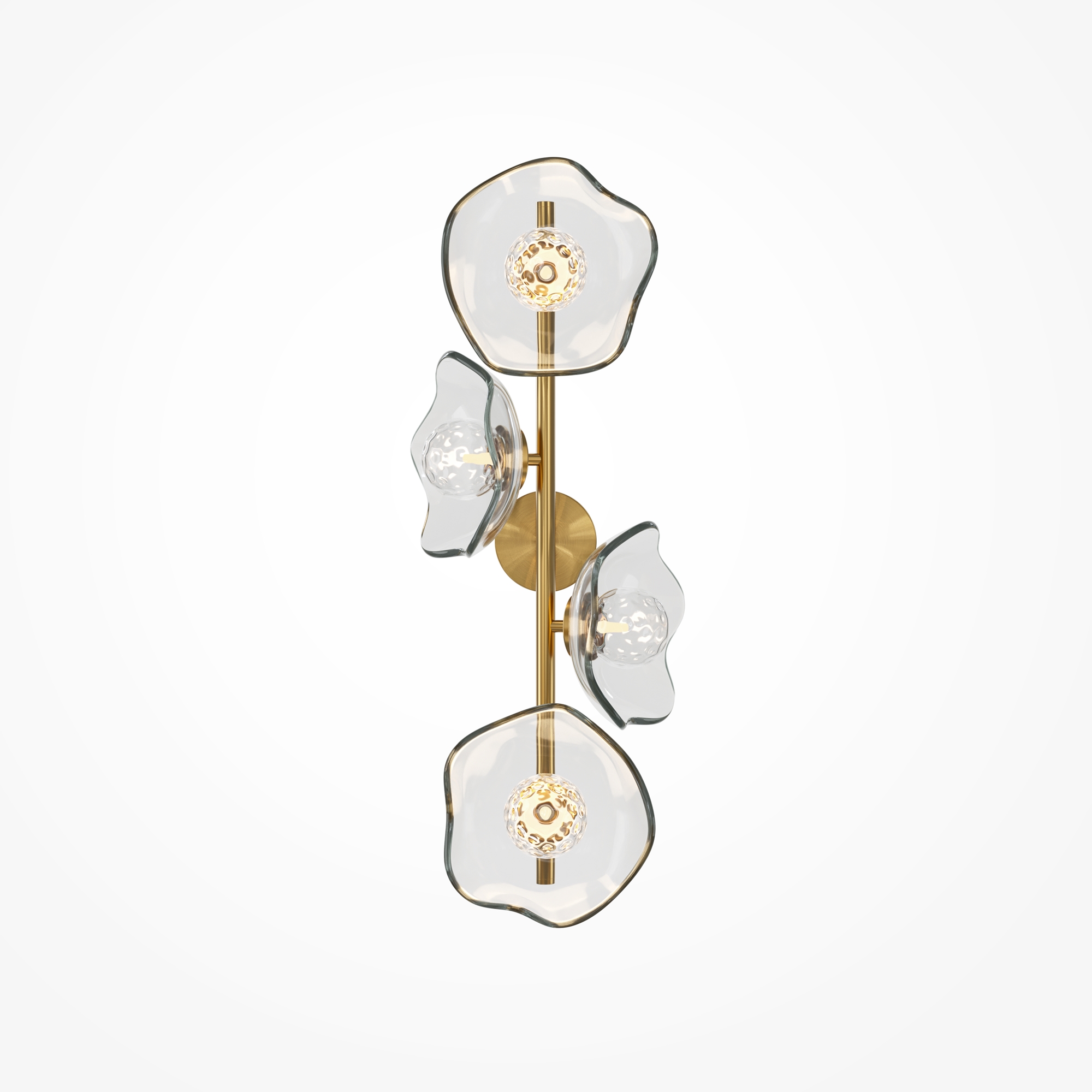 Арматура - металл, цвет - латунь. Плафоны-соцветия из литого стекла в плавных формах. Эффектные световые блики на плавных рельефах плафона. Источник света - лампа с цоколем G9.