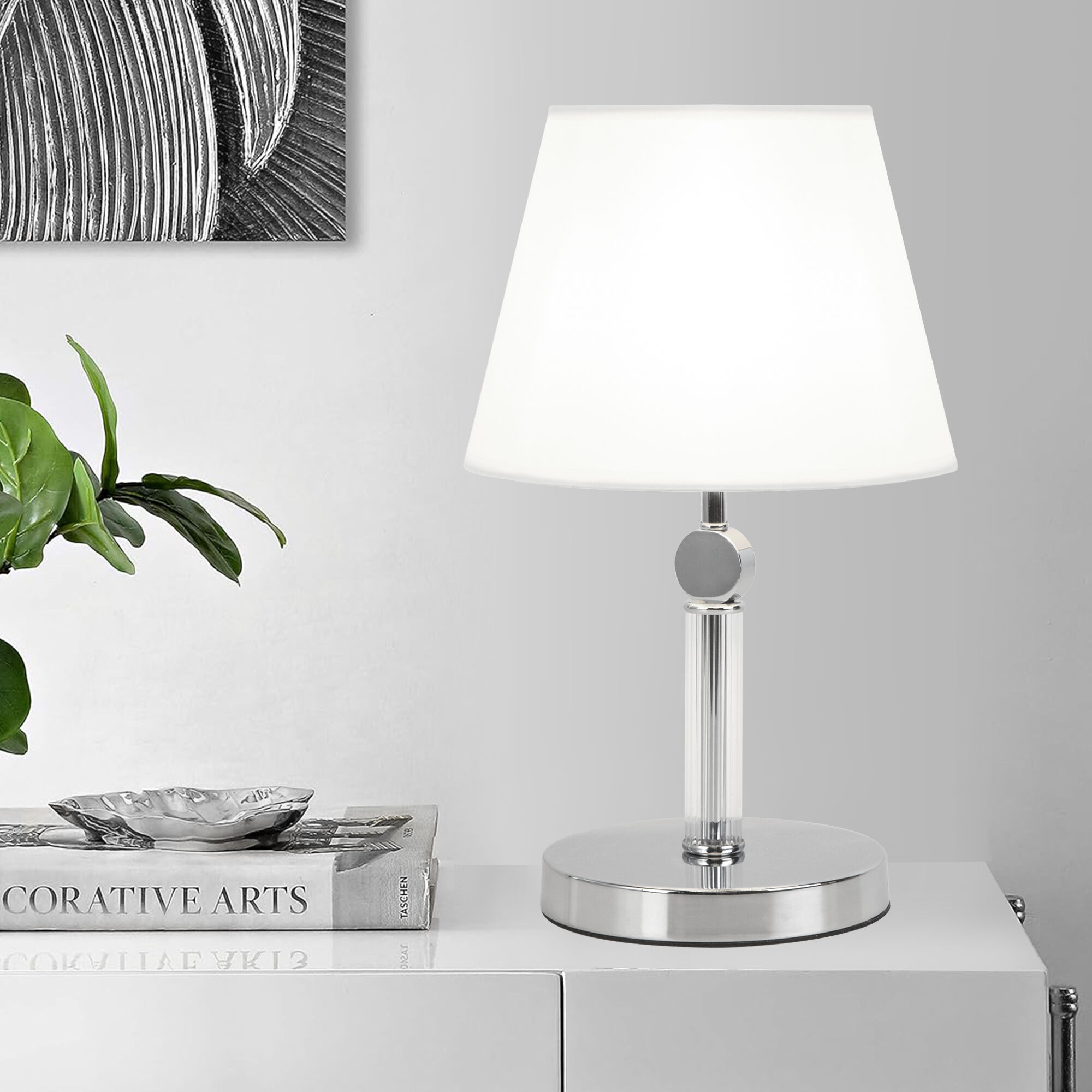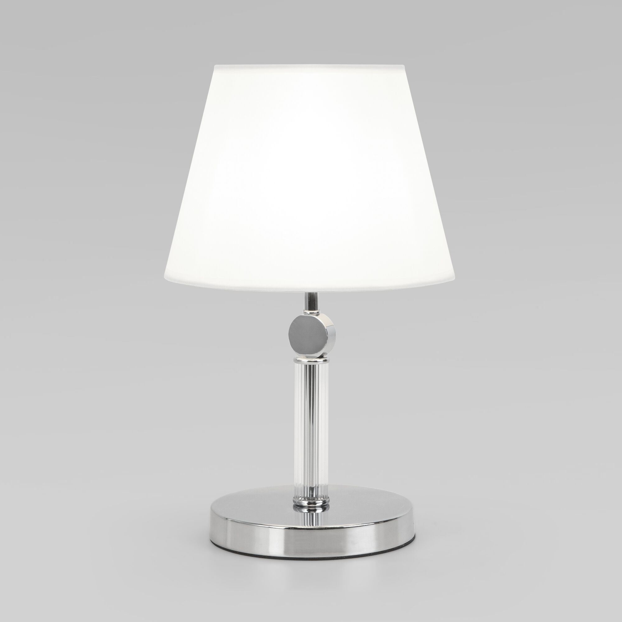 Элегантный настольный светильник Conso соединяет в себе изысканный прованс и аристократичность. В дизайне светильника использован изящный тканевый абажур, дающий мягкое рассеянное свечение, и утонченный декор арматуры цвета хром.