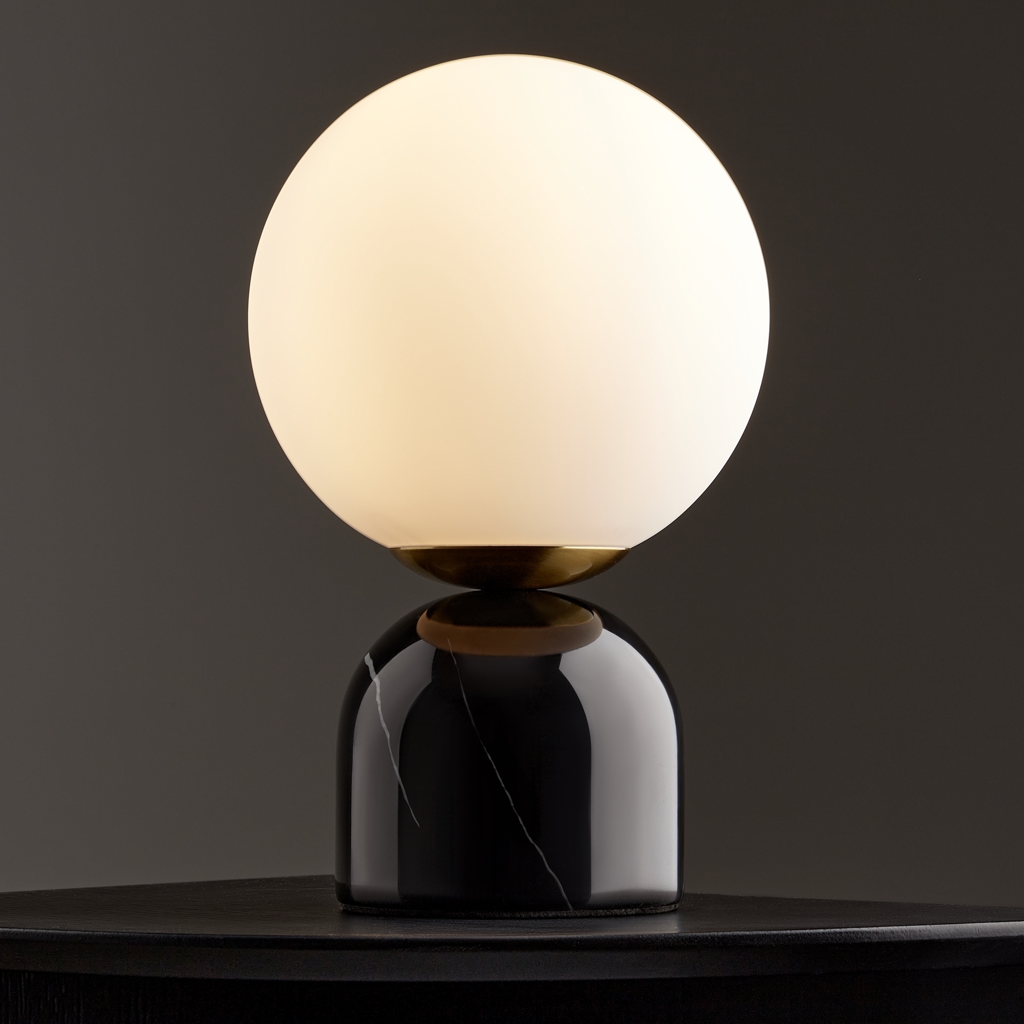 Материал основания — натуральный мрамор с уникальным рисунком. Цвета — белый, черный. Шаровидный плафон. Источник света — лампа с цоколем E14.