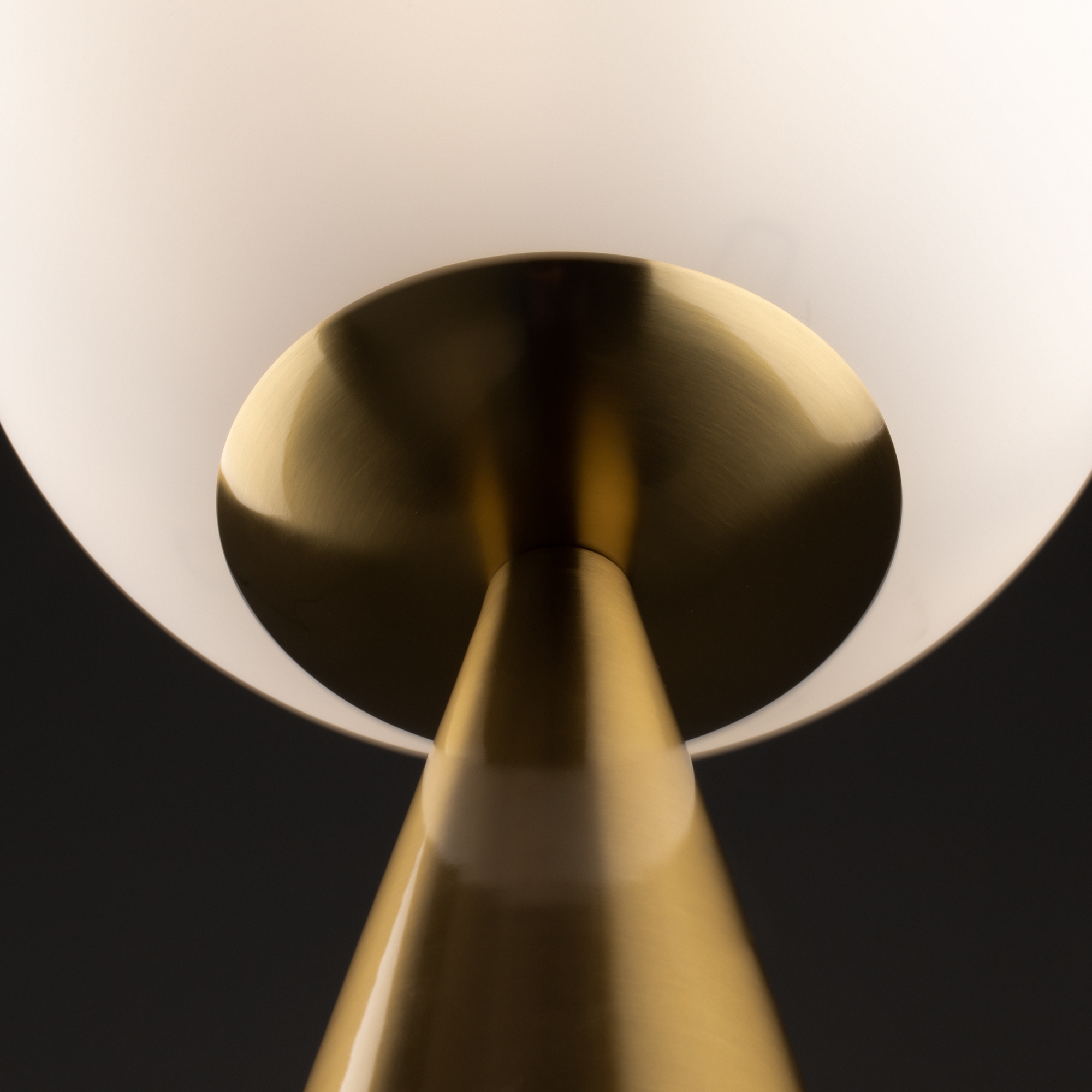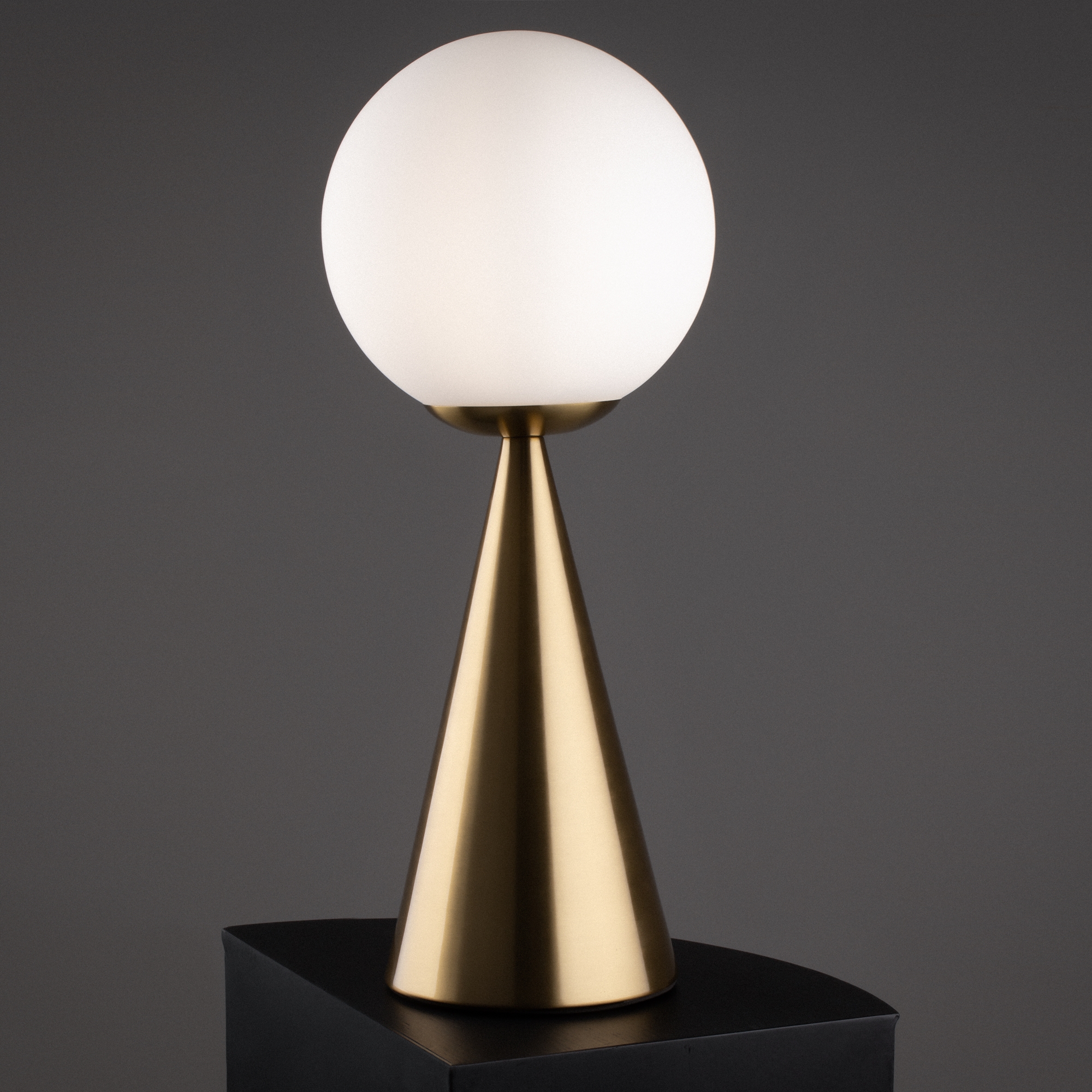 Материал арматуры — металл, цвета - латунь, черный. Плафон-сфера из белого матового цвета. Функция Touch позволяет включать и выключать свет. Источник света - лампа с цоколем Е14.