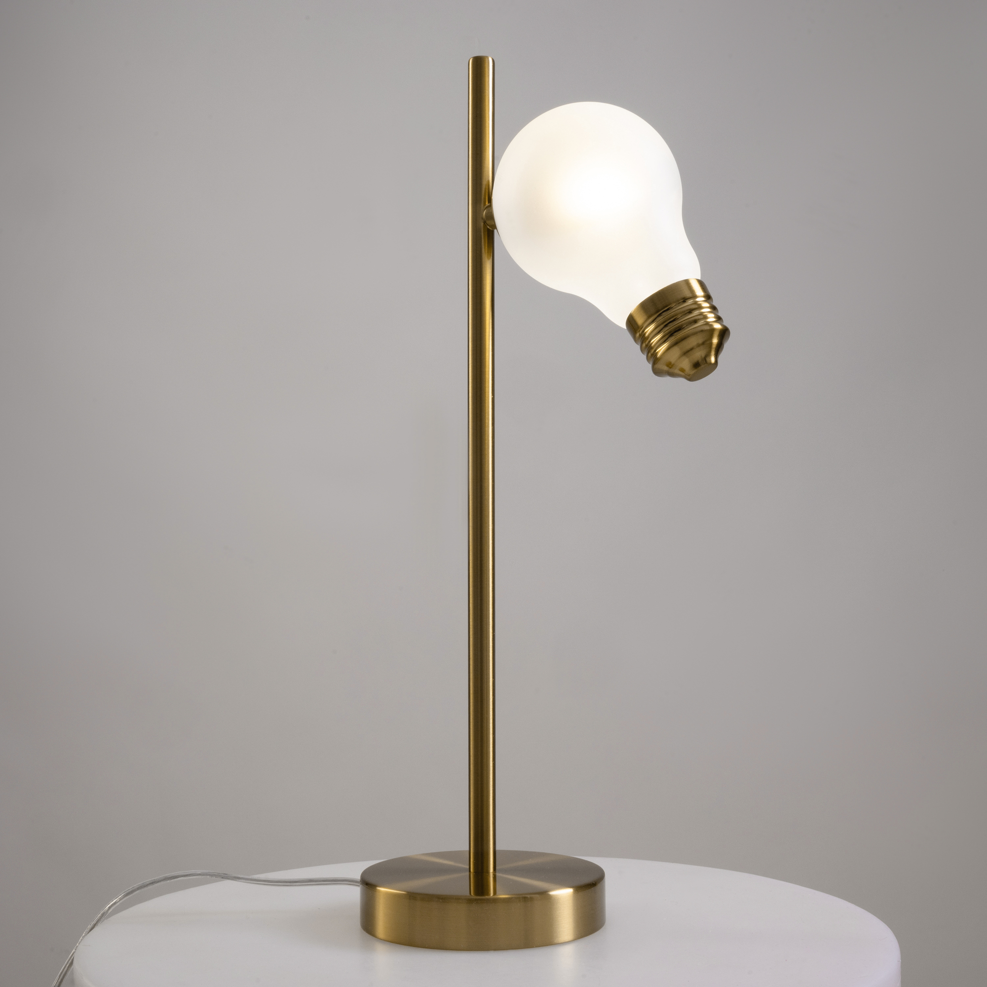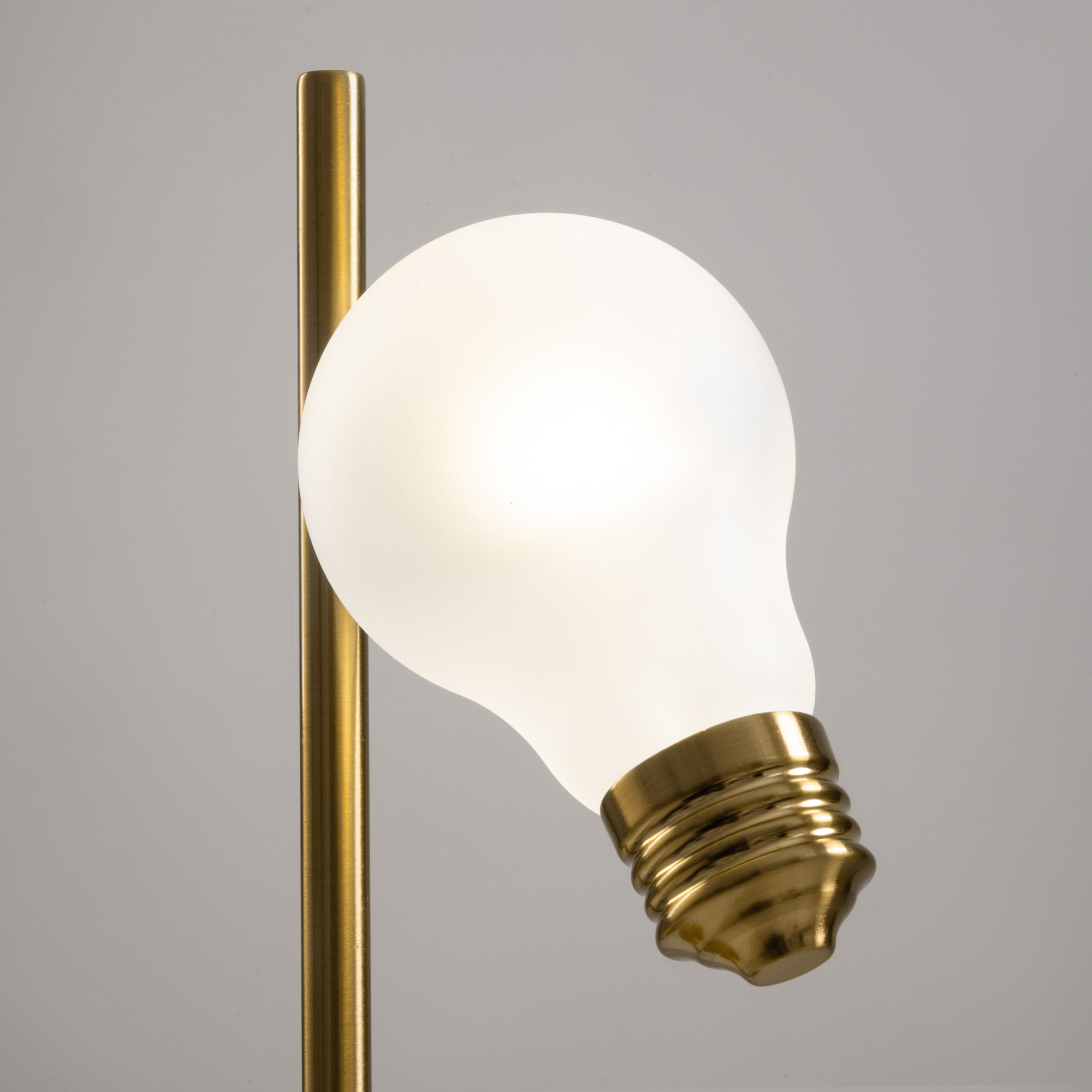 Металлическая арматура, цвета — чёрный и латунь. Прозрачные плафоны-лампочки из стекла в тон арматуры хаотично “разбросаны” по острову светильника. Подвесы регулируются по высоте. Источник света — лампа с цоколем G9.
