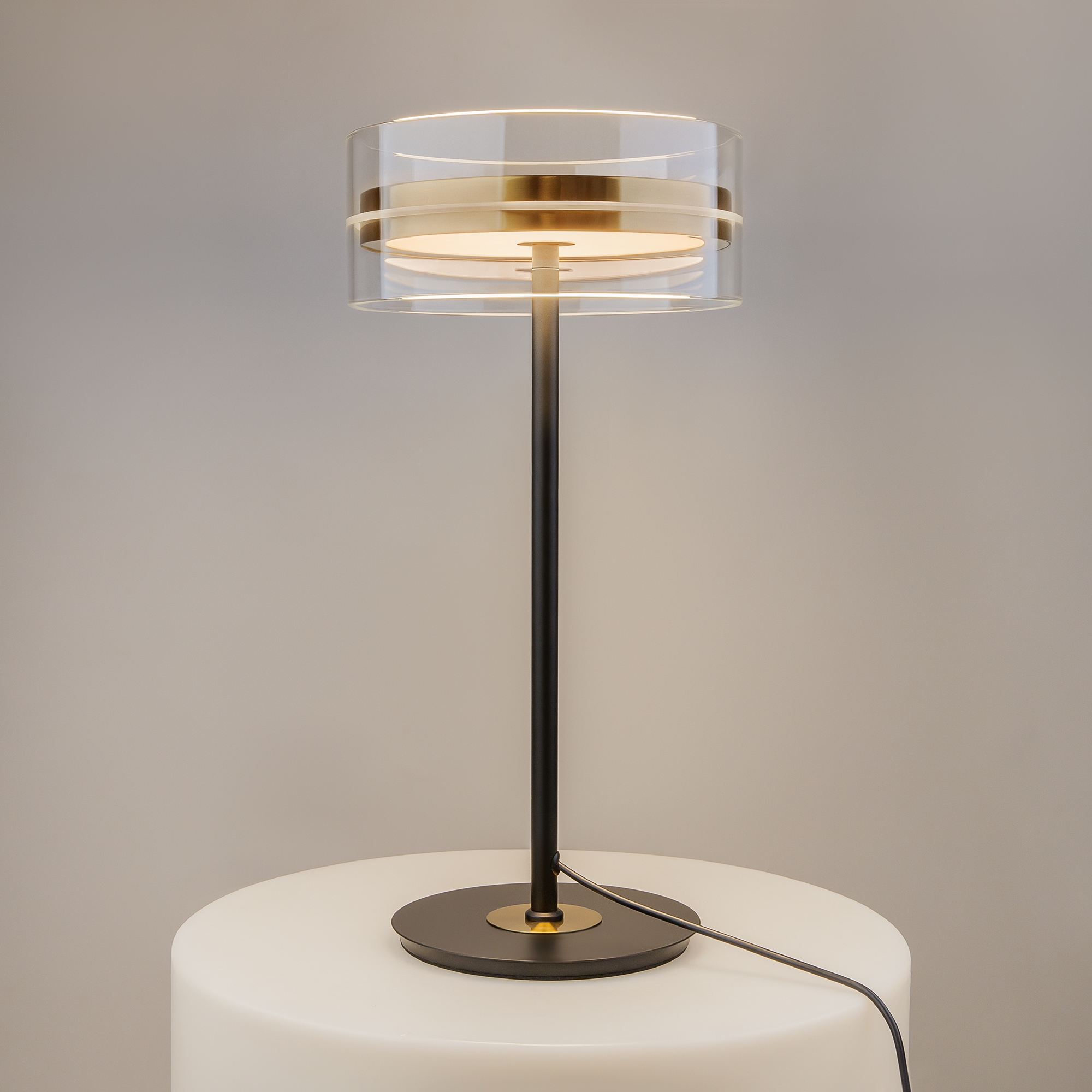 Плафоны подчеркнуто лаконичной формы в виде правильного цилиндра из стекла, дополненные металлической комбинированной черно-латунной арматурой. Источник света: LED. Цветовая температура — 3000К, угол рассеивания — 120 градусов. Провод длиной 3 метра можно регулировать. Светильники серии оснащены функцией диммирования: бесступенчатое управление у настольного светильника, а также 3 ступени регулировки - у торшера, подвесных и потолочного светильников. Светильники серии Dress code отличаются строгим и сдержанным дизайнерским оформлением.