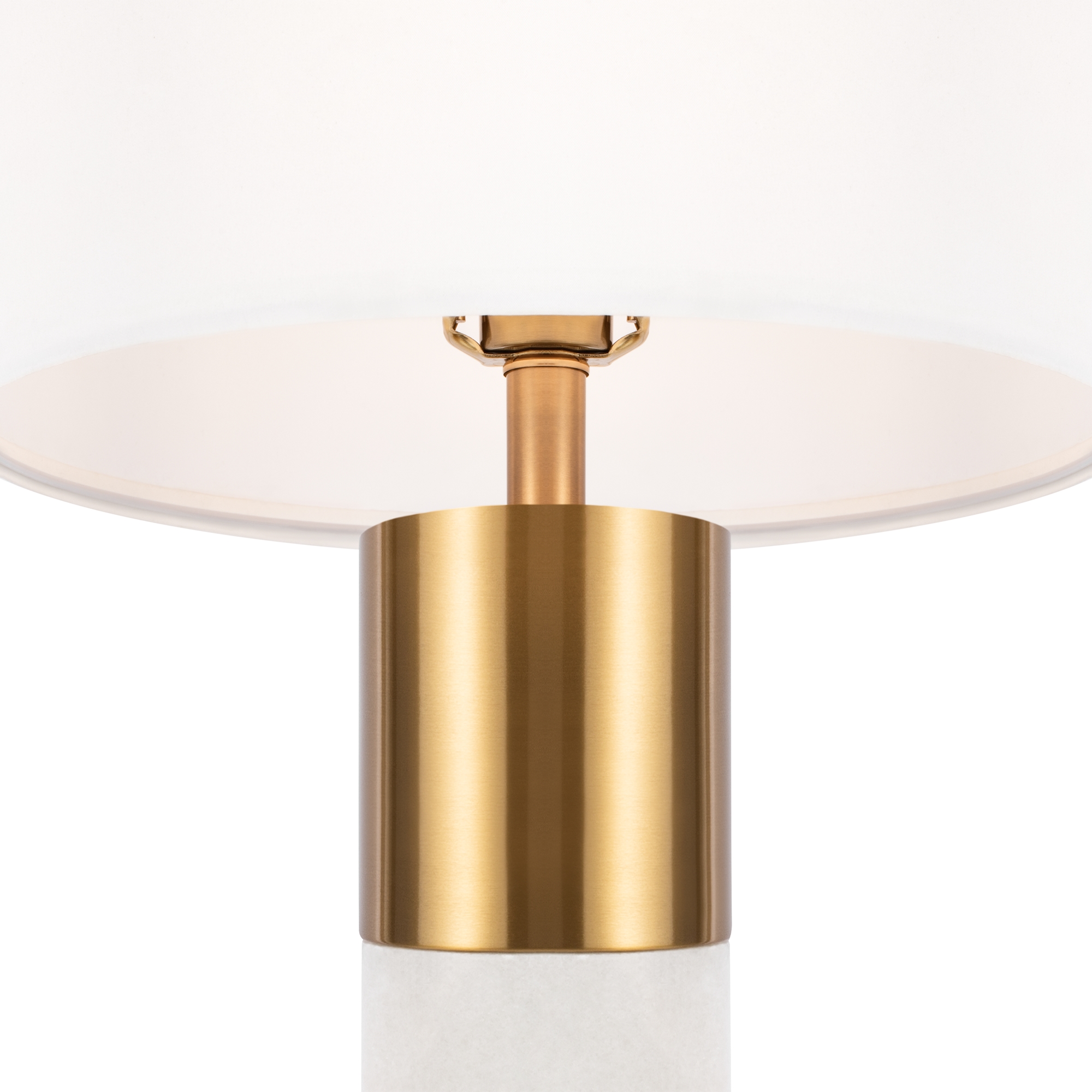Металлическая арматура, цвет – латунь. Абажур – белый хлопок. Изюминка дизайна – элементы из натурального камня (алебастра). Трендовый микс фактур. Лаконичные формы в американском стиле. Источник света - лампа с цоколем Е14.