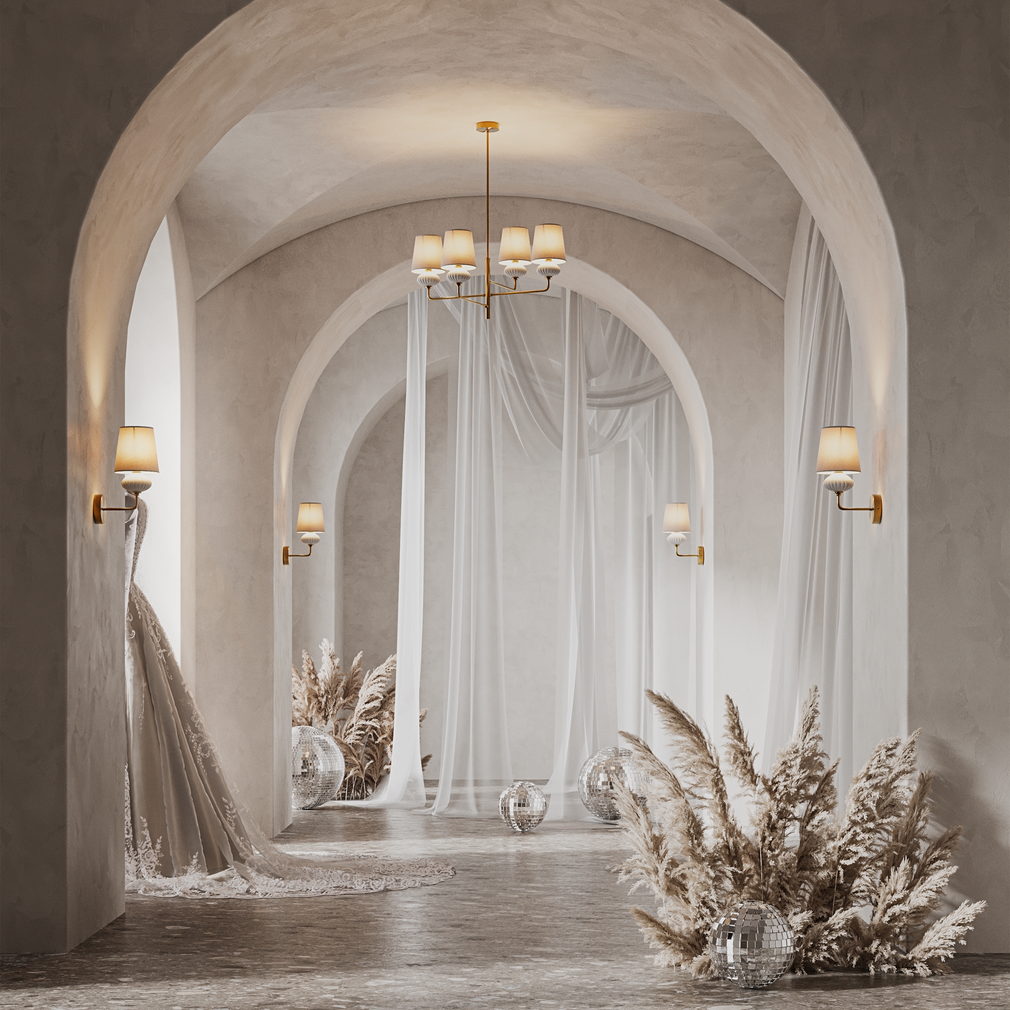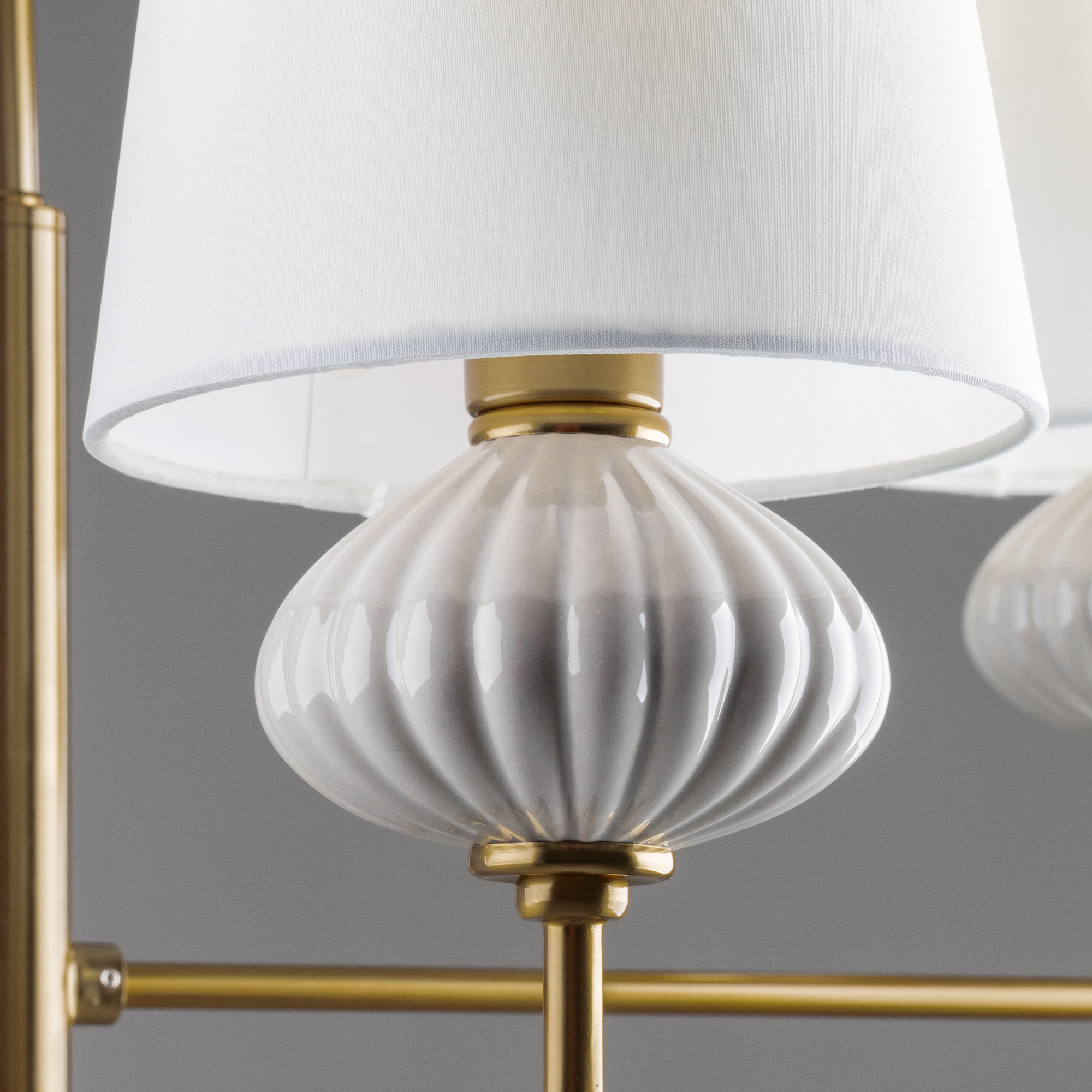 Металлическая арматура, цвет - латунь. Керамические декоративные элементы. Матовые белые абажуры. Силуэт светильника вытягивает интерьер. Источник света — лампа. Цоколь E14.